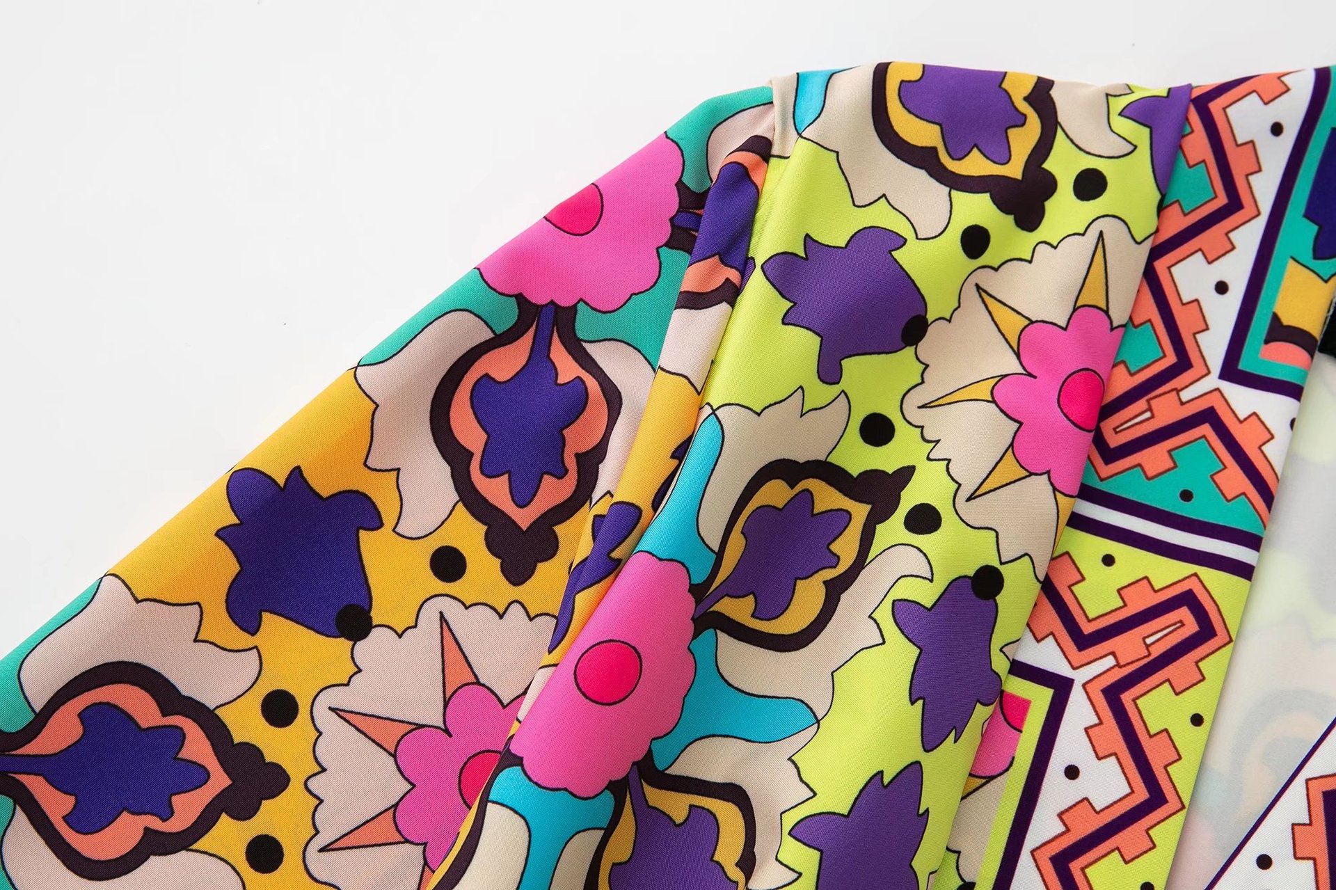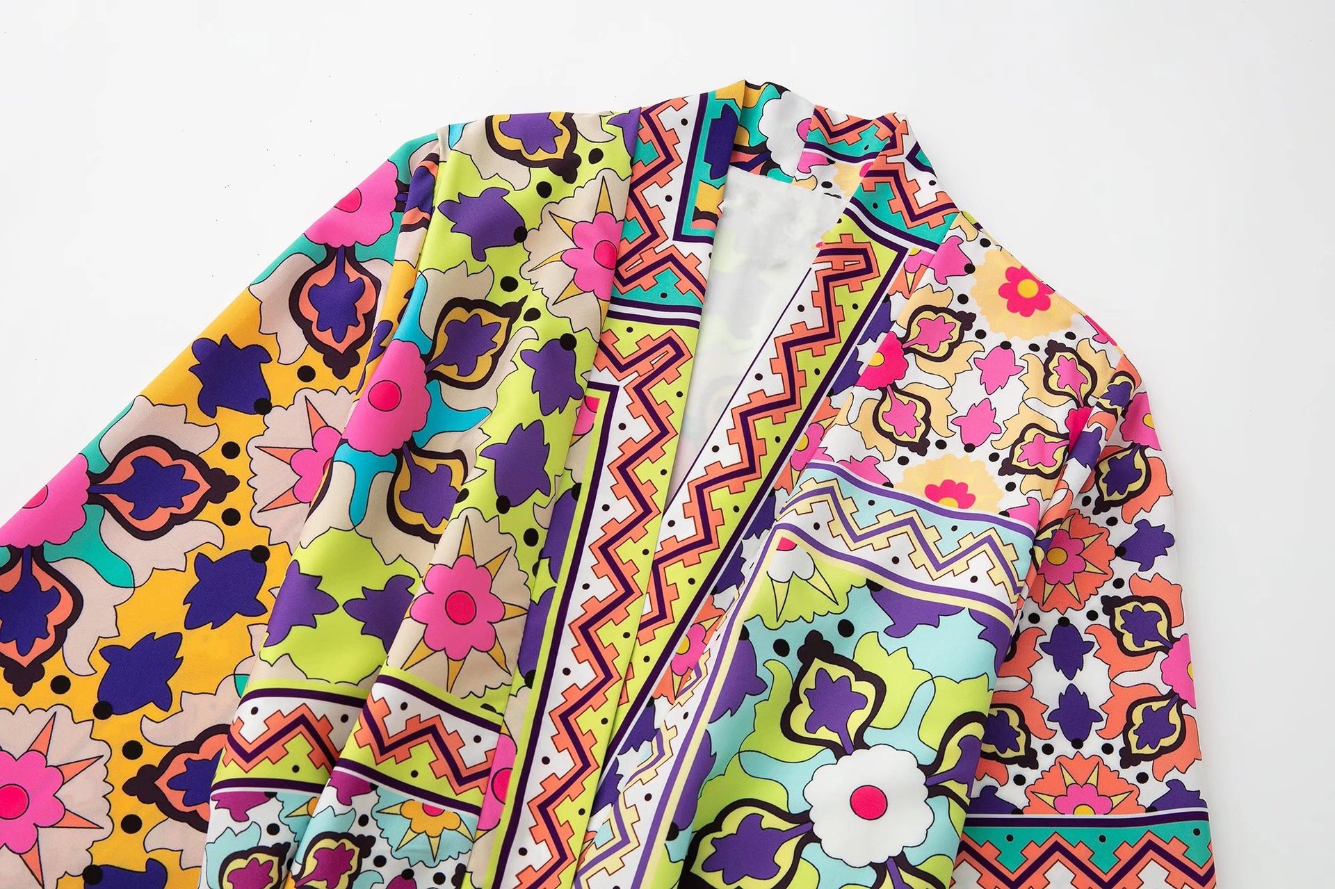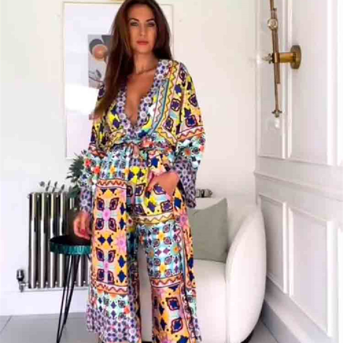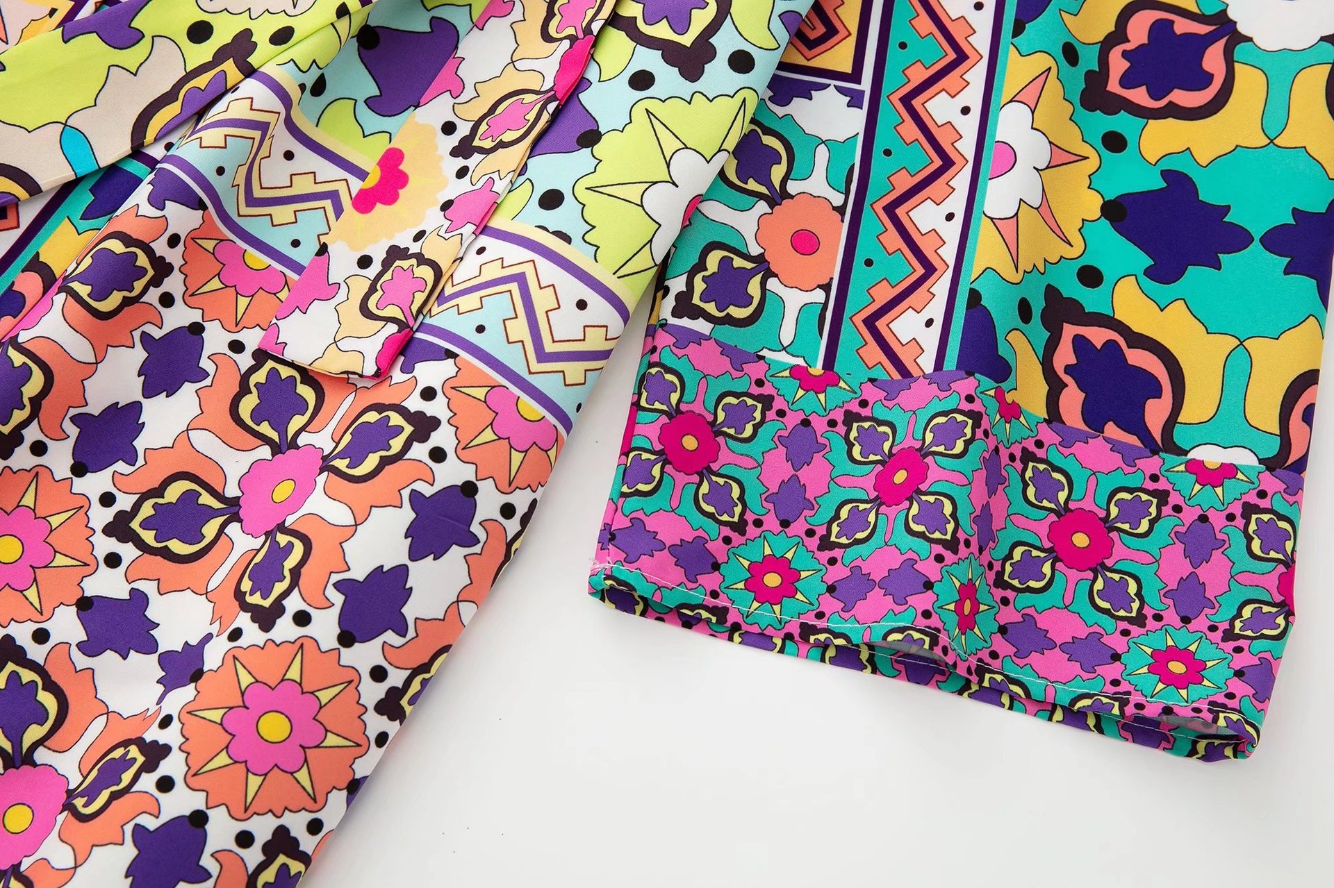 Color: printed coat, printed trousers