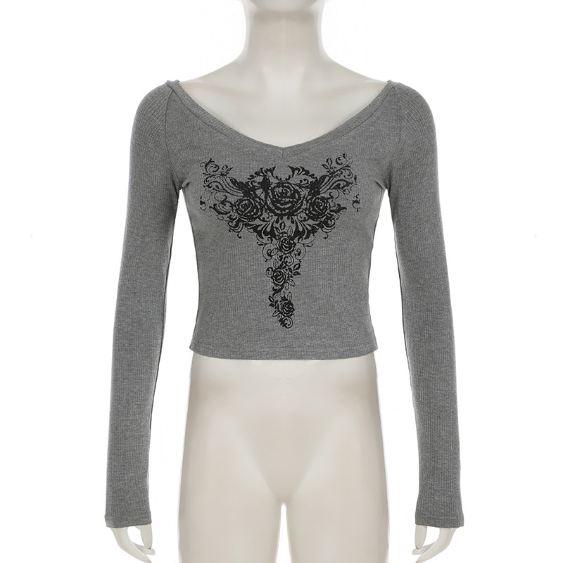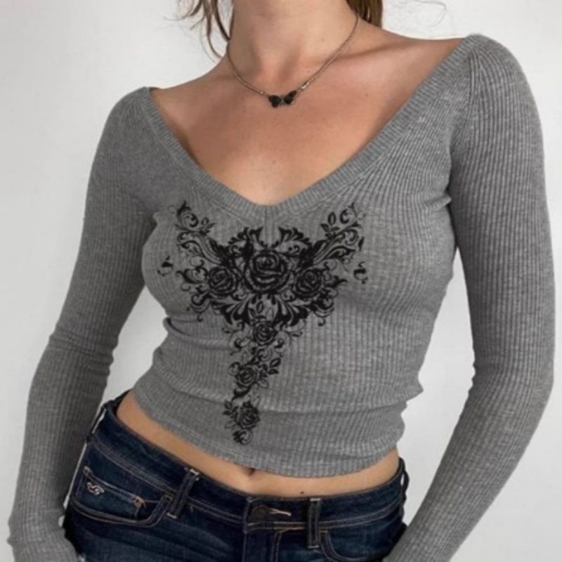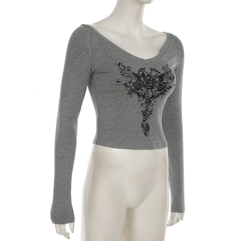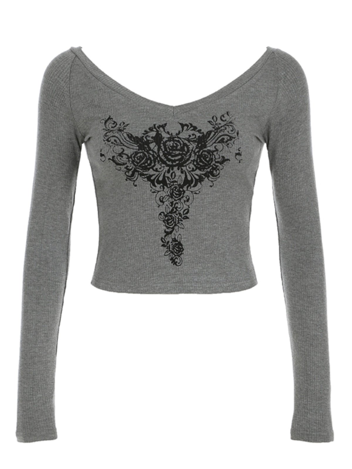 Printed Contrast-Color V-Neck Knitted Cropped Slim-Fit Long-Sleeve Top