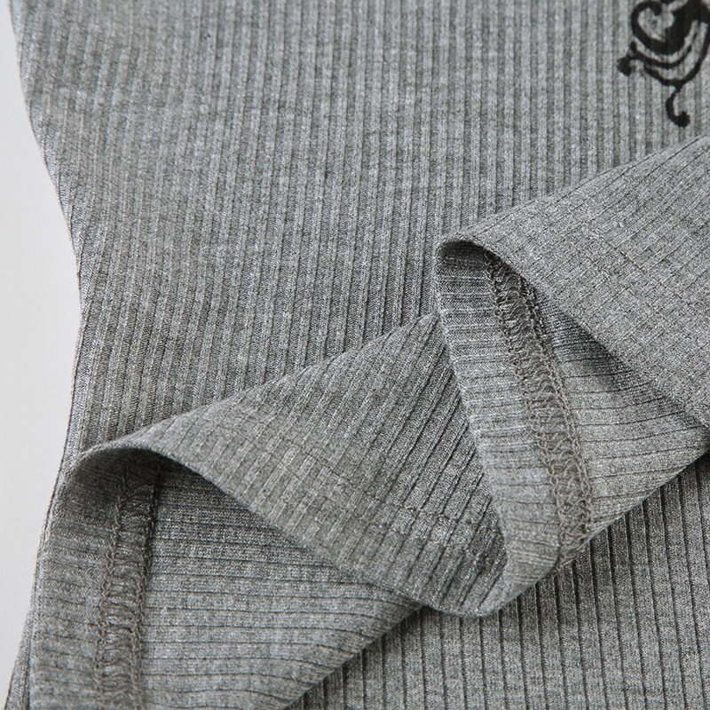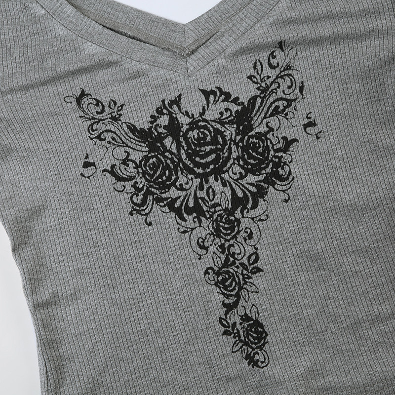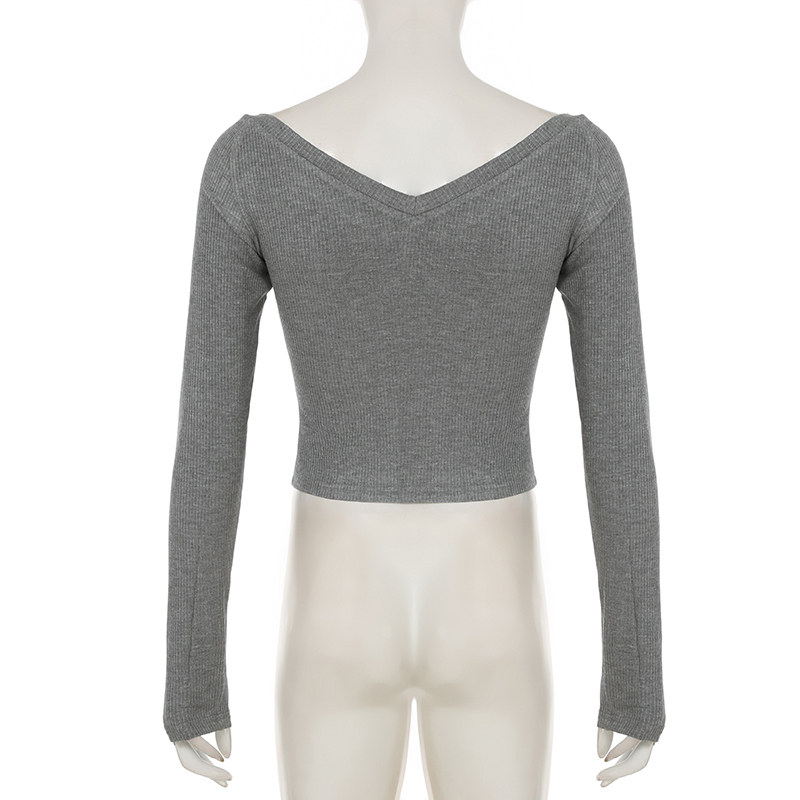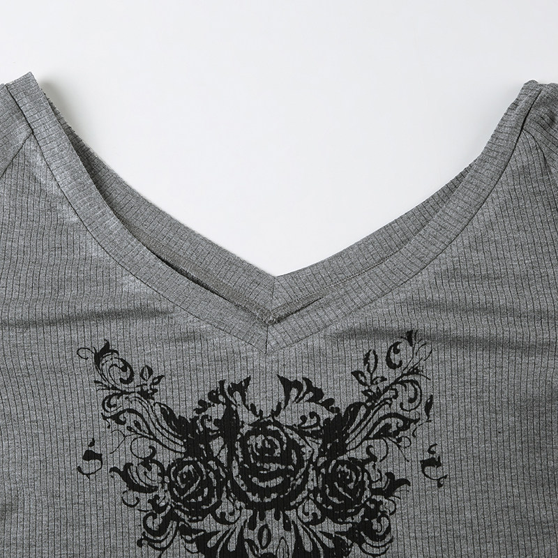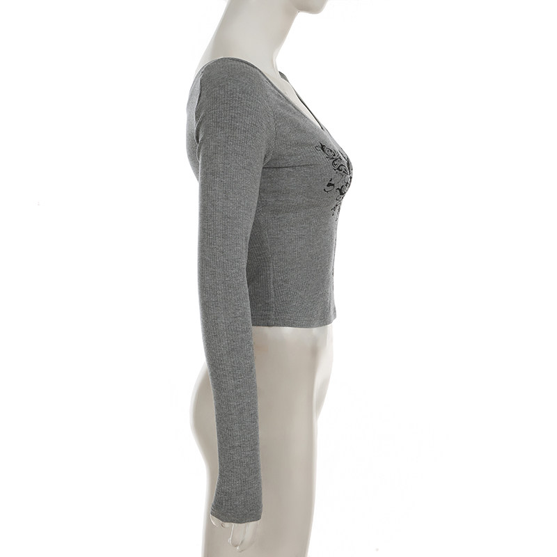 Printed Contrast-Color V-Neck Knitted Cropped Slim-Fit Long-Sleeve Top