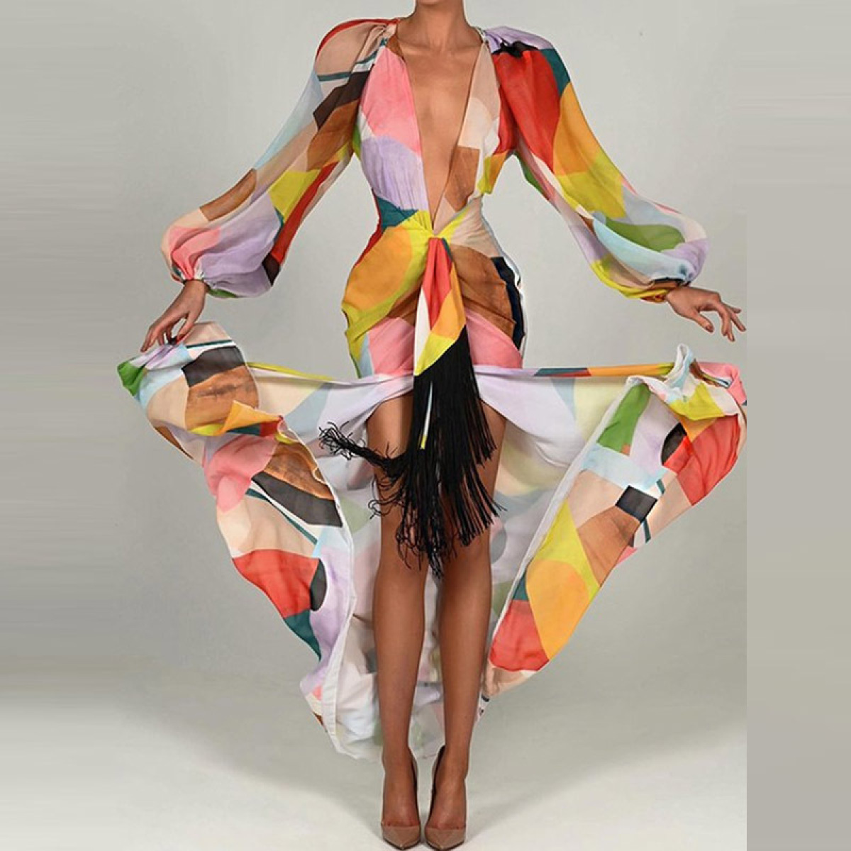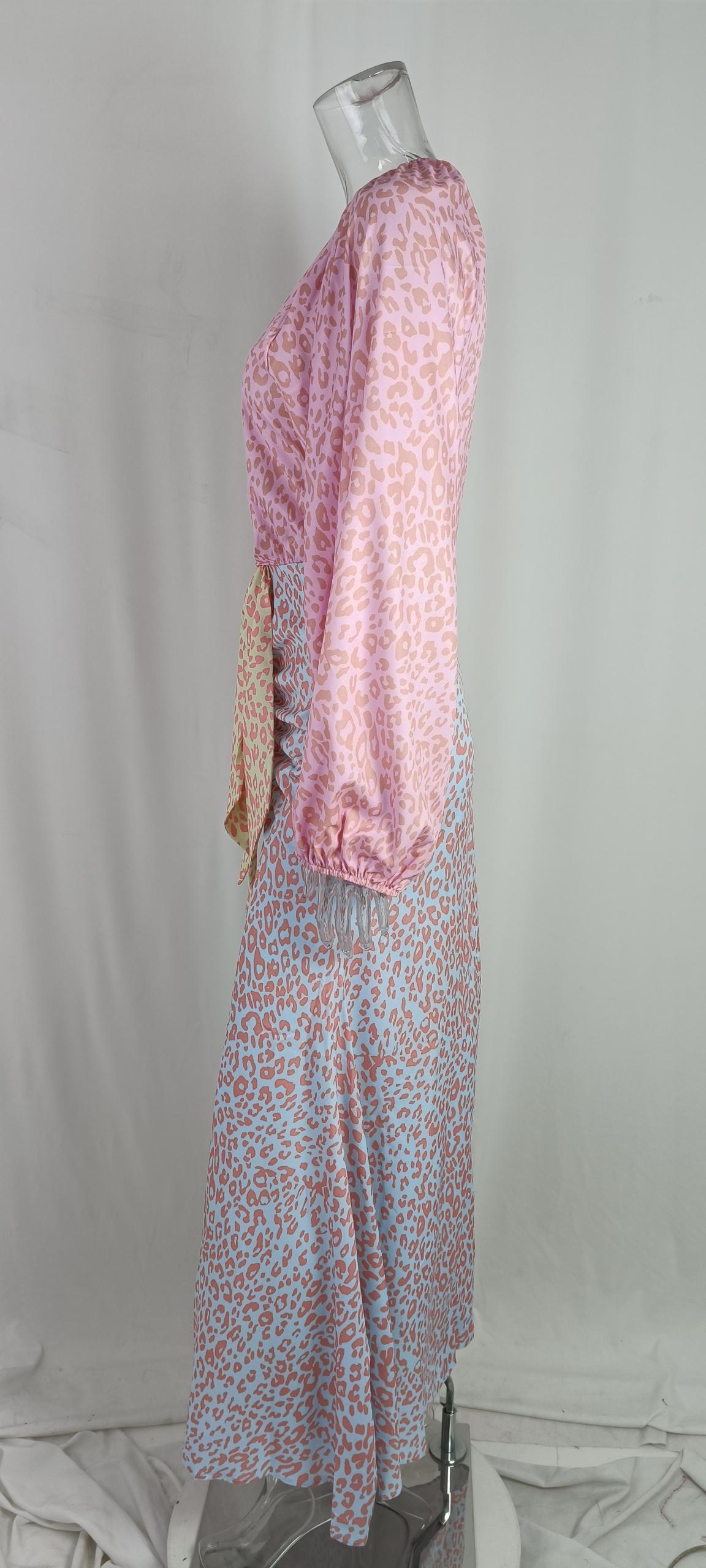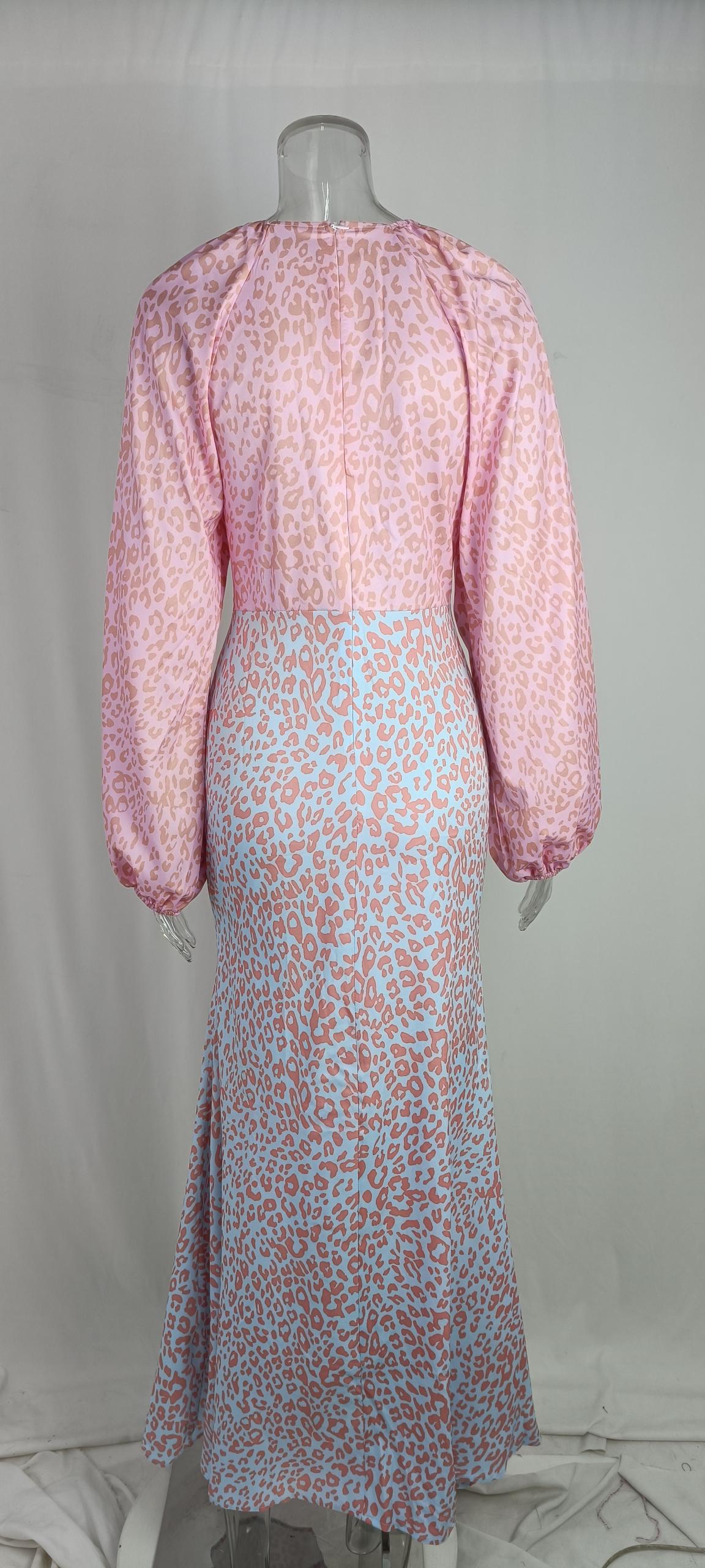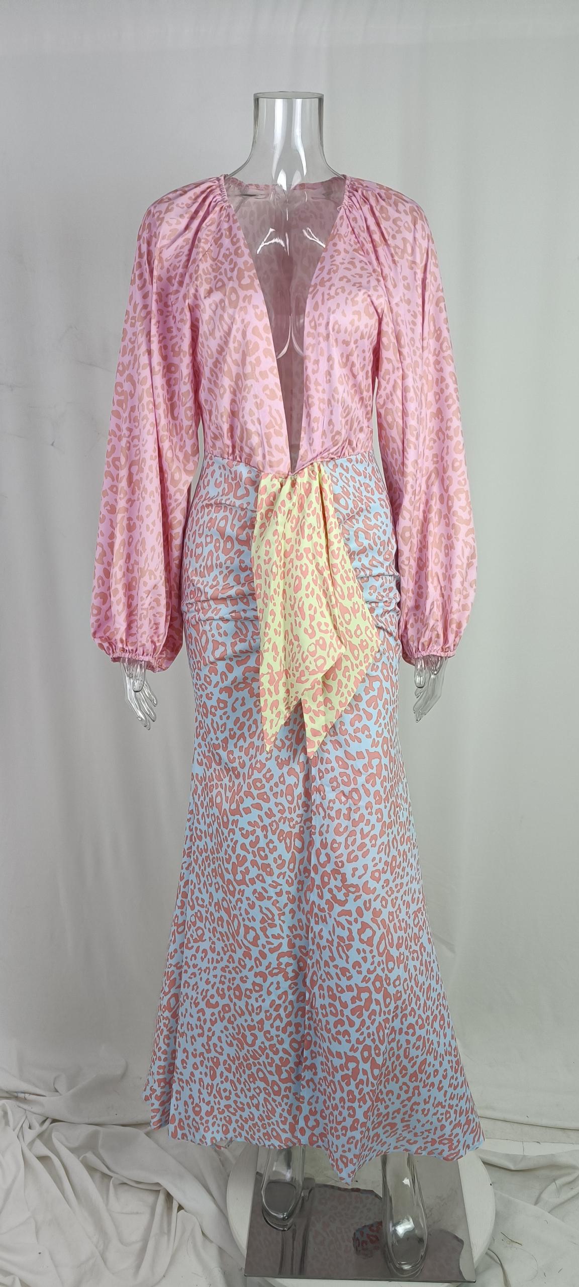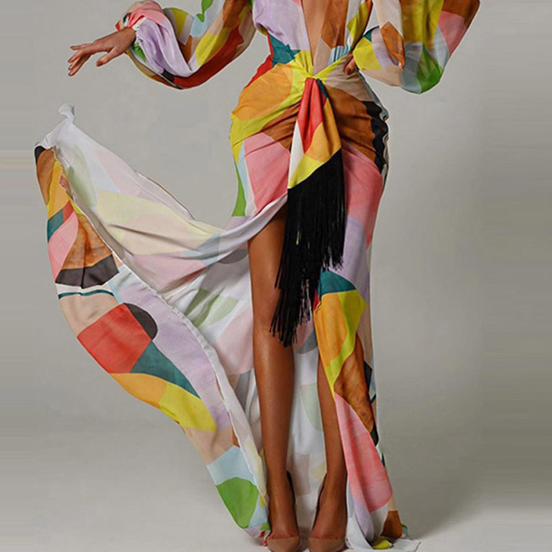 Printed Long-sleeved Deep V-neck Dress With Large Hem