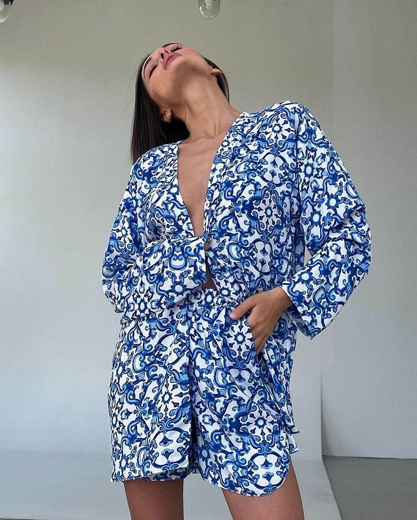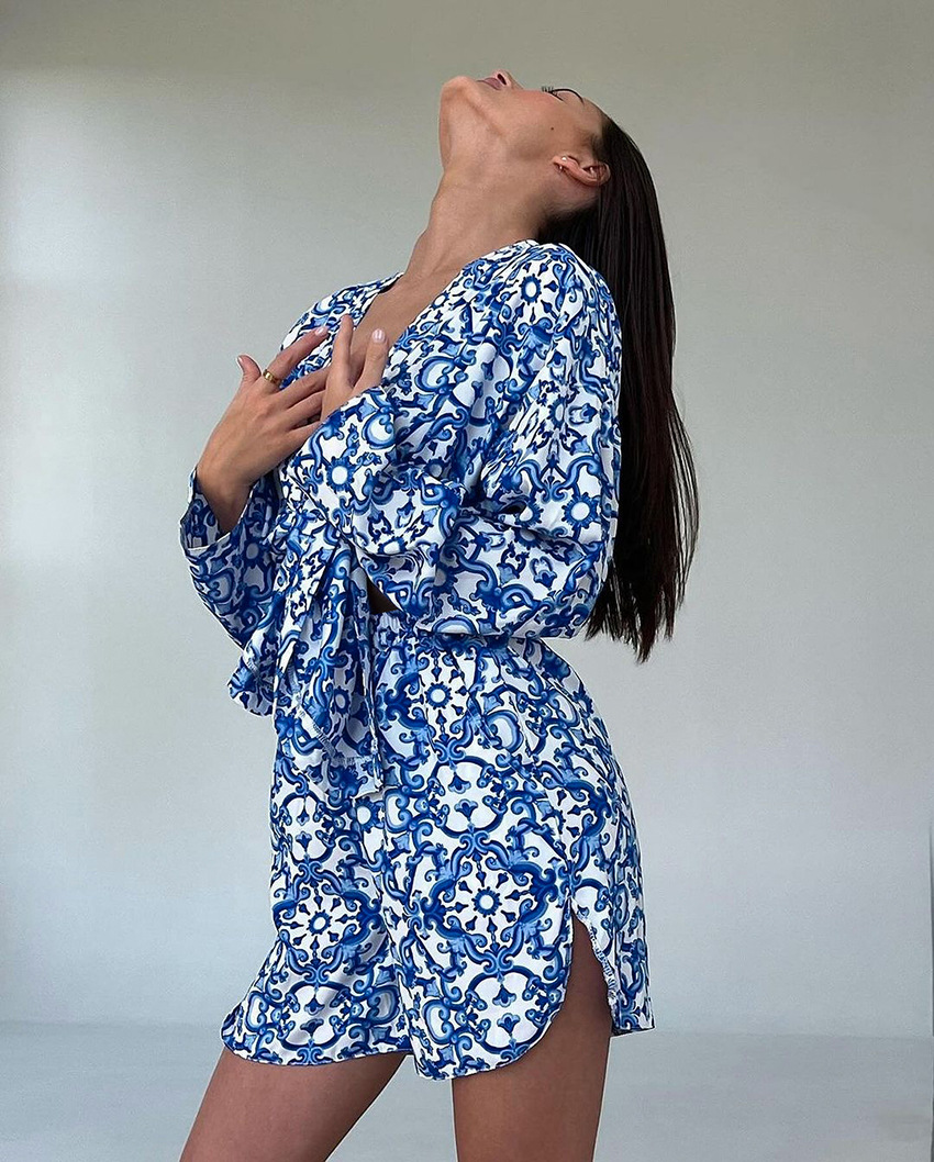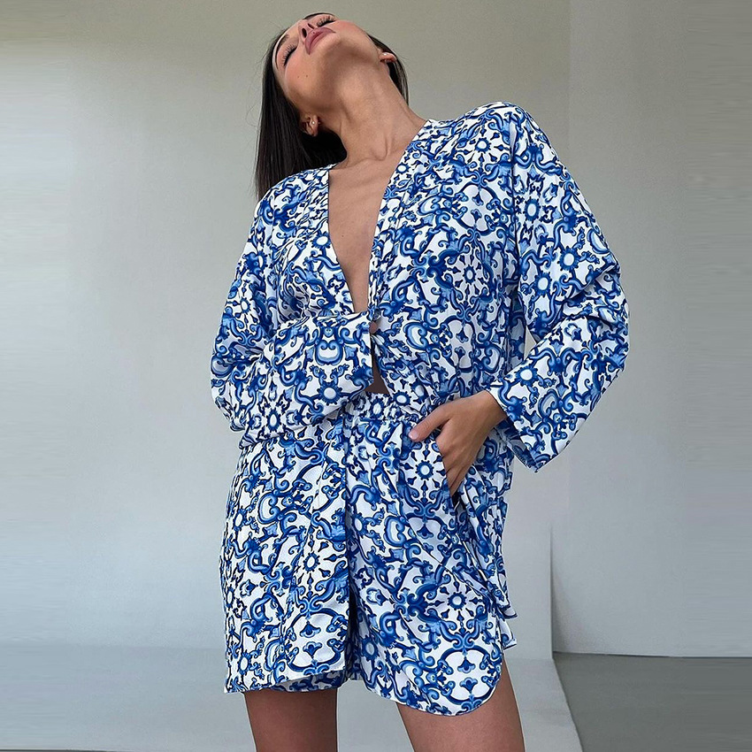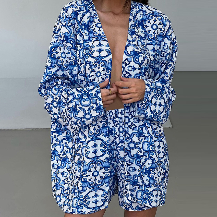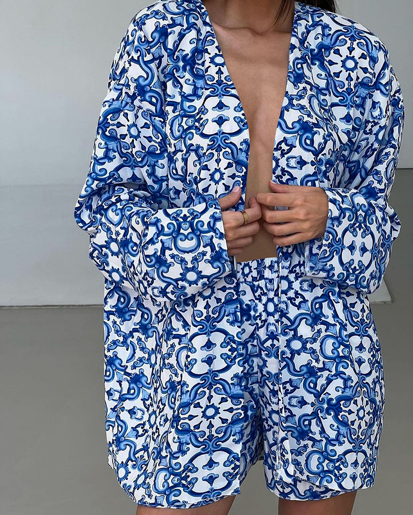 Printed Loose Cozy Long-Sleeve Shorts Pajama Set