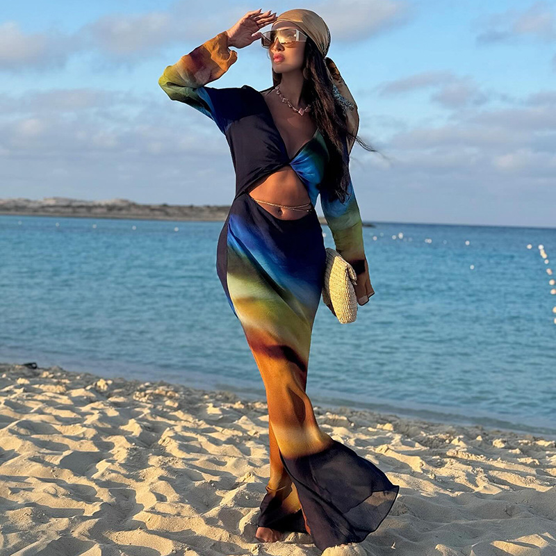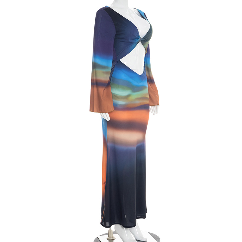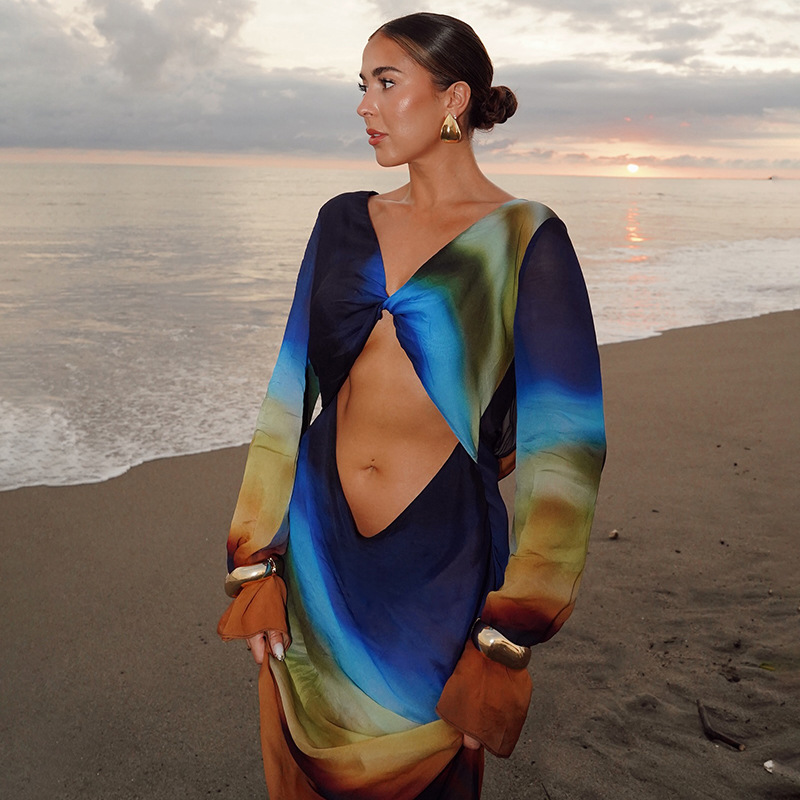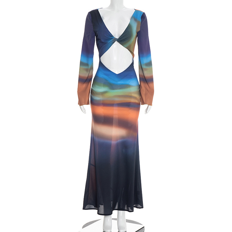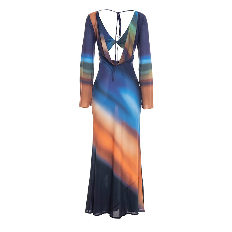Printed Mesh Long-Sleeve Maxi Dress With Open Back And Tie Details For Women