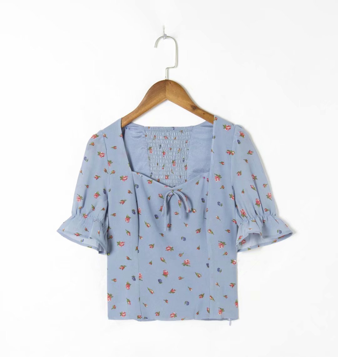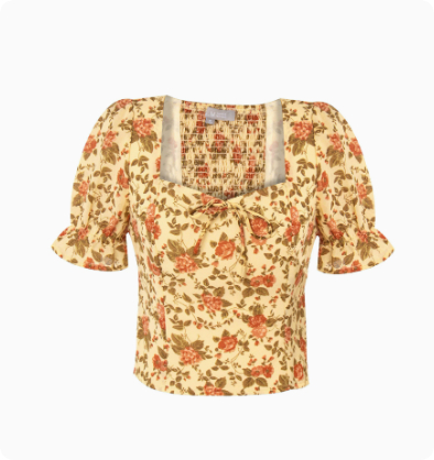 Printed Regal-style Square-neck Tie-front Slim-fit Short-sleeve Shirt