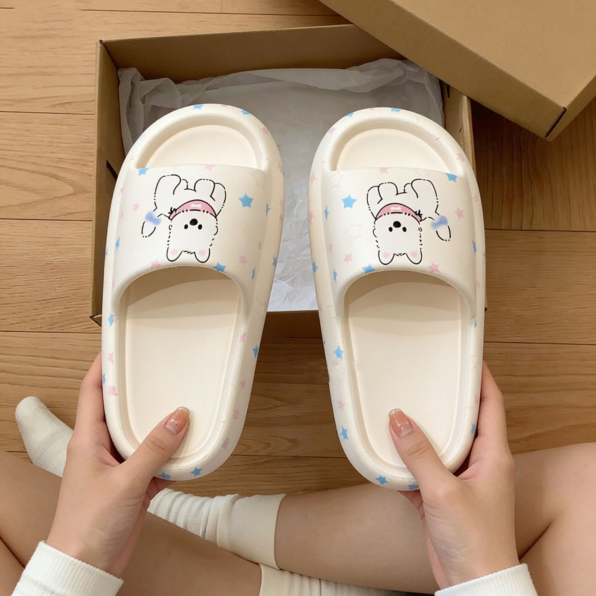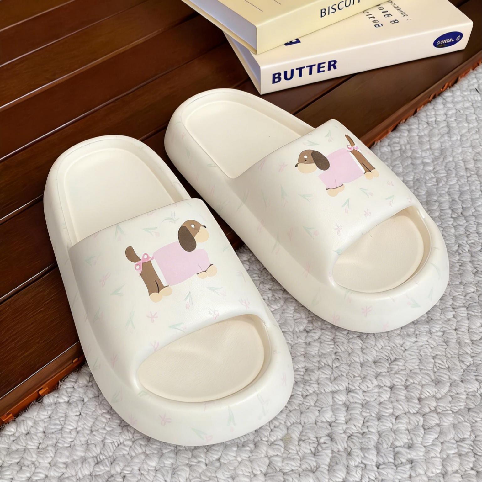Colors: Pink Dachshund — EVA wear-resistant sole — soft and chewy feel; Stars — soft sole — no chafing; Hot Dog — EVA flat sole — no chafing; Polka-Dot Black Cat — EVA material — no chafing; Puppy — soft sole — no chafing; Baby’s Breath — lightweight and comfortable — soft sole, no chafing.