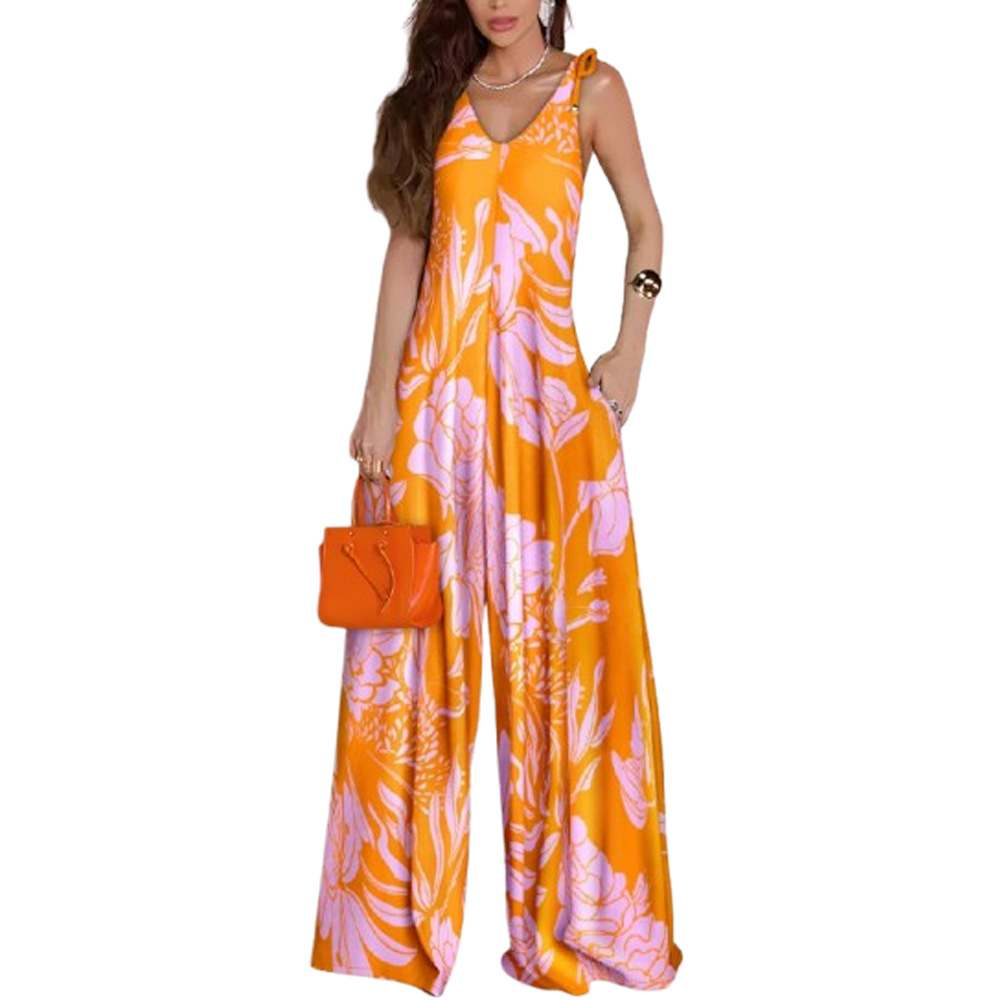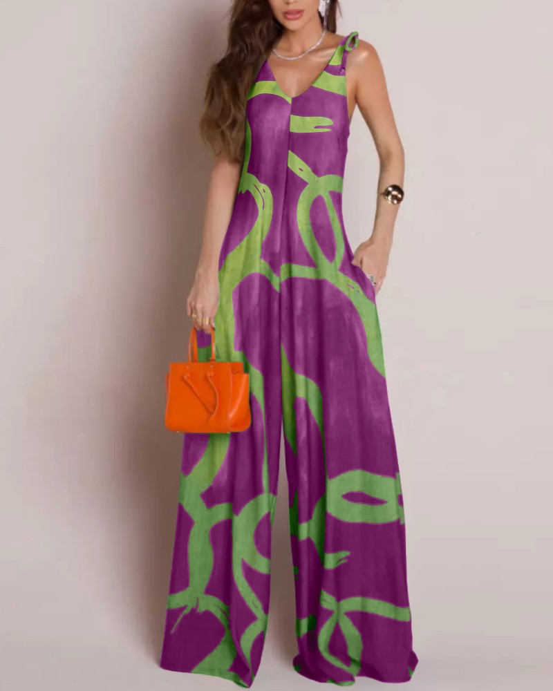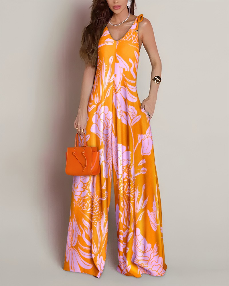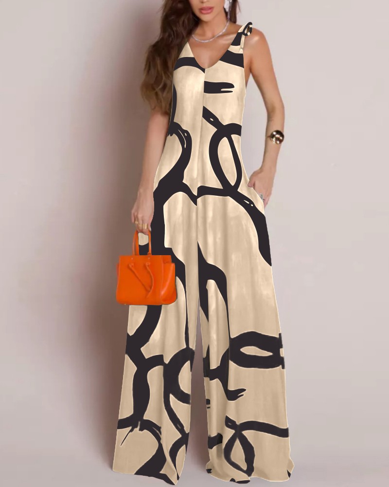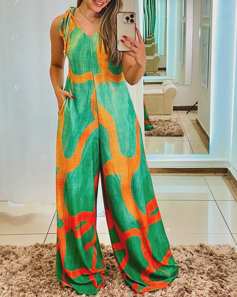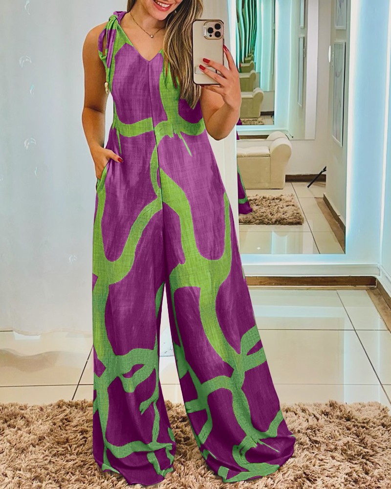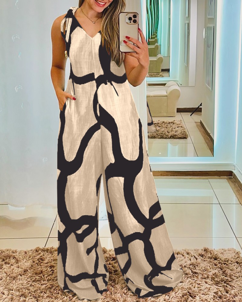 Printed V-neck Lace-up Jumpsuit Pocketed Vest-style Wide-leg Romper