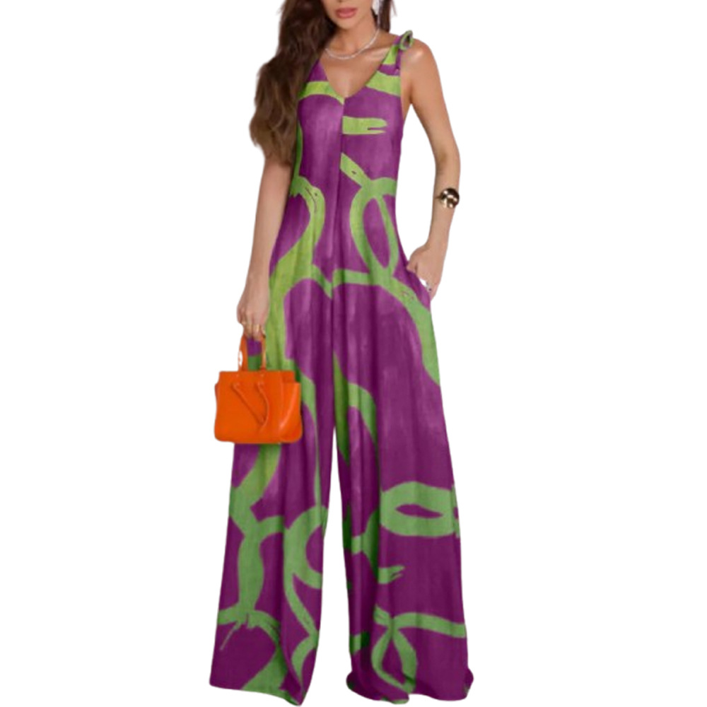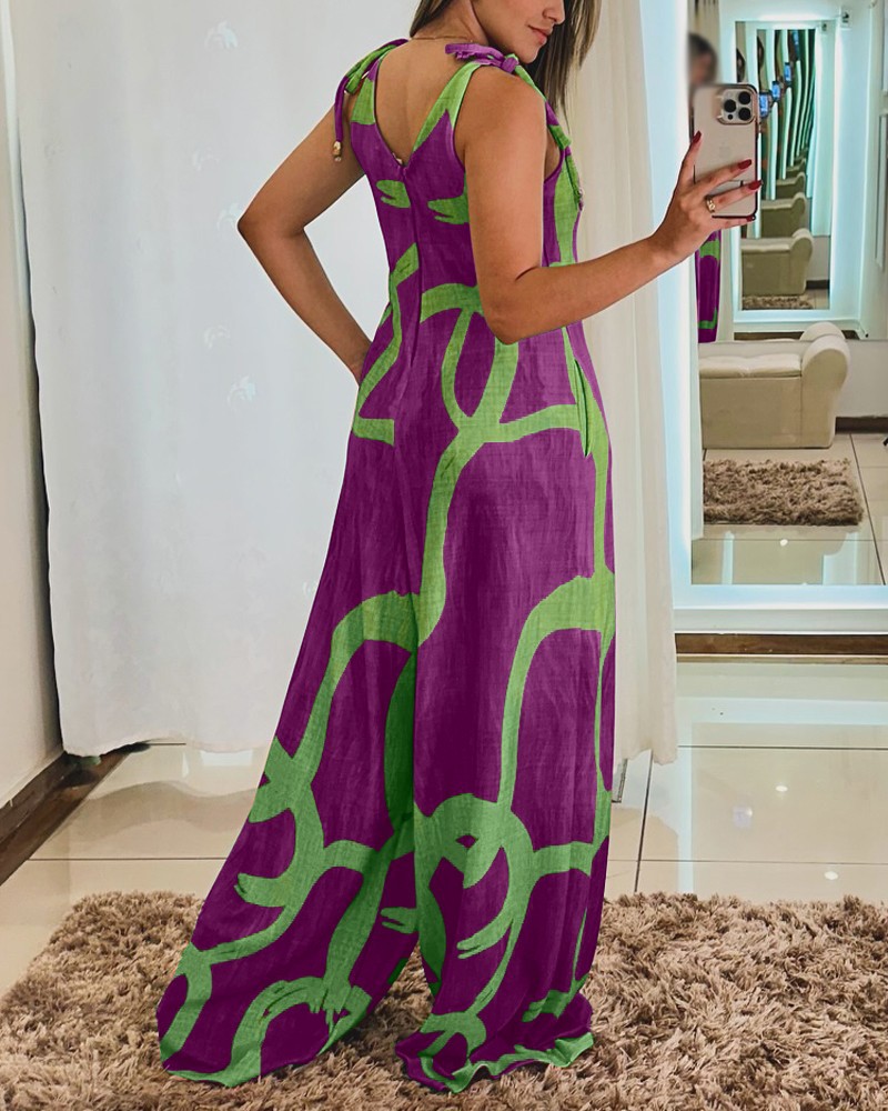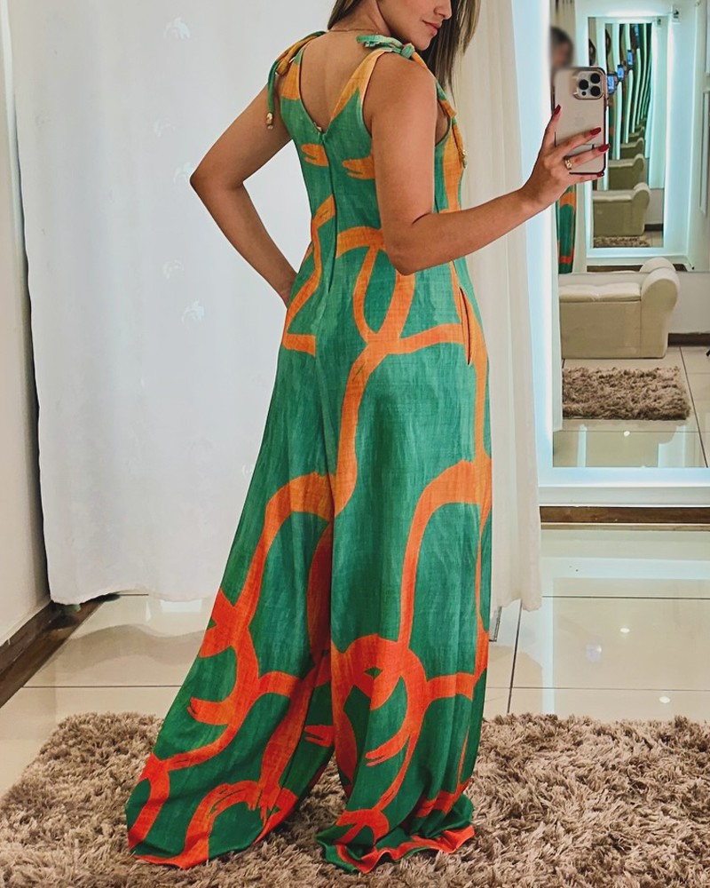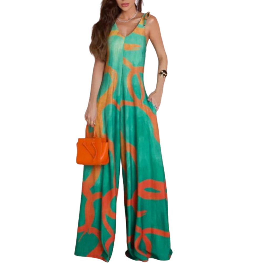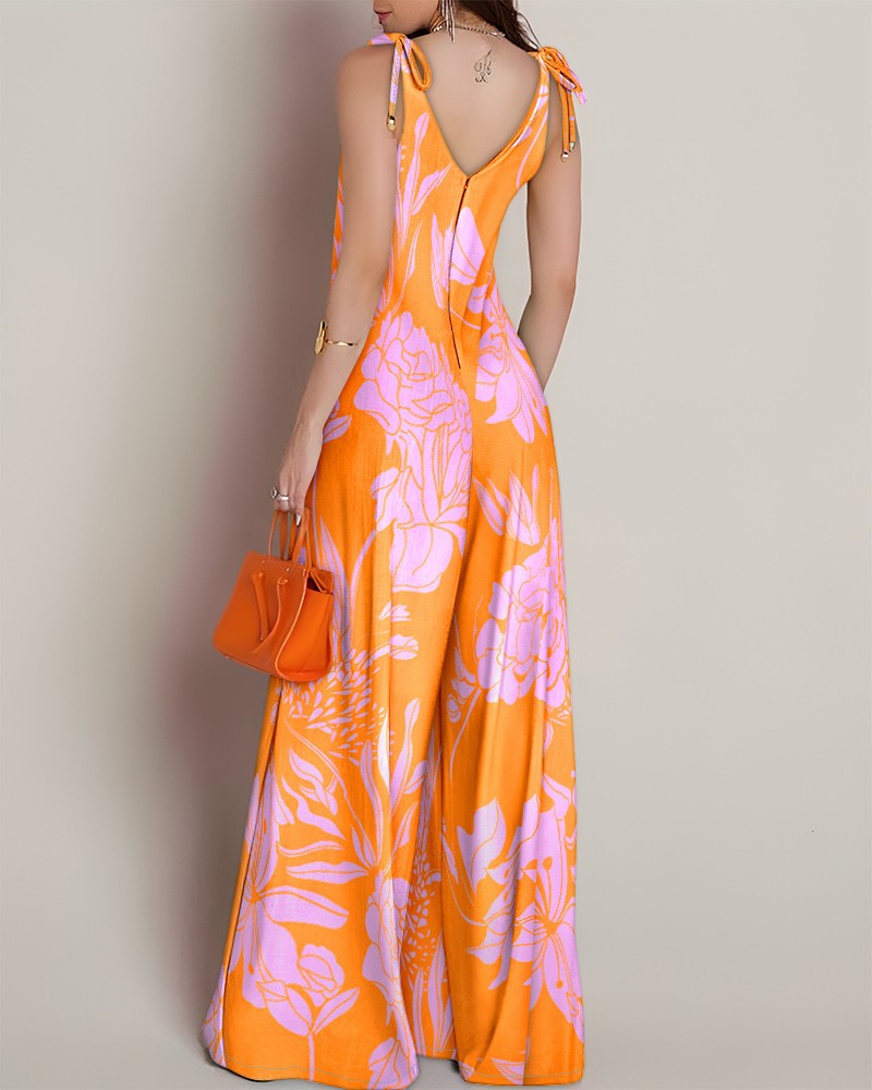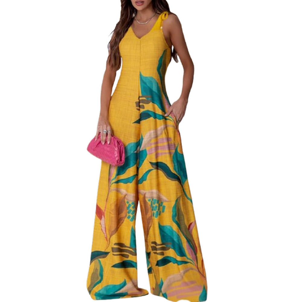 Printed V-neck Lace-up Jumpsuit Pocketed Vest-style Wide-leg Romper