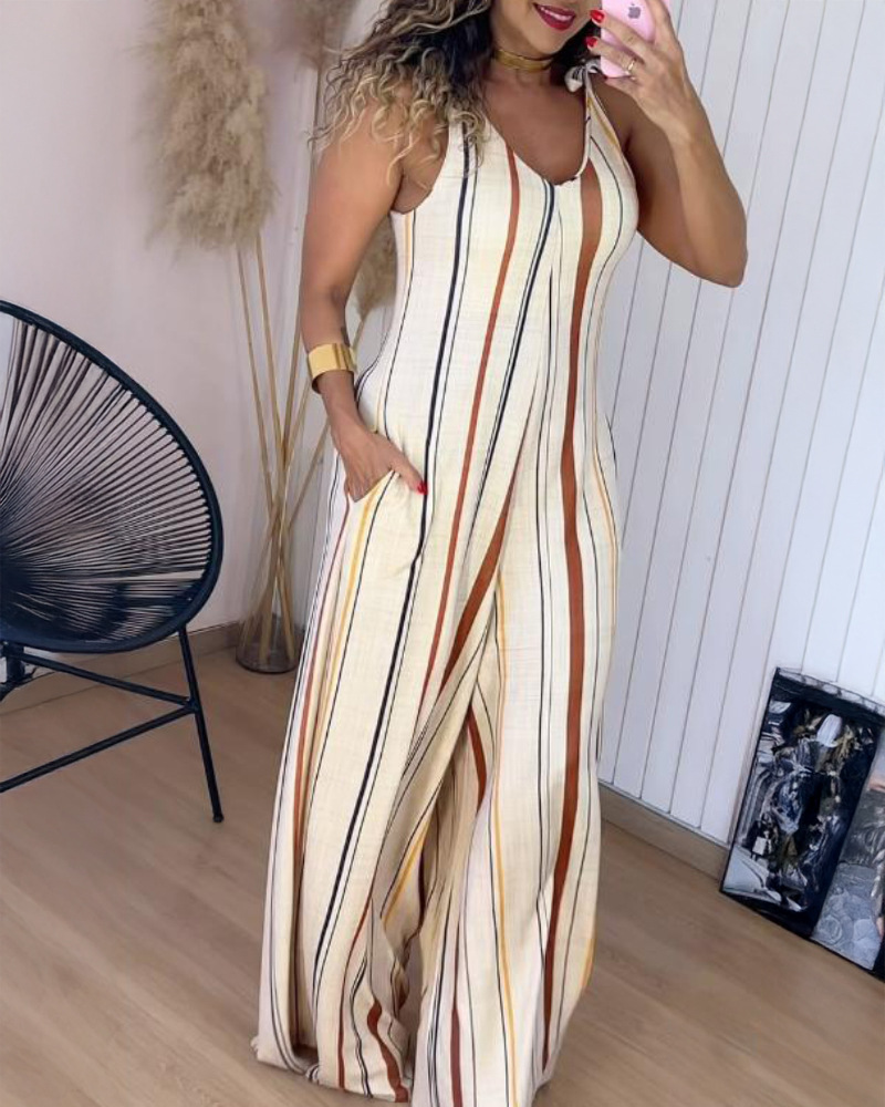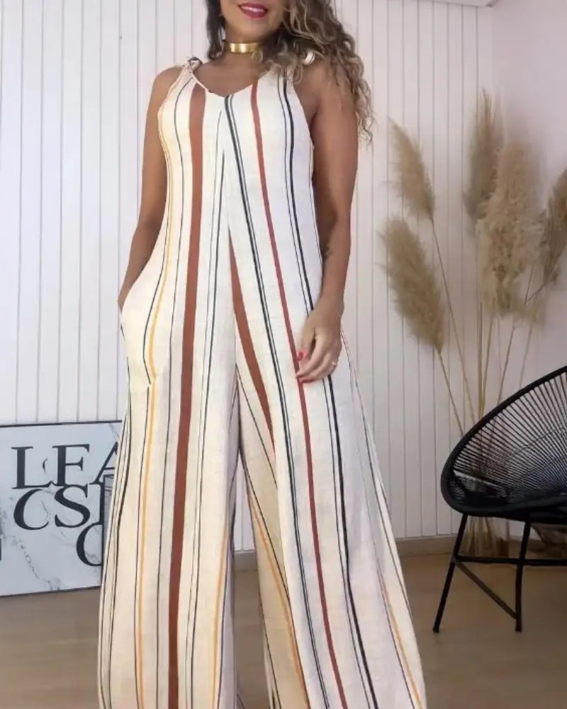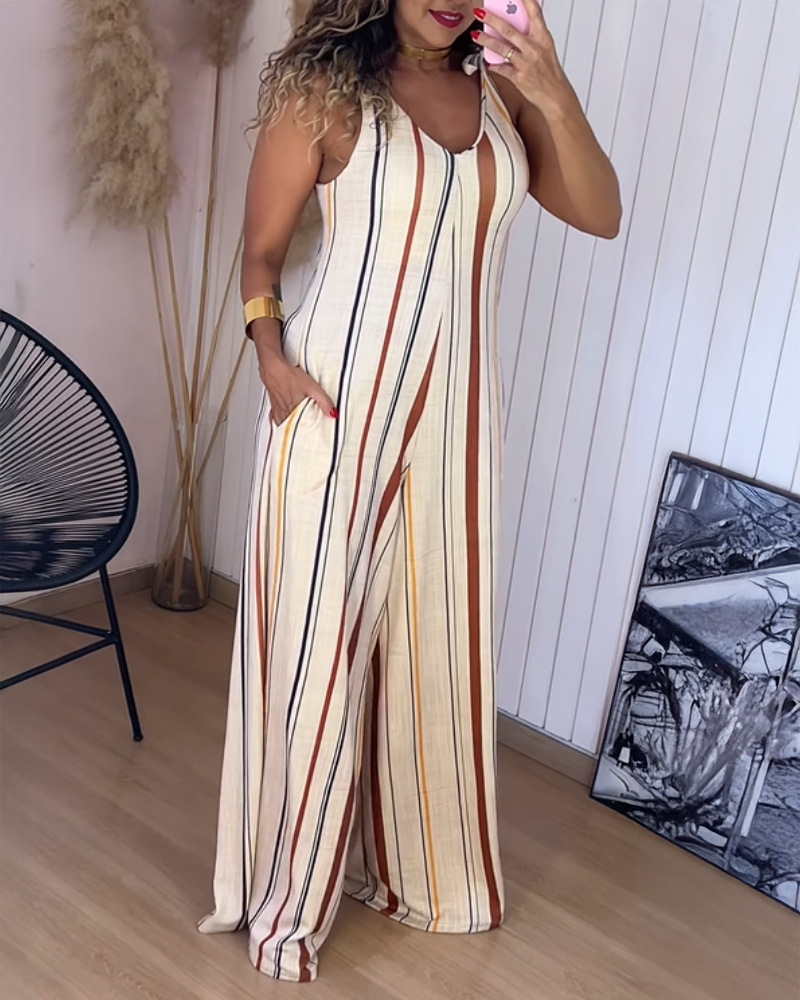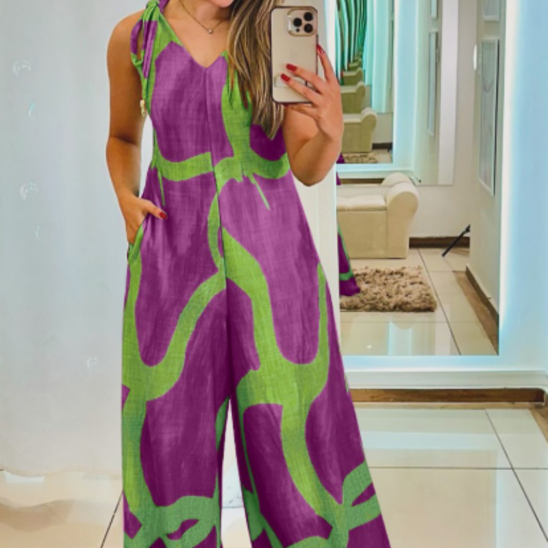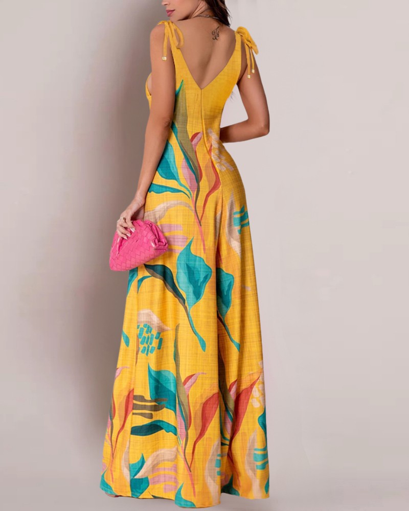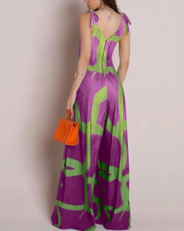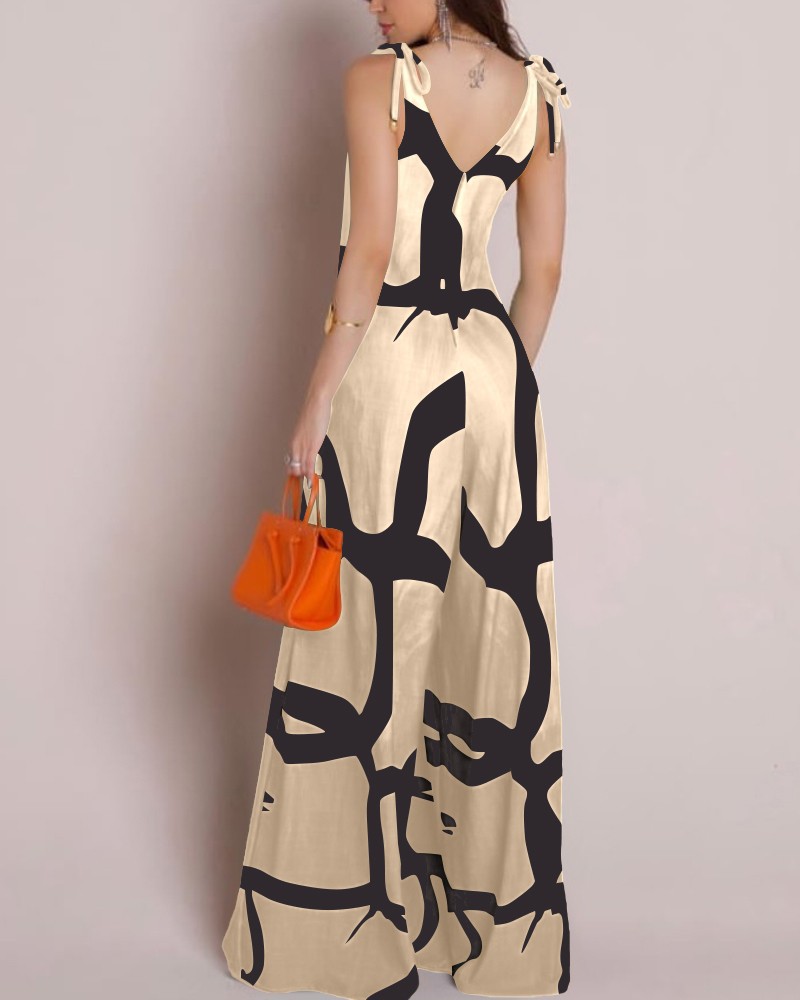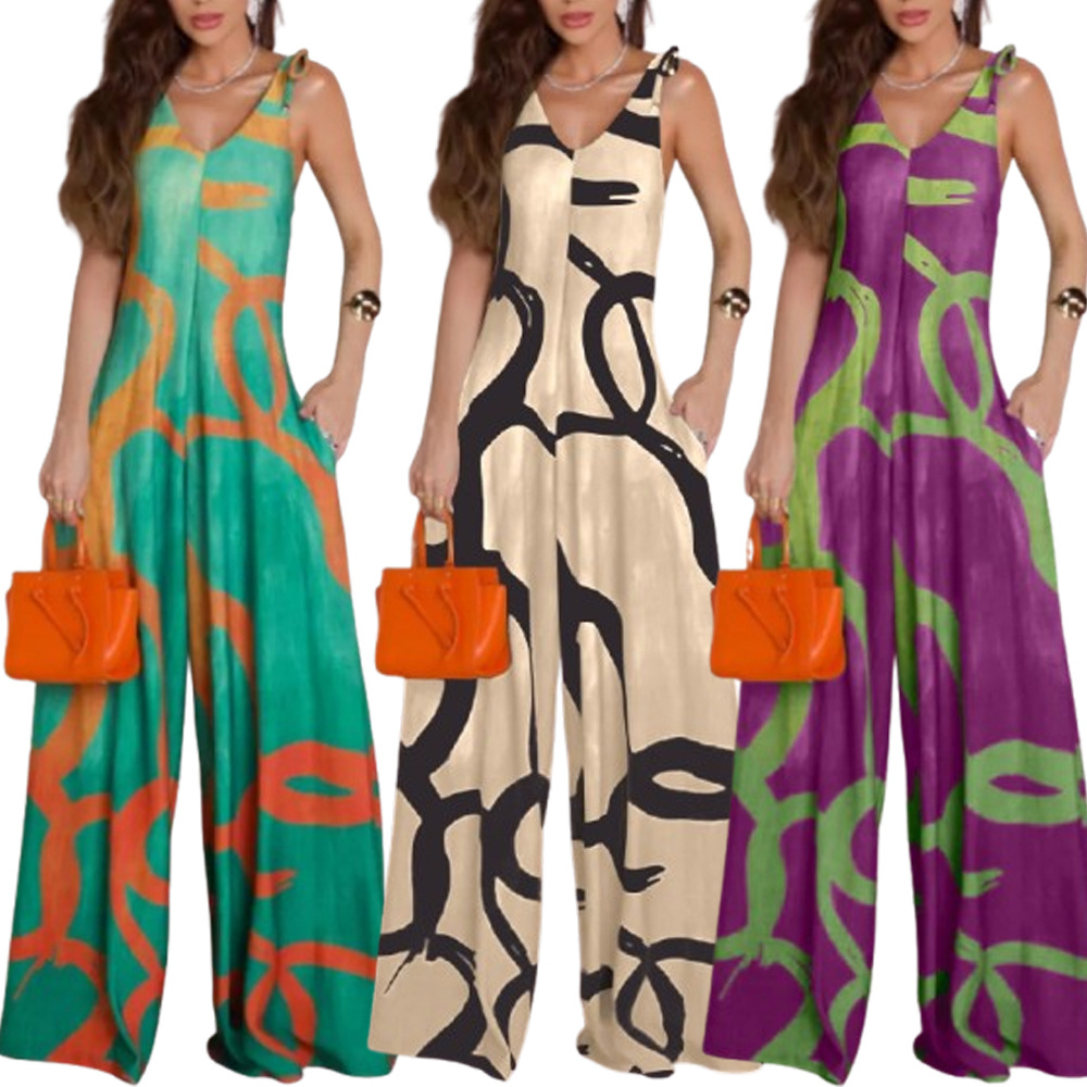 Printed V-neck Lace-up Jumpsuit Pocketed Vest-style Wide-leg Romper
