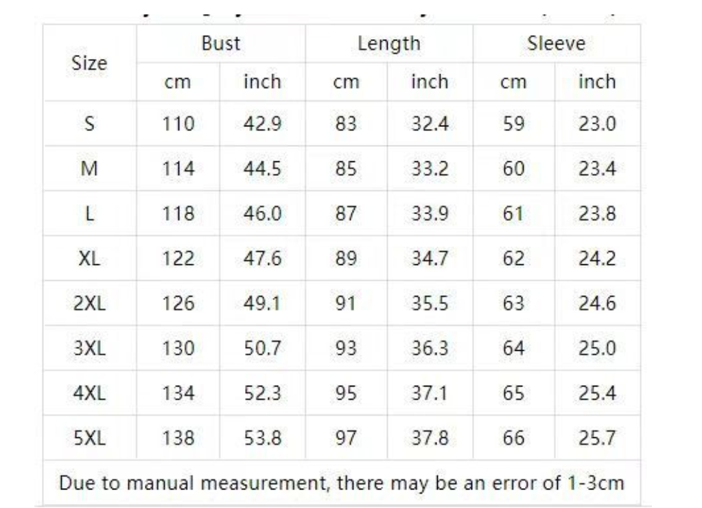 Dimensions: S,M,L,XL,XXL,XXXL,4XL,5XL,6XL.