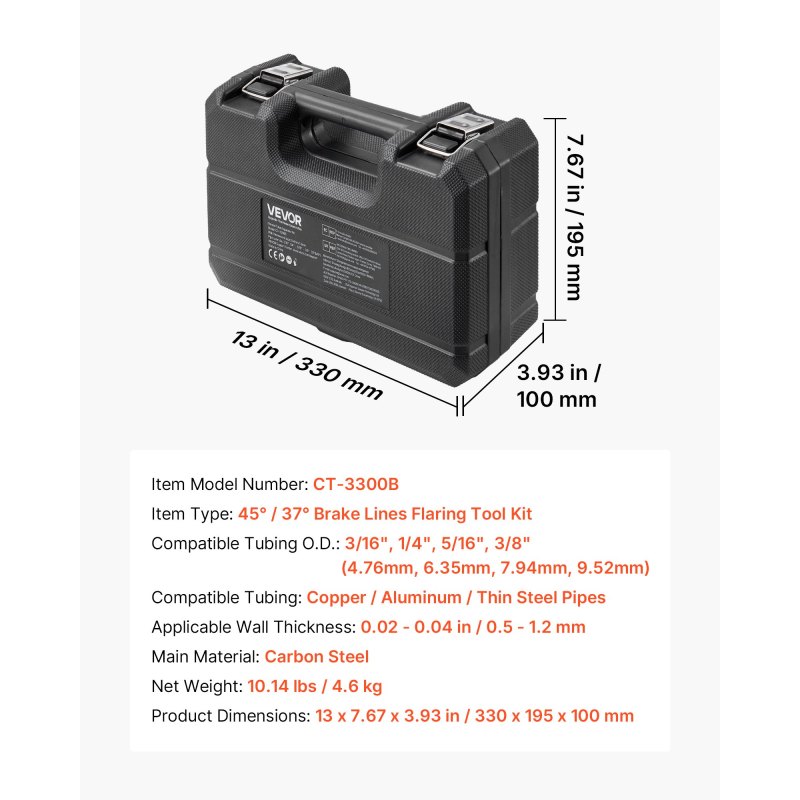 Precise & Reliable Flares: This 45° & 37°professional brake line flaring tool kit includes 4 die sets for 3/16", 1/4", 5/16", 3/8" copper, aluminum, and thin steel tubing (0.02"–0.04" wall thickness). Forms consistent, leak-free flares for tight seals and secure line connections