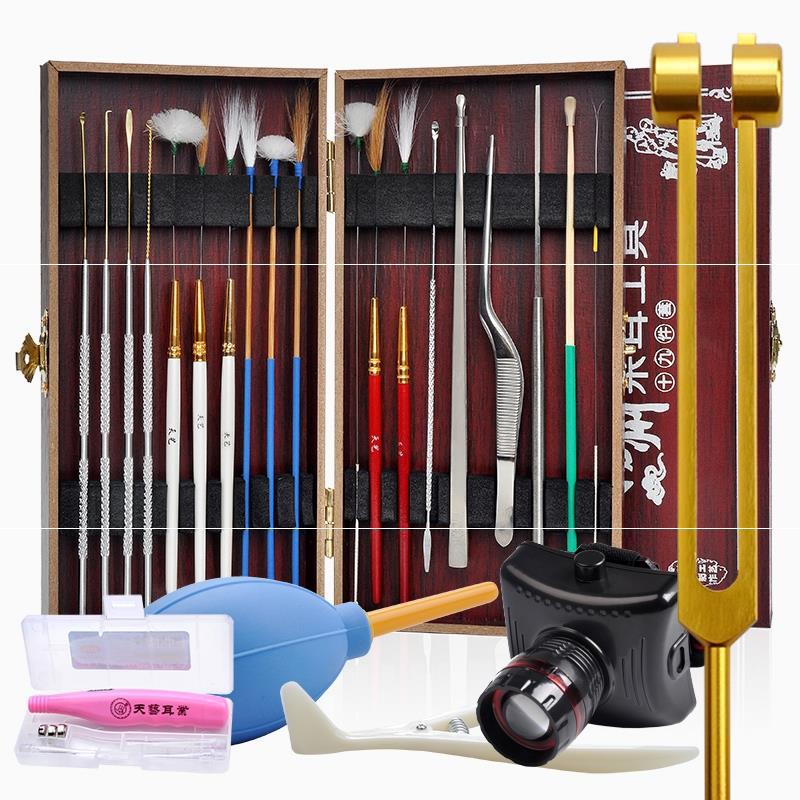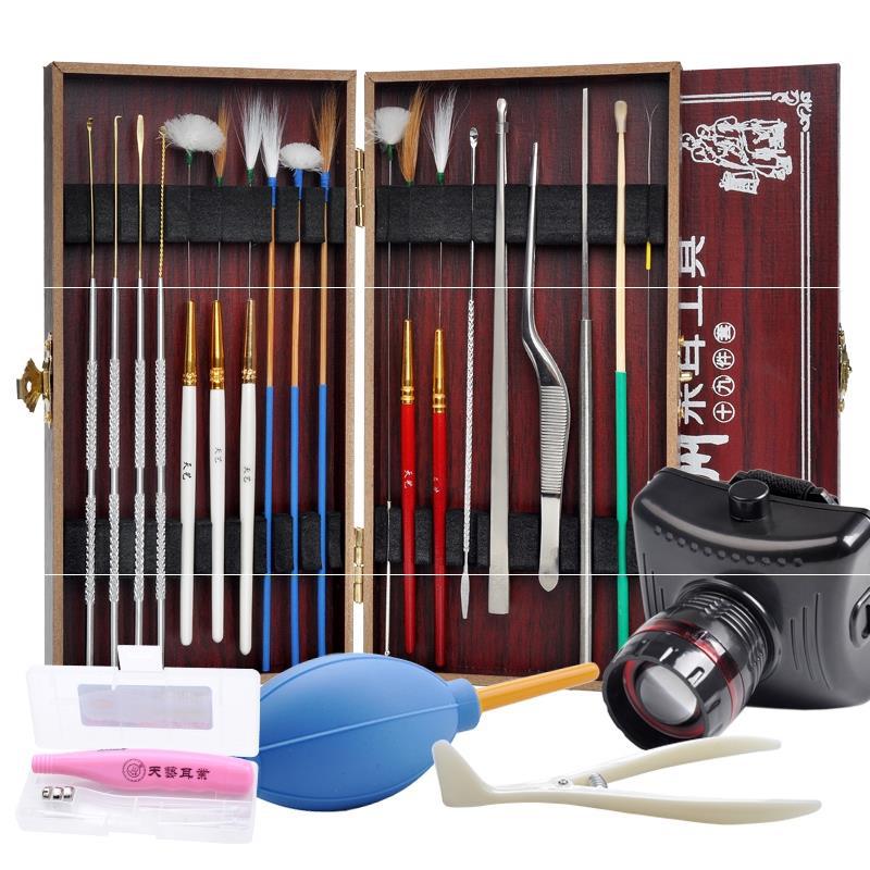 B: 19 pieces of wood grain ear pick + luminous ear pick + ear blower + ear expander + rechargeable headlight,