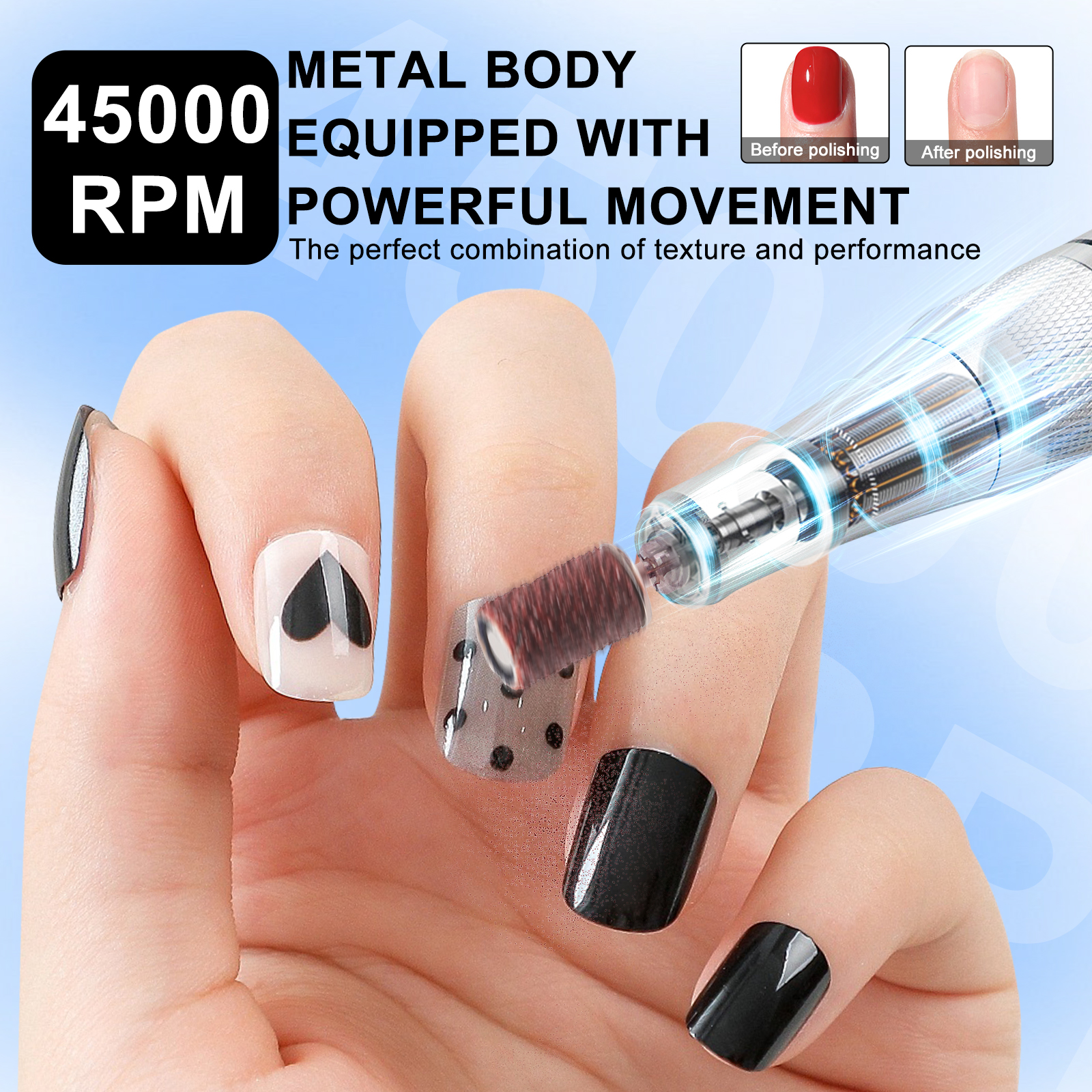 • 45000RPM Powerful Upgrade Motor:This electric nail drill is equipped with a powerful motor,which is adjustable from 0 to 45000RPM by turning the speed control knob.professional nail salon use and DIY your nails at home,enjoy nail beauty with your friends.