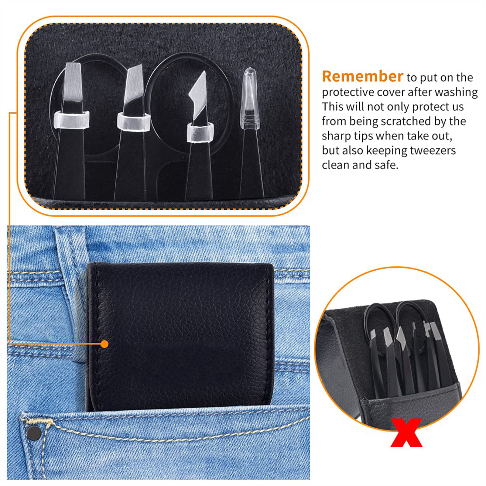 The leather case integrally protects the eyebrow tweezers, and each eyebrow tweezer has a head protective cover, which protects the eyebrow tips