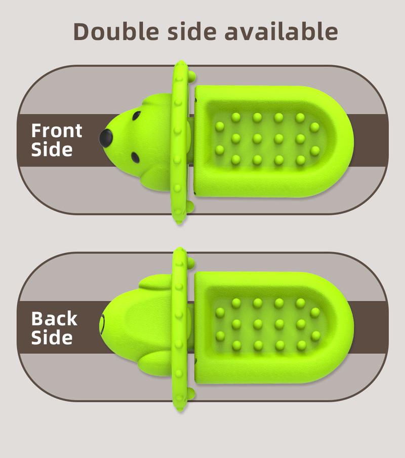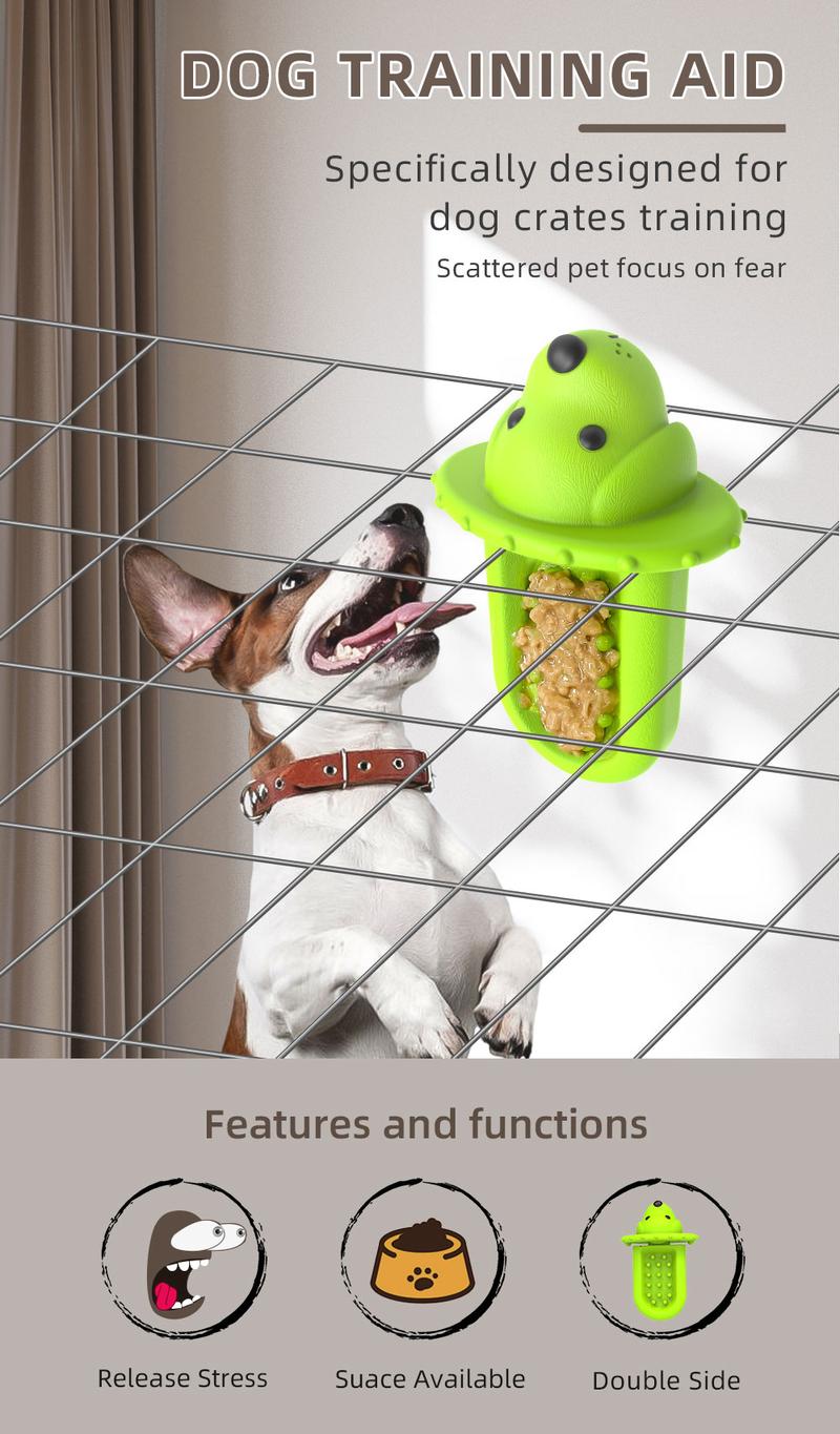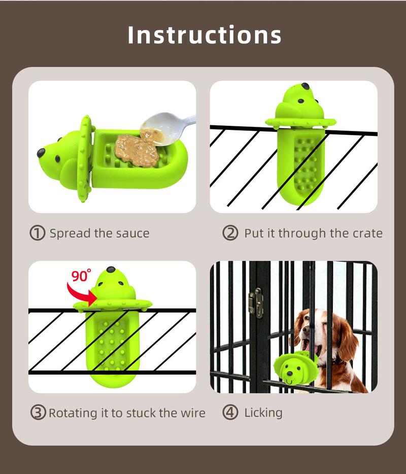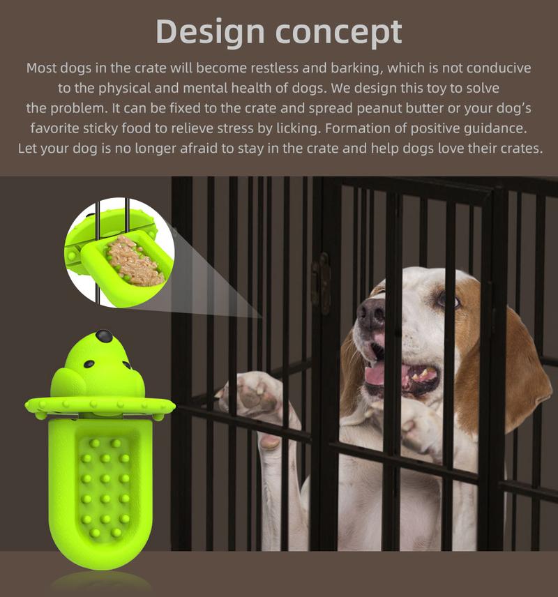Product Description FOOD-GRADE NATURAL RUBBER-This crate toys for dogs is made of natural rubber specialadded milk flavor.Non-toxic and non-hazardous. Noneed to worry about what puppies are not interested in.The milk flavor will attract dog to lick the toy all the time.UNIQUE ANIMAL DESIGN- Our crate training toys aredesigned with unique and fun dog faces. The vividdesign will help inspire your dog to play and keep busy.Perfect birthday or christmas gift for dogs lover.BENEFICIAL FOR ORAL HEALTH- The grooves andprotrusions are designed to clean the tongue coatingthrough repeated licking, which can help your dogs keeptheir mouths clean. DISTRACTION & REDUCE ANXIETY-Coat the crate-licking toy with peanut butter or yourdog's favorite sticky food, which can help your petdistract and relieve anxiety by licking. (Comes with a freebrush and is easy to clean after use). EASYINSTALLATION TRAINING TOOL- Suitable for most crates.You can just need to put it in the crate and rotate it 900to fix it in the crate. Help you perfectly solve the problemof dog crate training.