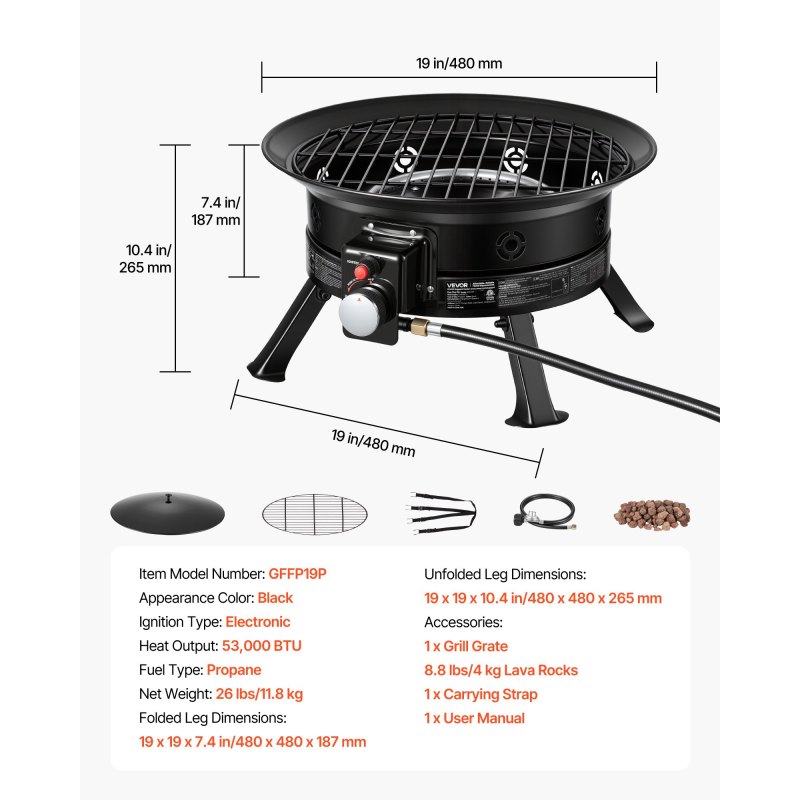 Complete Set of Accessories: Including lava rocks, a grill grate, a 5 ft extended gas hose, and a 0.57-inch hose connection, our propane firepit fits most gas tanks available on the market