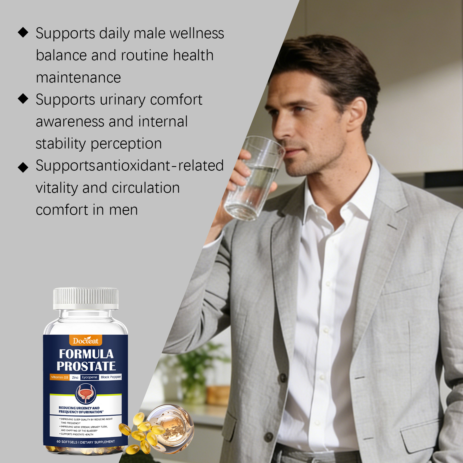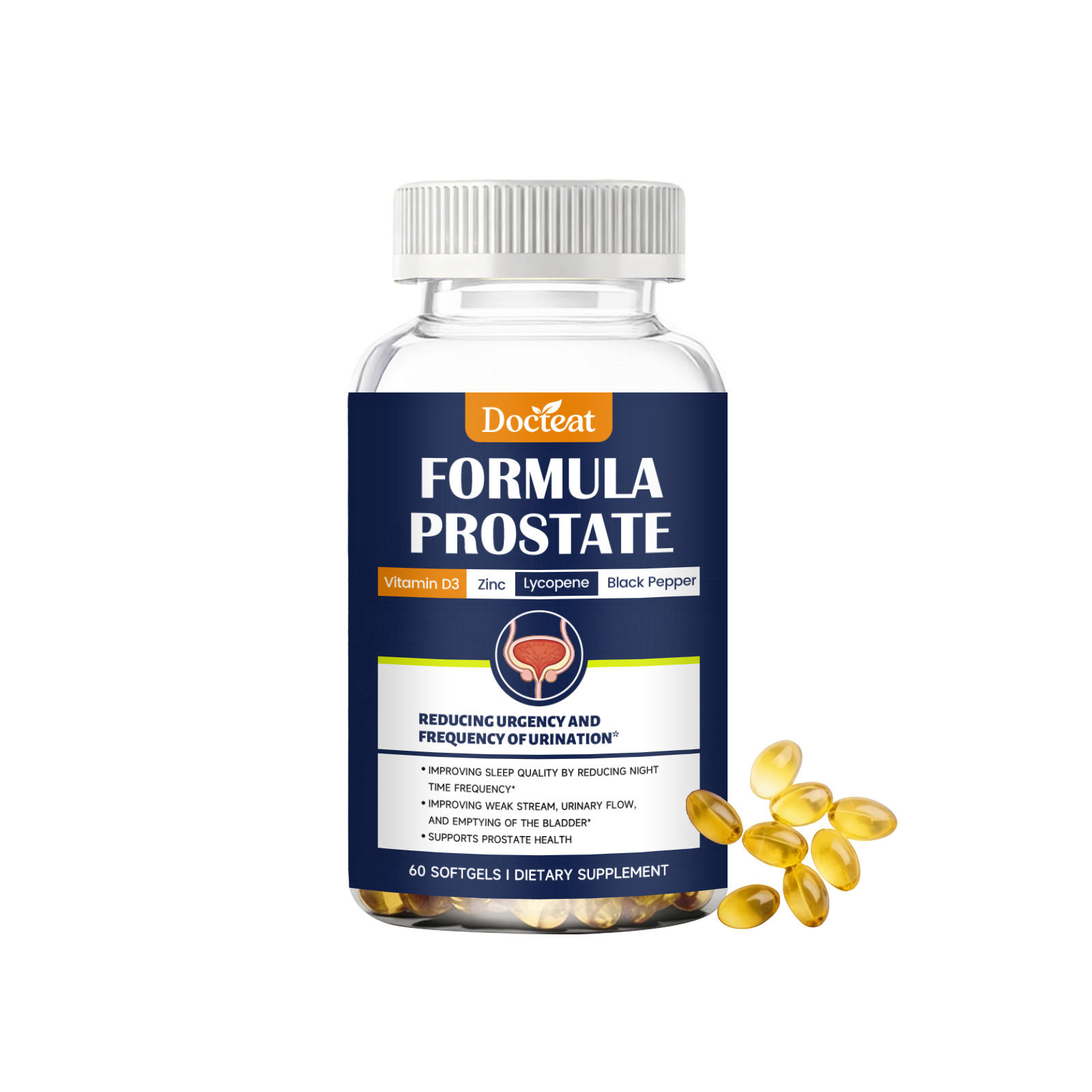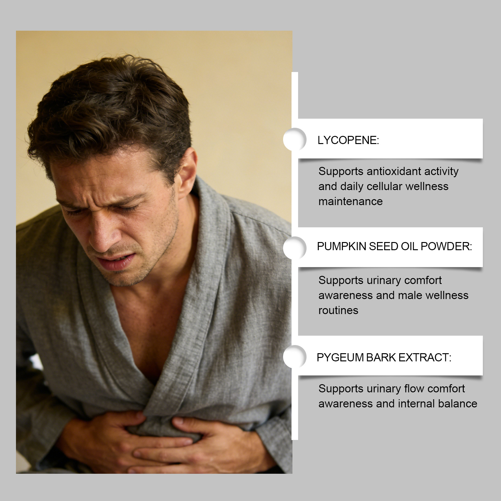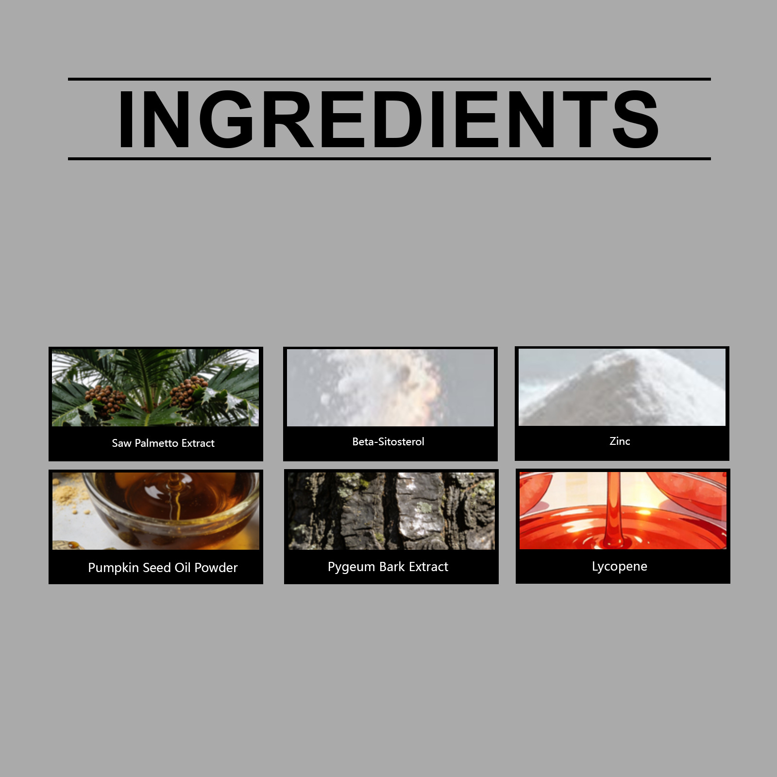 Ingredients: Saw palmetto extract, β-sitosterol, zinc picolinate, lycopene, pumpkin seed oil powder, African hip bark extract.