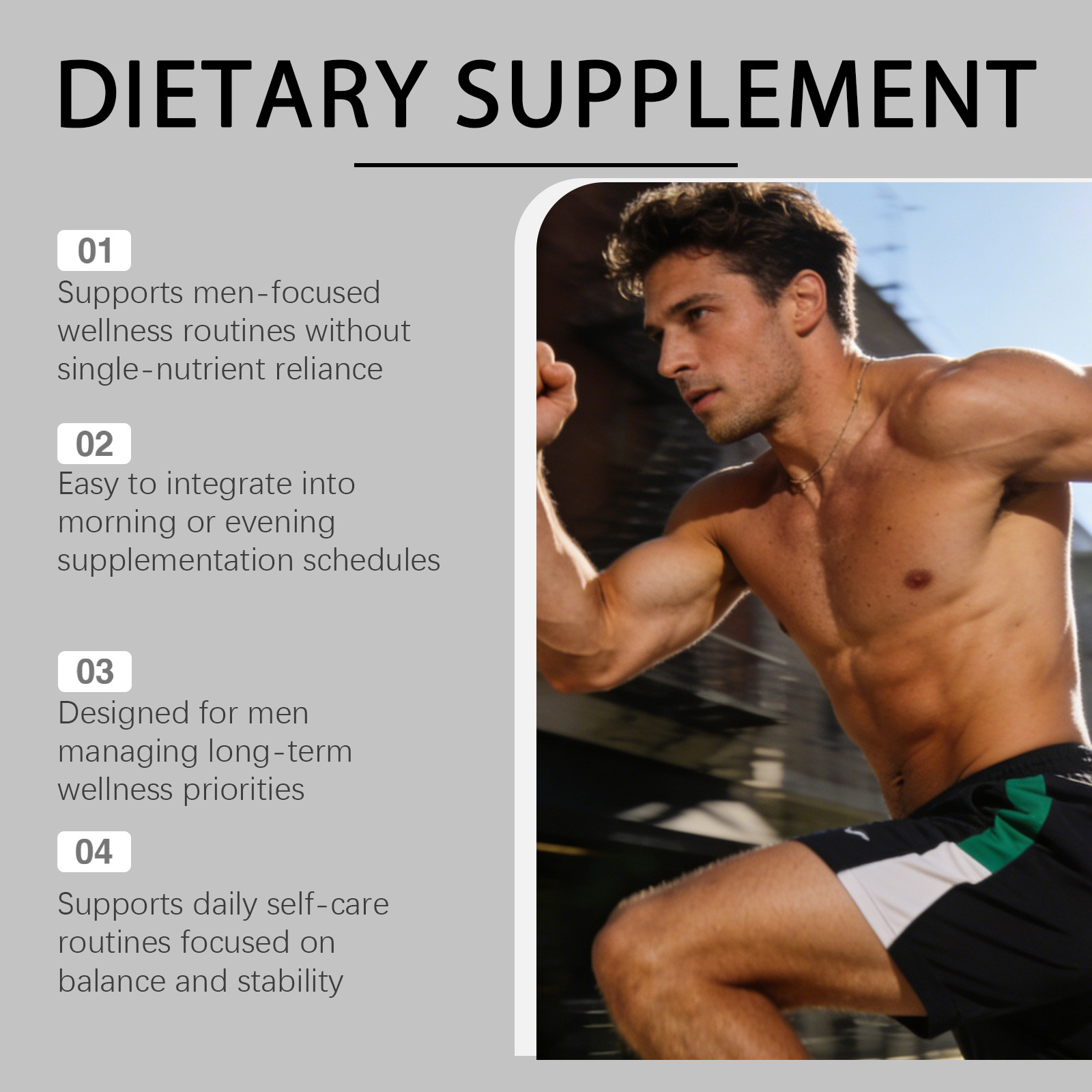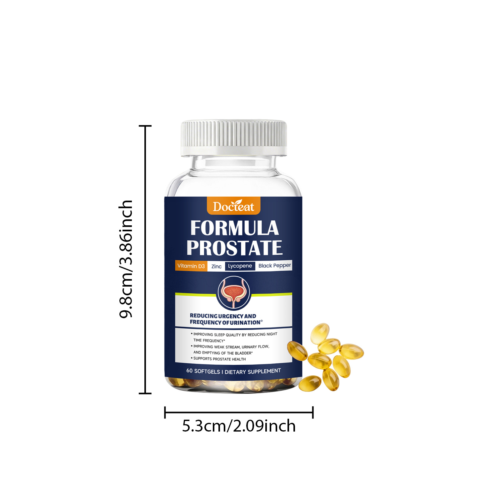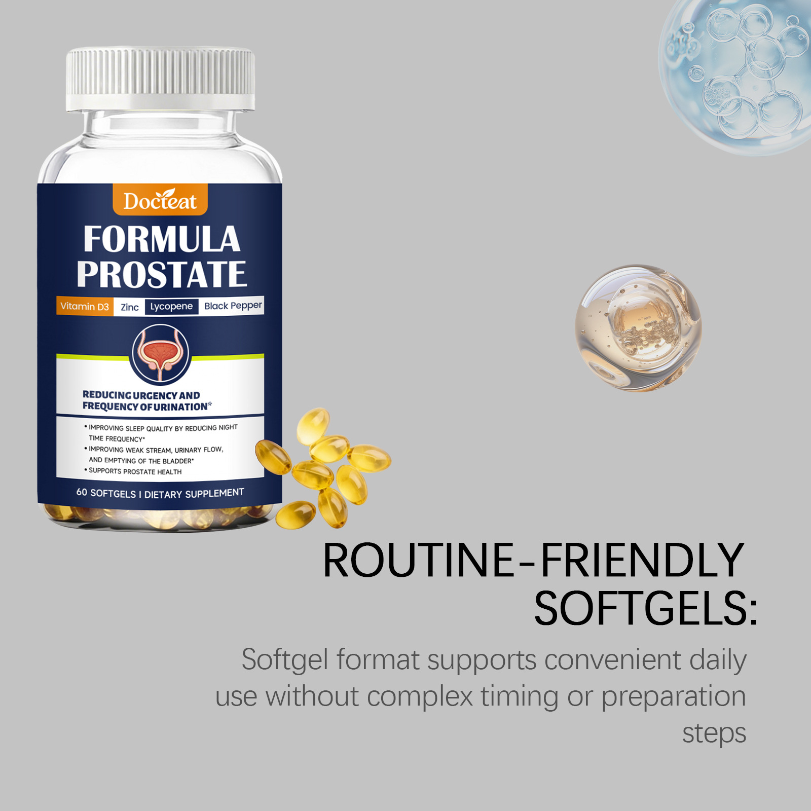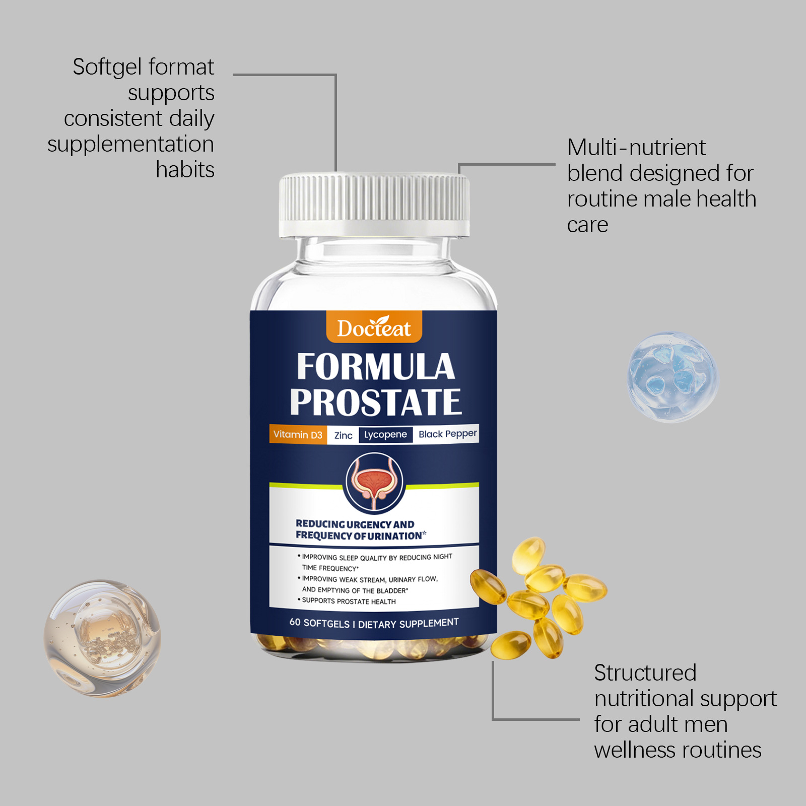 Ingredients: Saw palmetto extract, β-sitosterol, zinc picolinate, lycopene, pumpkin seed oil powder, African hip bark extract.