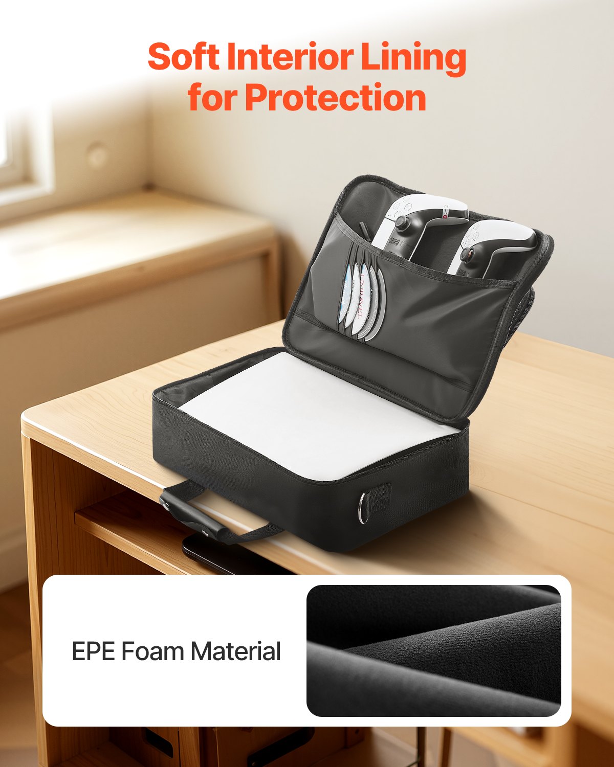 Features & Details Sturdy & Waterproof Nylon Material: Made with quality nylon fabric, this PS5 carrying case is not only durable and wear-resistant but also water-resistant, ensuring your PS5 and accessories stay secure from the elements. Only compatible with the PS5 2020 & PS5 Slim 2023 version Ultra-Spacious Capacity: The PS5 travel bag is designed with extra-large storage space to fit the PS5 console, two controllers, a headset, game discs, and additional accessories, ensuring everything has a dedicated place Soft Fabric Lining: Each compartment inside the case is lined with soft fabric, offering extra protection to avoid scratches and damage to your PS5 console, controllers, and headset Secure Padded Dividers: The PS5 carrying case features padded dividers between the console and accessories, keeping items securely in place and minimizing the risk of scratches or bumps during transport Compatible with PS5 and PS5 Slim : Crafted to seamlessly fit both the PS5 and PS5 Slim models, this PS5 travel bag provides tailored storage for your gaming system and accessories