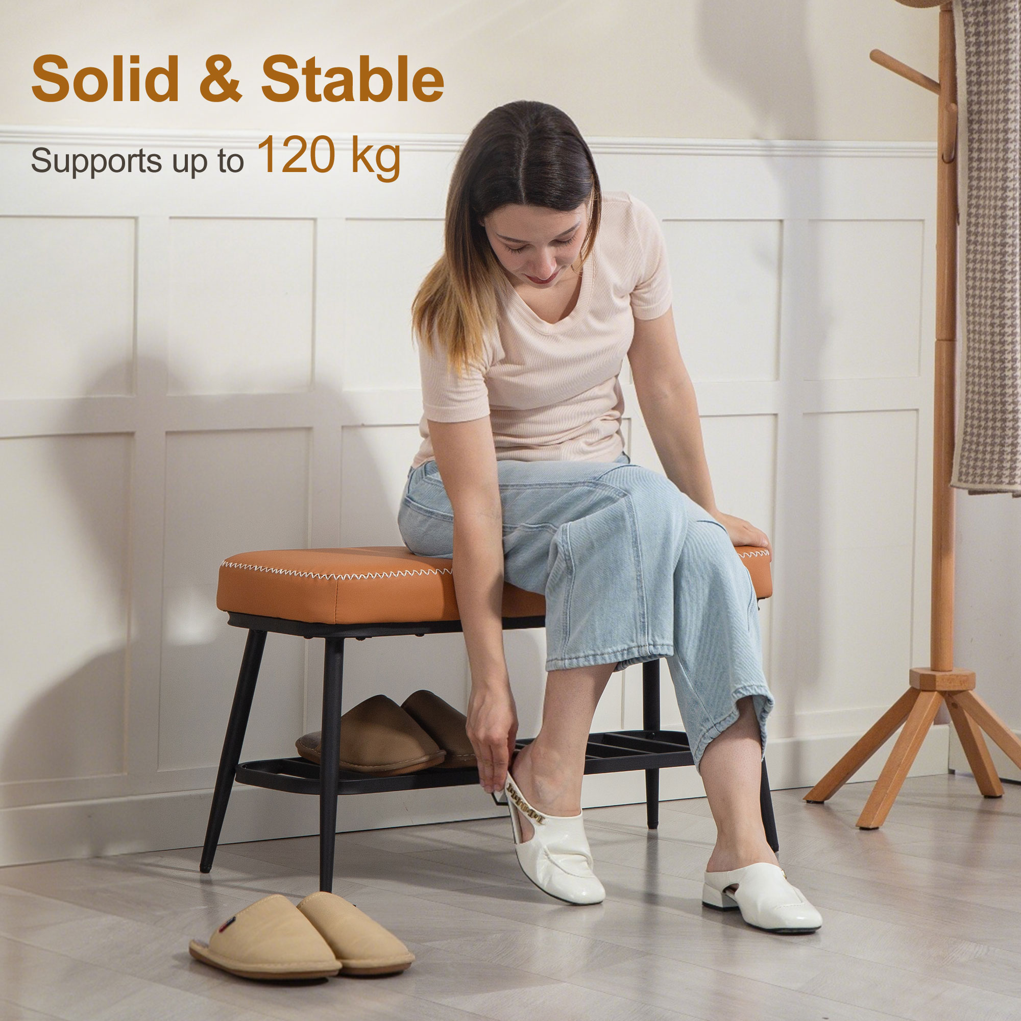 • Bottom storage shelf neatly holds four pairs of shoes, decluttering your entryway