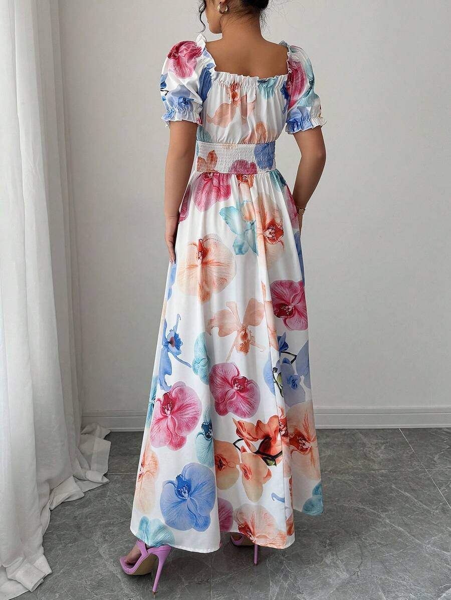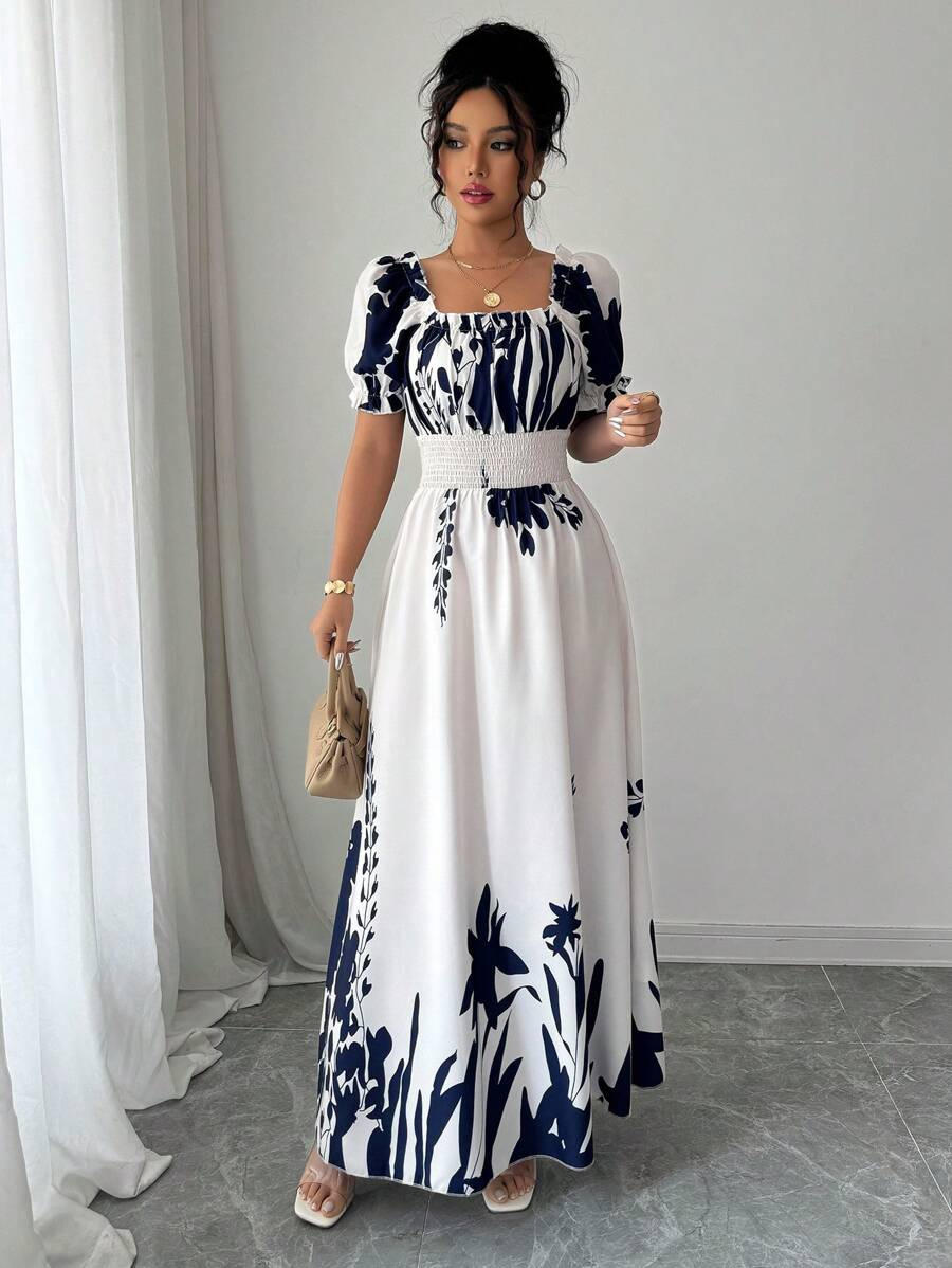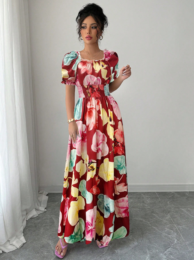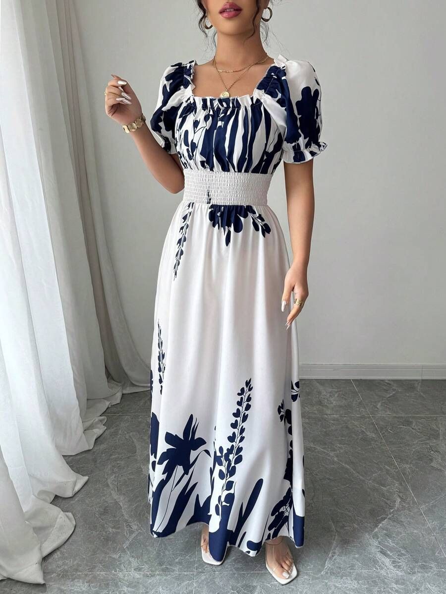 Puff-sleeve High-waist Cinched-waist Printed Maxi Slip Dress For Women