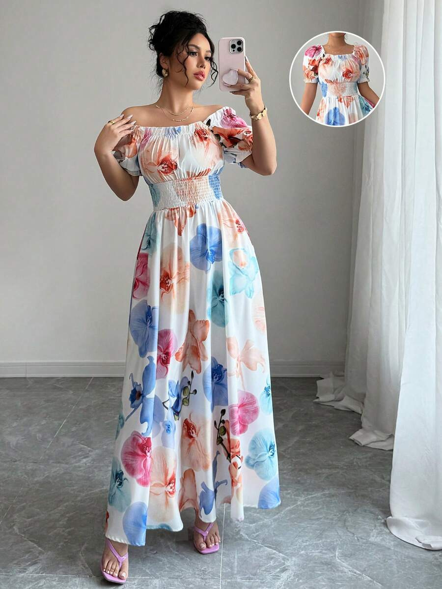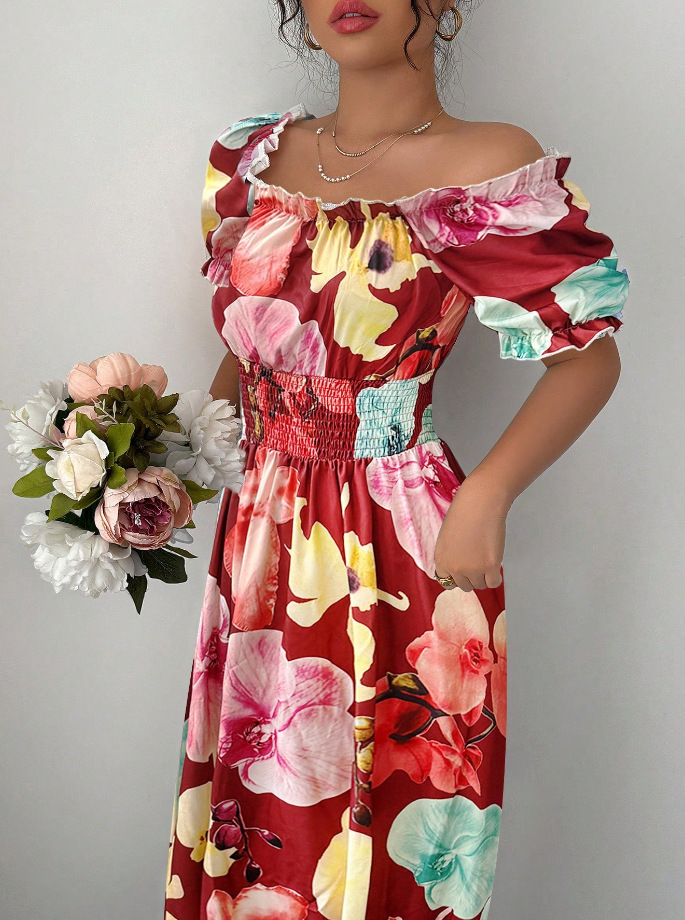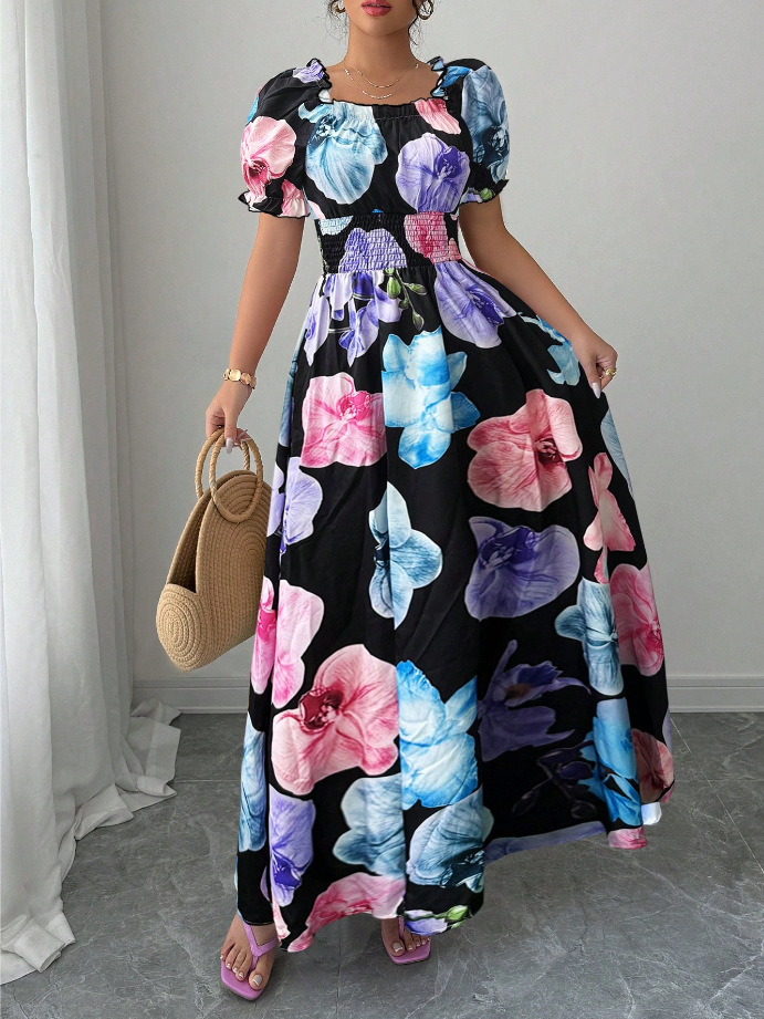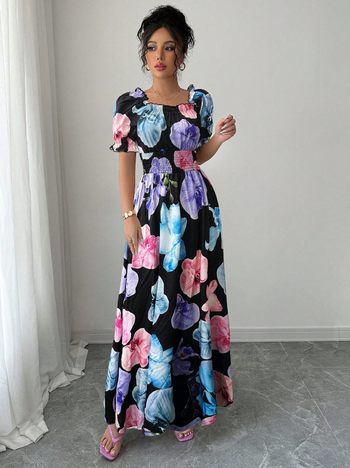 Puff-sleeve High-waist Cinched-waist Printed Maxi Slip Dress For Women