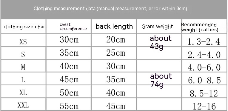 Size: XS chest circumference 30cm back length 20cm,S chest circumference 35cm back length 25cm,M chest circumference 40cm back length 30cm,L chest circumference 45cm back length 35cm,XL chest circumference 50cm back length 40cm,2XL chest circumference 55cm back length 45cm