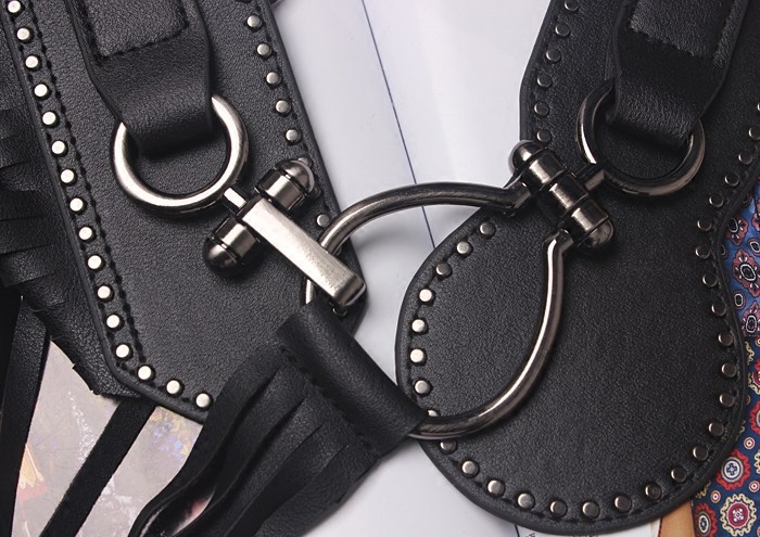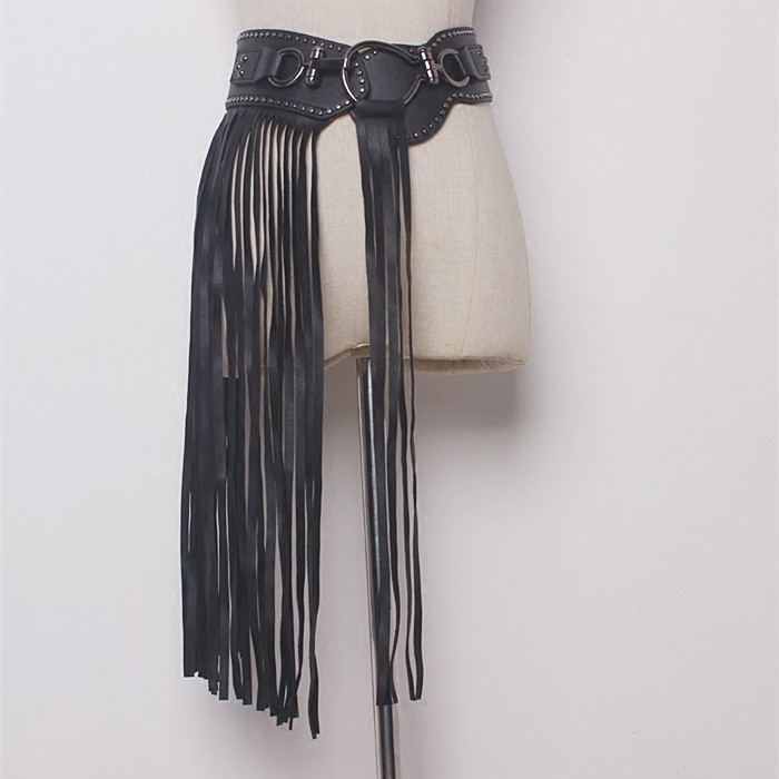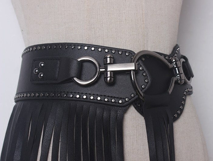 Punk Style Long Fringed Skirt Women's Studded Elastic Black Belt