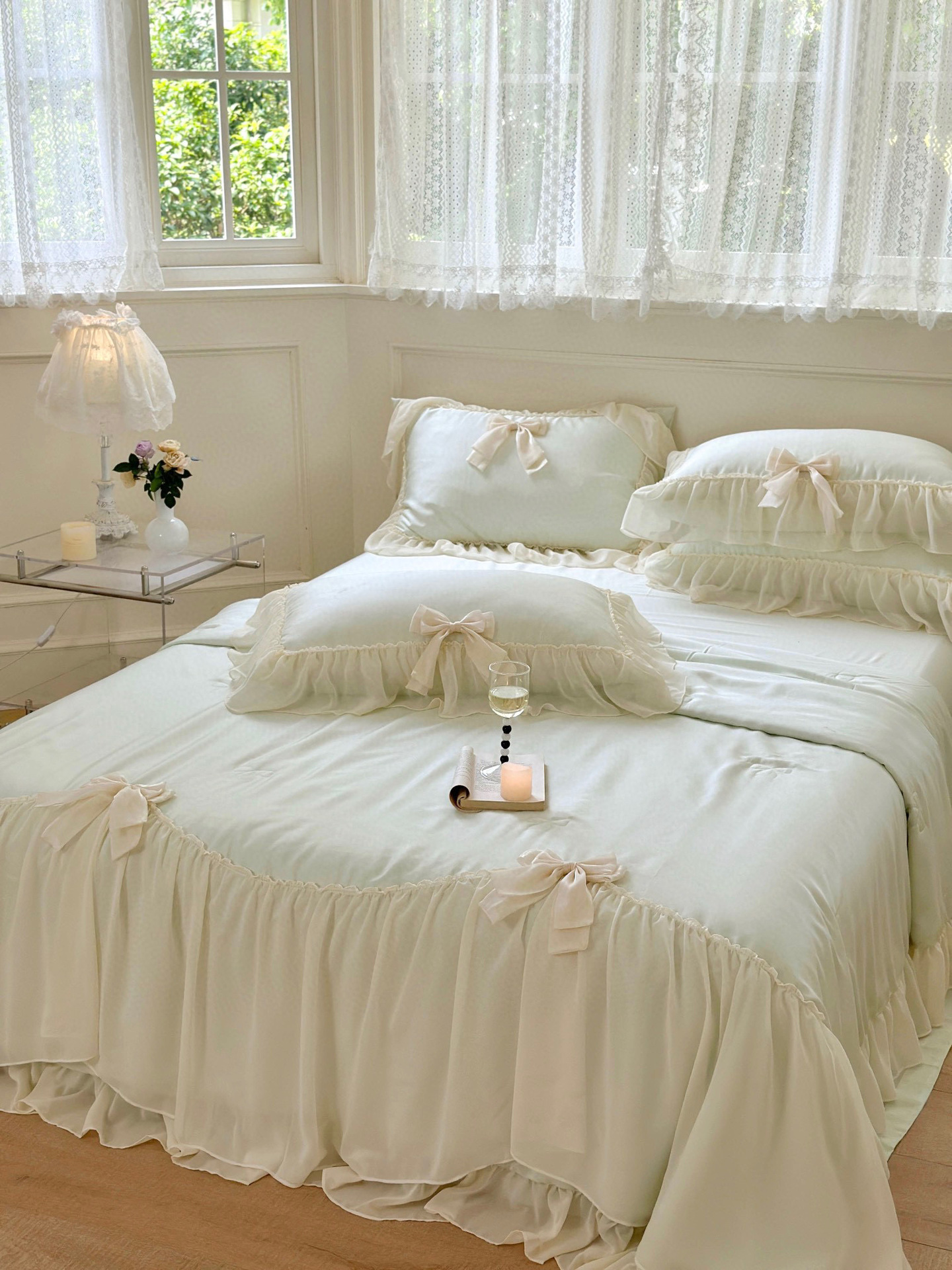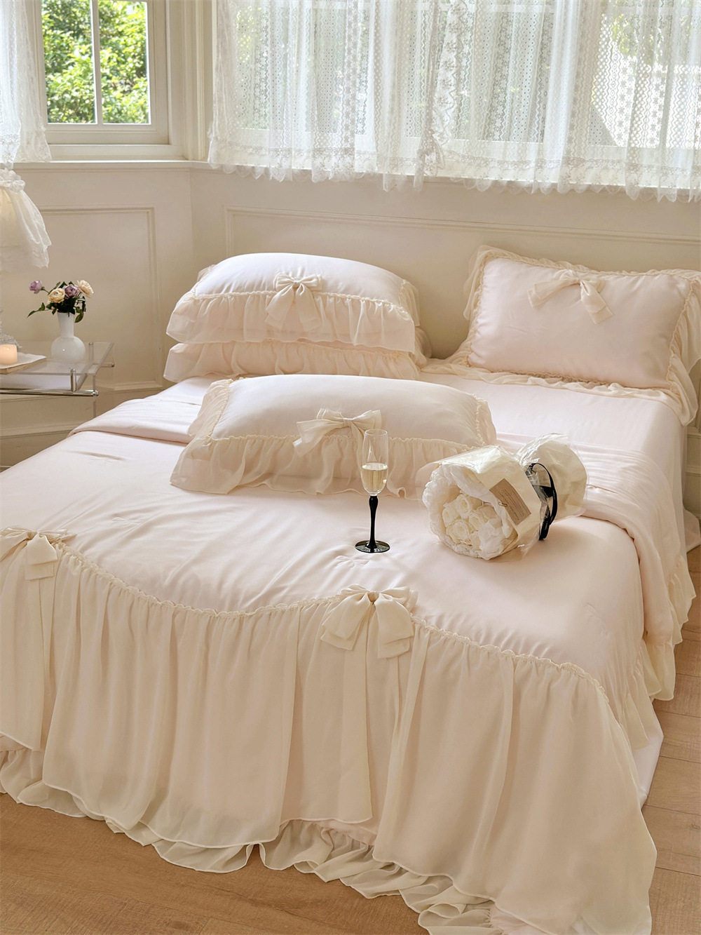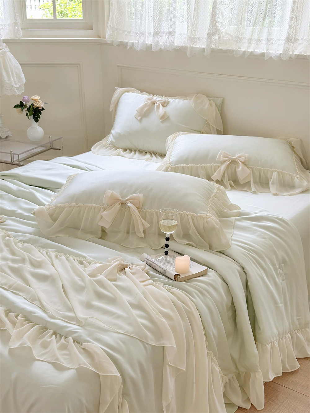 Pure Color Ruffles Princess Style Summer Quilt Tencel Summer Cooling Duvet Airable Cover Four-piece Set