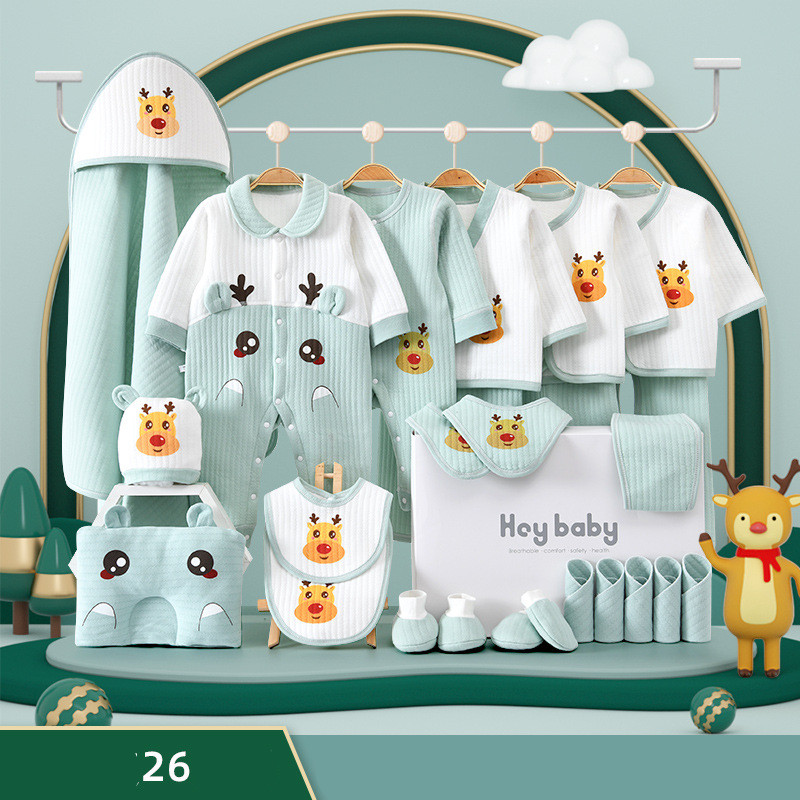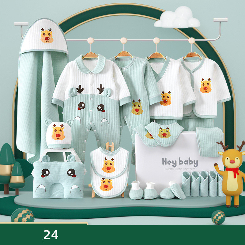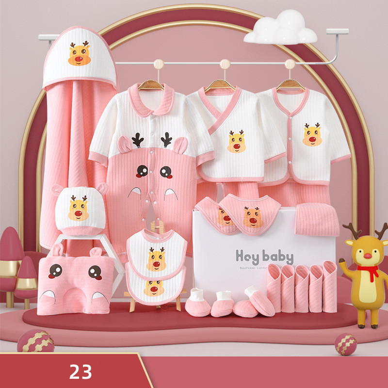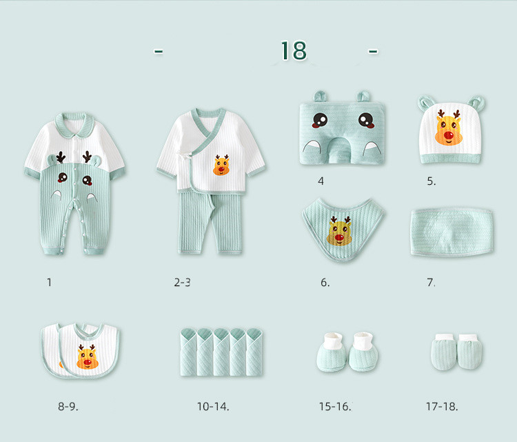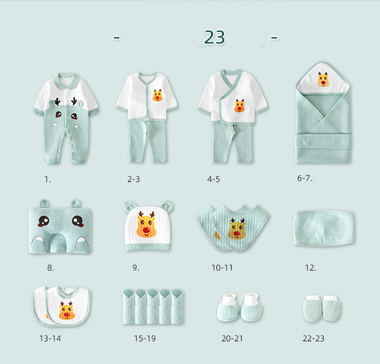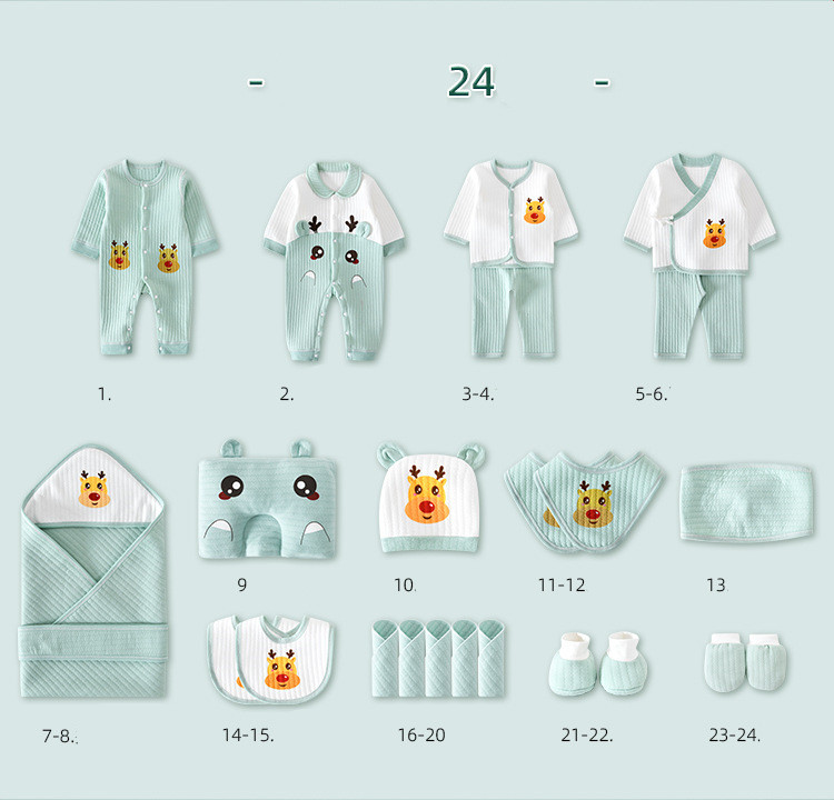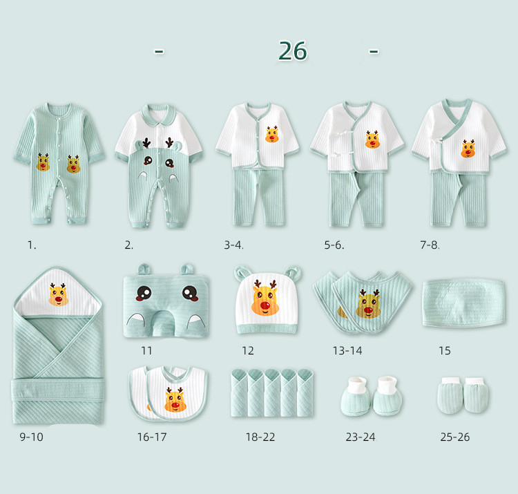 1. Solid color jumpsuit 2. Lapel jumpsuit 3-4. Snap suit 5-6. Lace suit 7-8. Monk suit 11. Styling pillow 12. Baby hat 13-14. Big bib 15. Umbilical cord 9-10. Quilt + strap 16-17. Small bib 18-22. Square scarf 23-24. Foot cover 25-26. Gloves