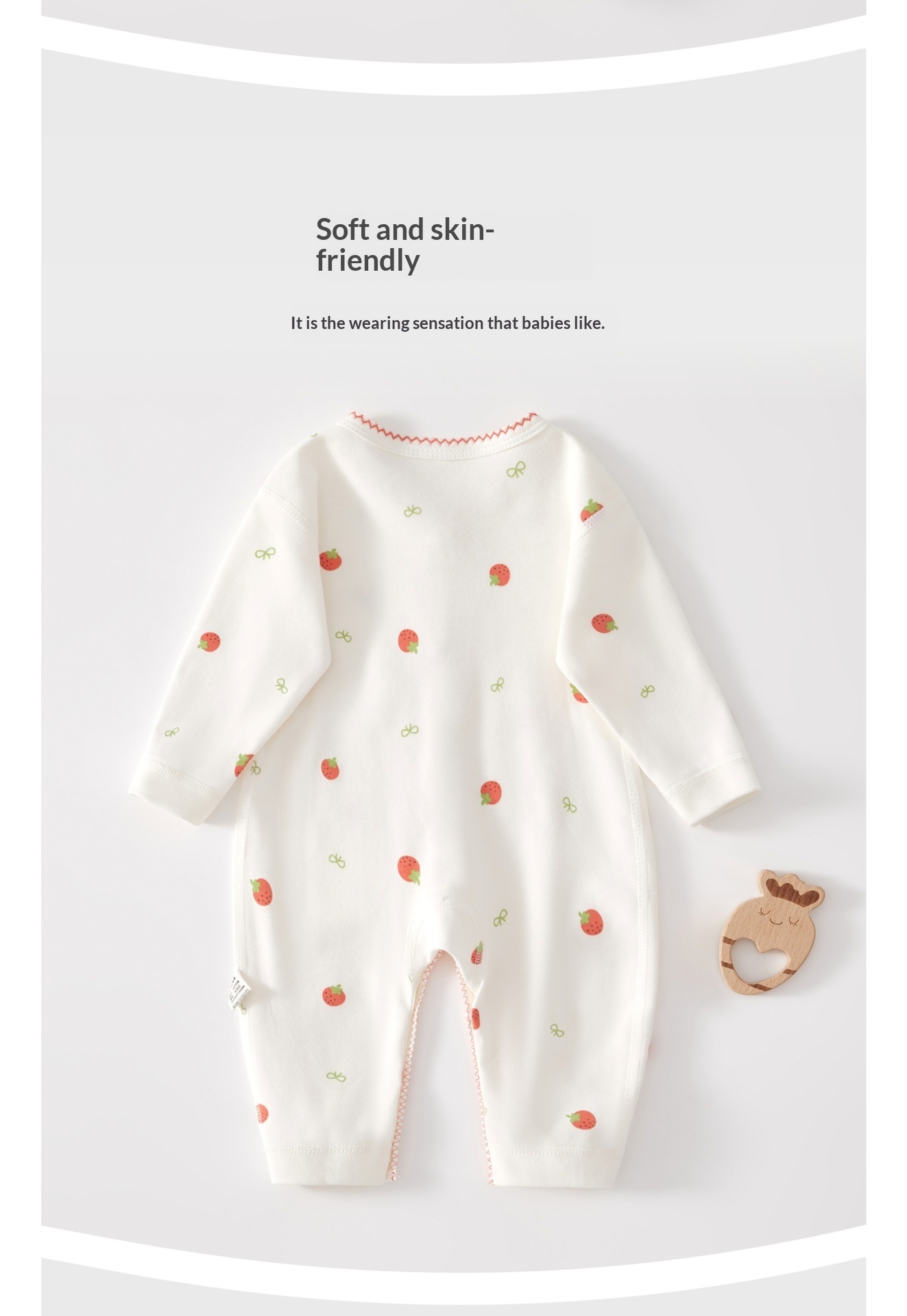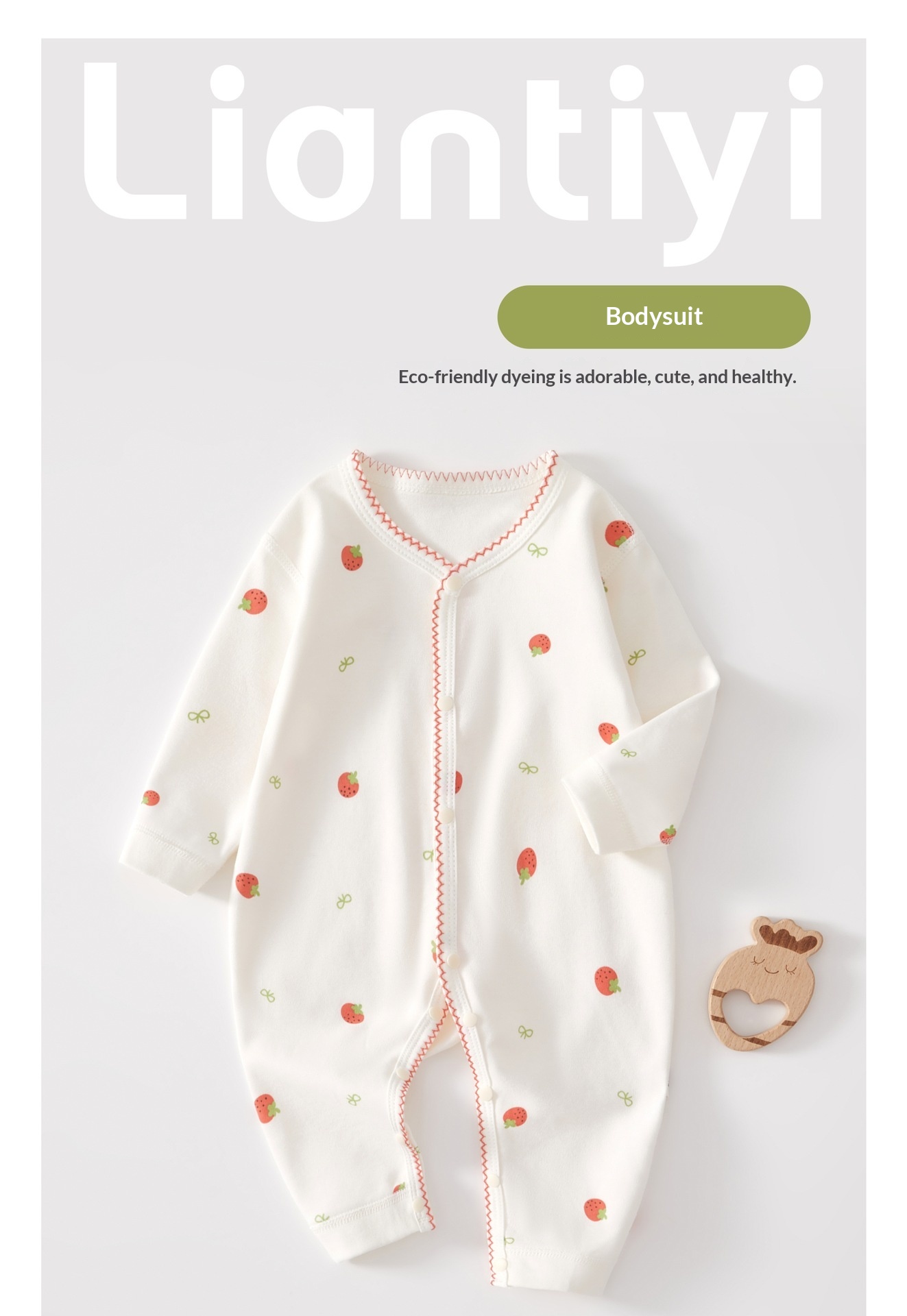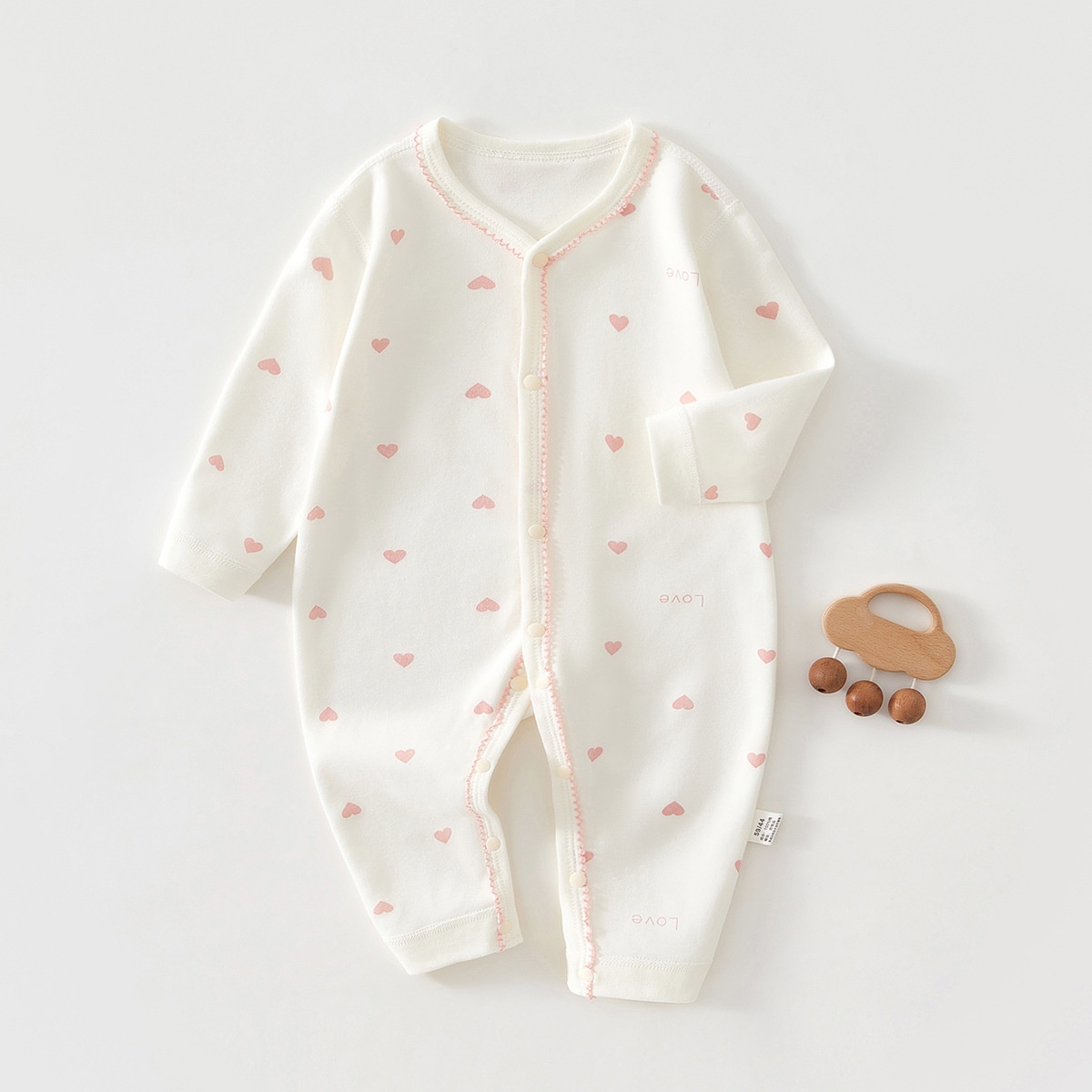 Colors: Red strawberry-print bodysuit (spring/autumn), red heart-print bodysuit (spring/autumn), pink heart-print onesie (spring/autumn), spring/autumn onesie with lace and small floral pattern, orange-pink lace spring/autumn onesie, butterfly purple lace spring/autumn onesie, milky white lace spring/autumn onesie