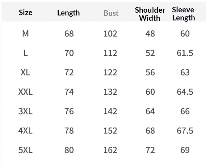 Sizes: M (European size), L (European size), XL (European size), XXL (European size), XXXL (European size), XXXXL (European size), XXXXXL (European size)
