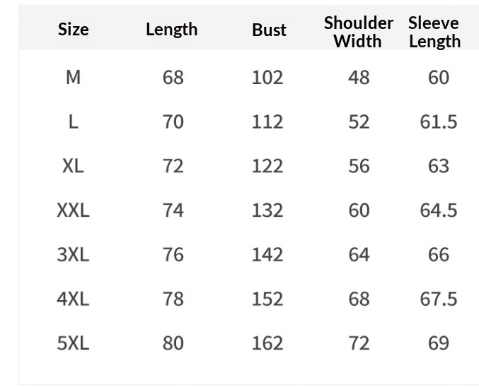 Sizes: M (European size), L (European size), XL (European size), XXL (European size), XXXL (European size), XXXXL (European size), XXXXXL (European size)