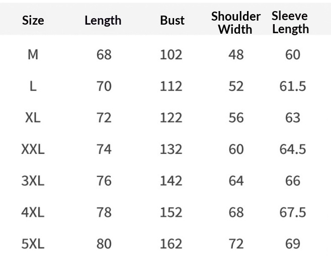 Sizes: M (European size), L (European size), XL (European size), XXL (European size), XXXL (European size), XXXXL (European size), XXXXXL (European size)
