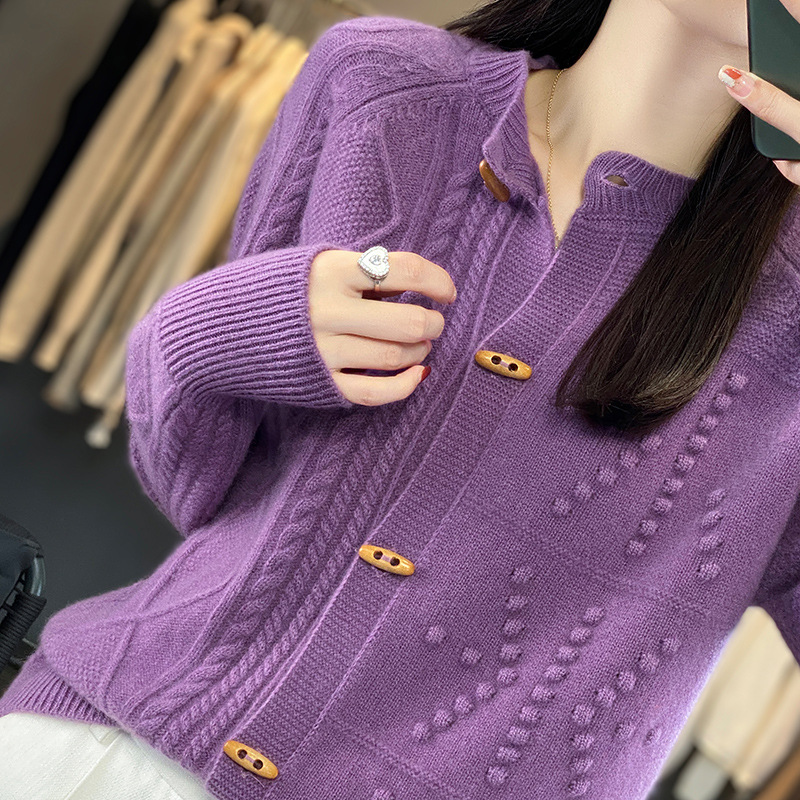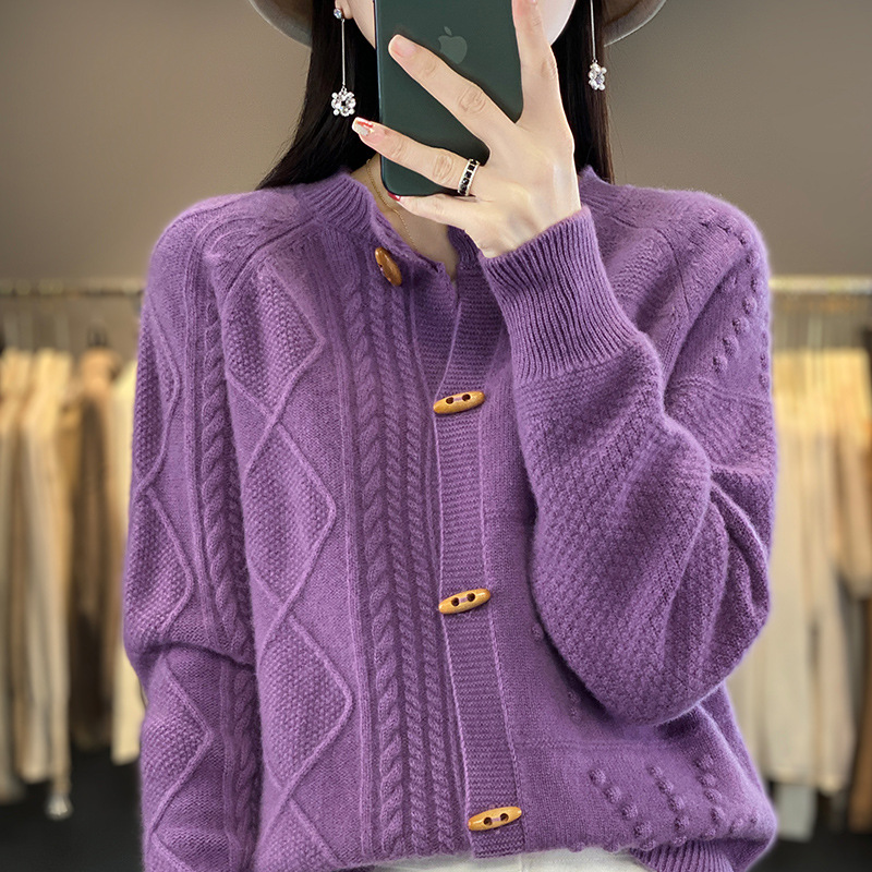Pure Wool Cardigan Women Loose Crew Neck Coat