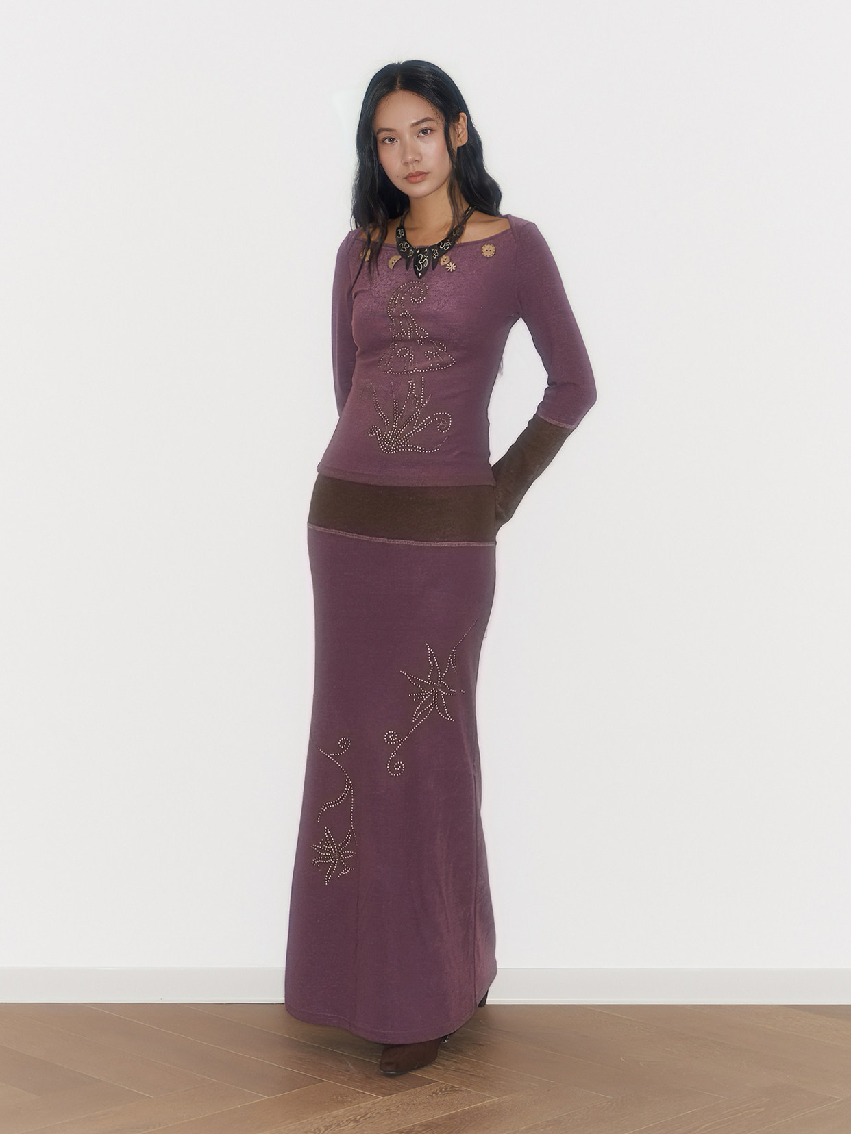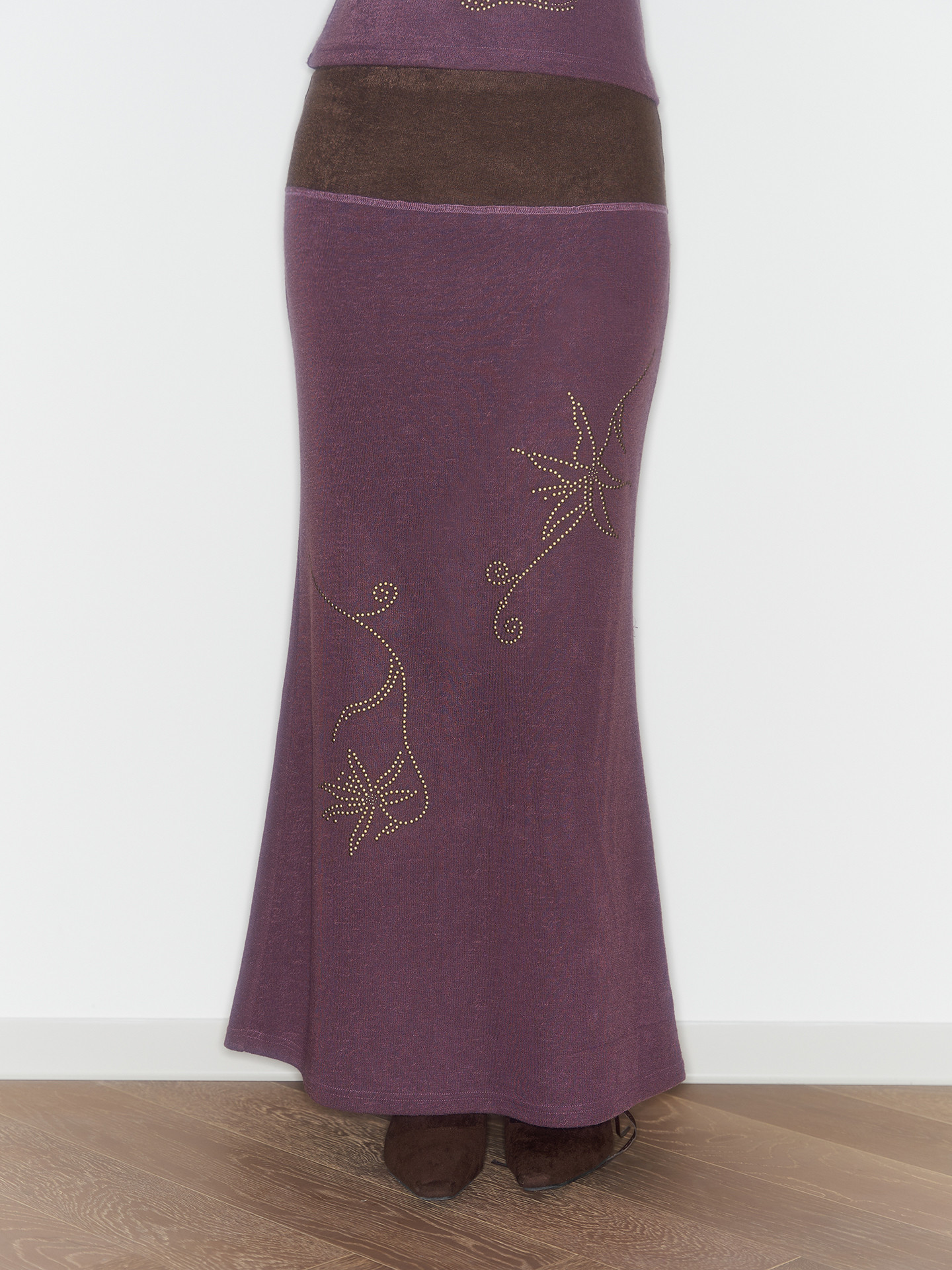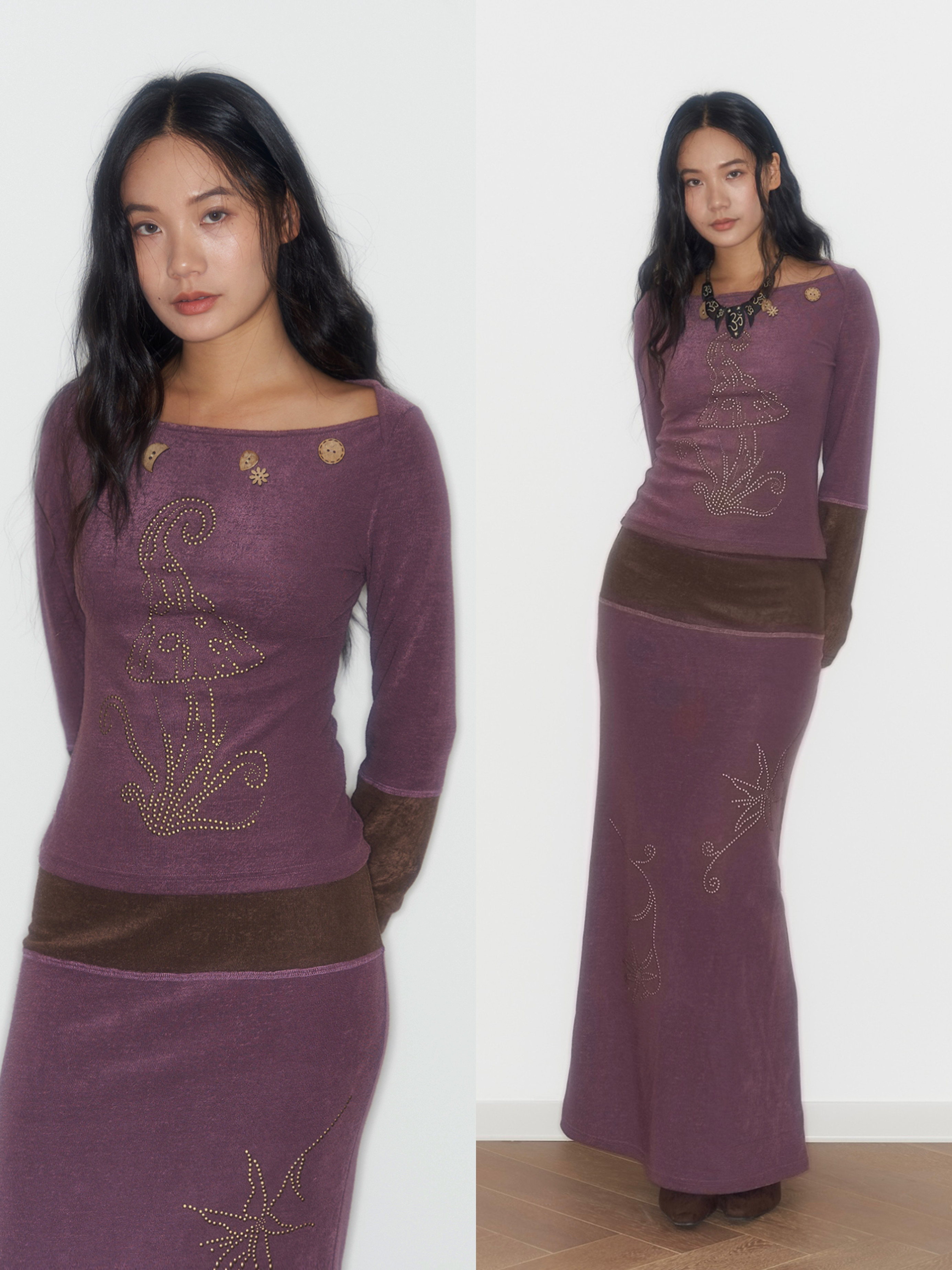 Purple And Coffee-Colored Soft Cozy Towel-Weave Base-Layer Set Dress In A Botanical Style For FallWinter