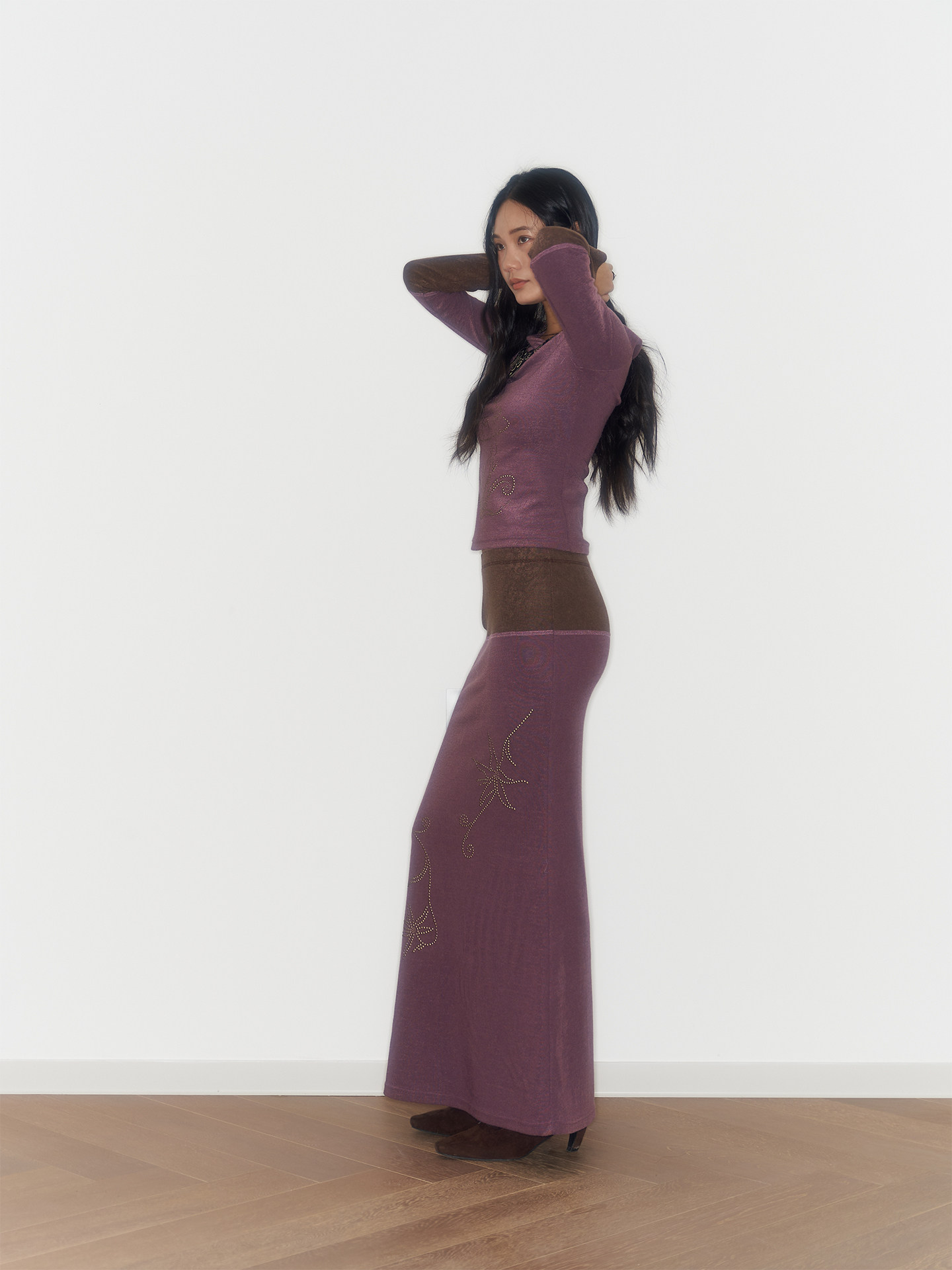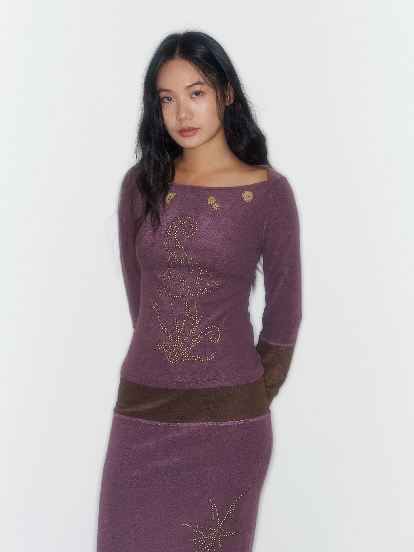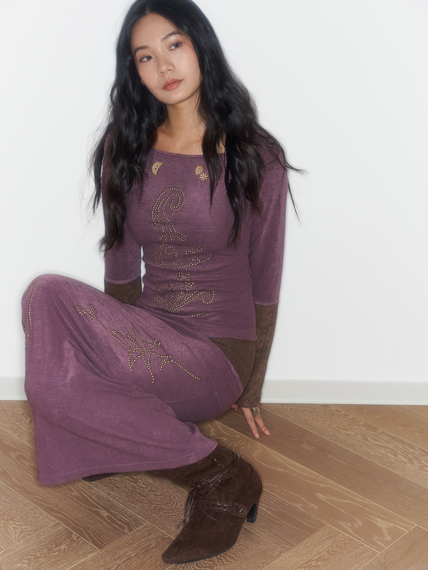Purple And Coffee-Colored Soft Cozy Towel-Weave Base-Layer Set Dress In A Botanical Style For FallWinter