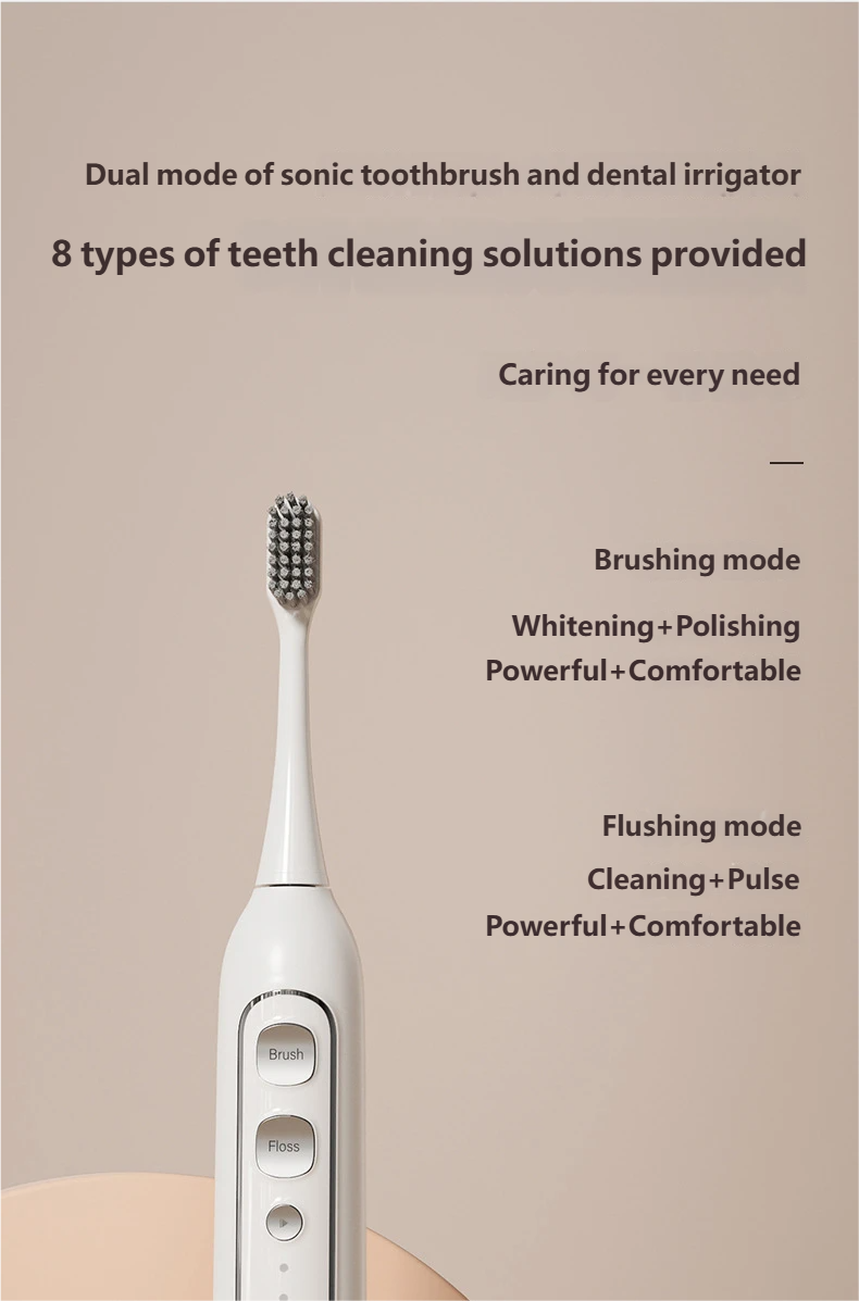 3-in-1 Function, One Machine for Multiple Uses: Integrates sonic toothbrush, water flosser, and dental cleaner into one device, supporting 8 cleaning modes to meet various needs such as teeth whitening, polishing, cleaning, pulse, powerful, and comfortable. It easily handles daily brushing, interdental residue removal, and deep dental calculus cleaning.