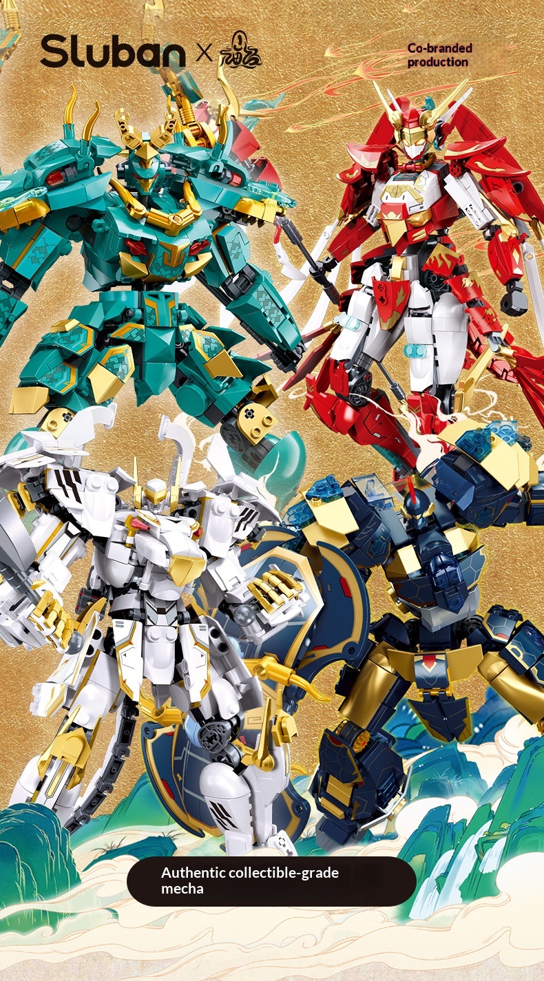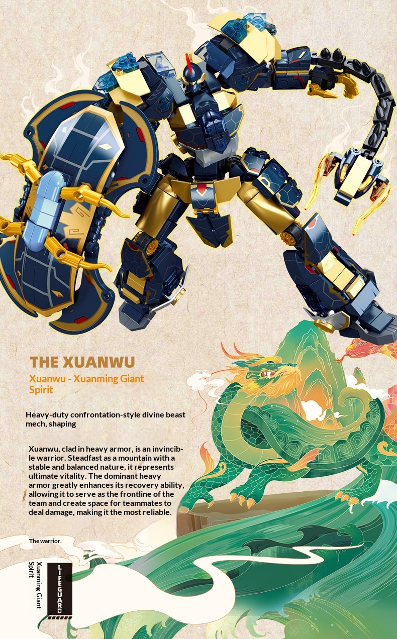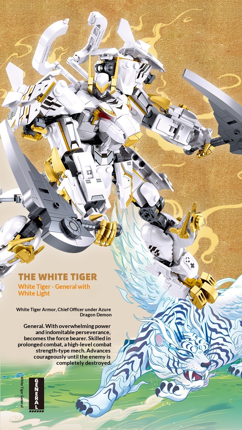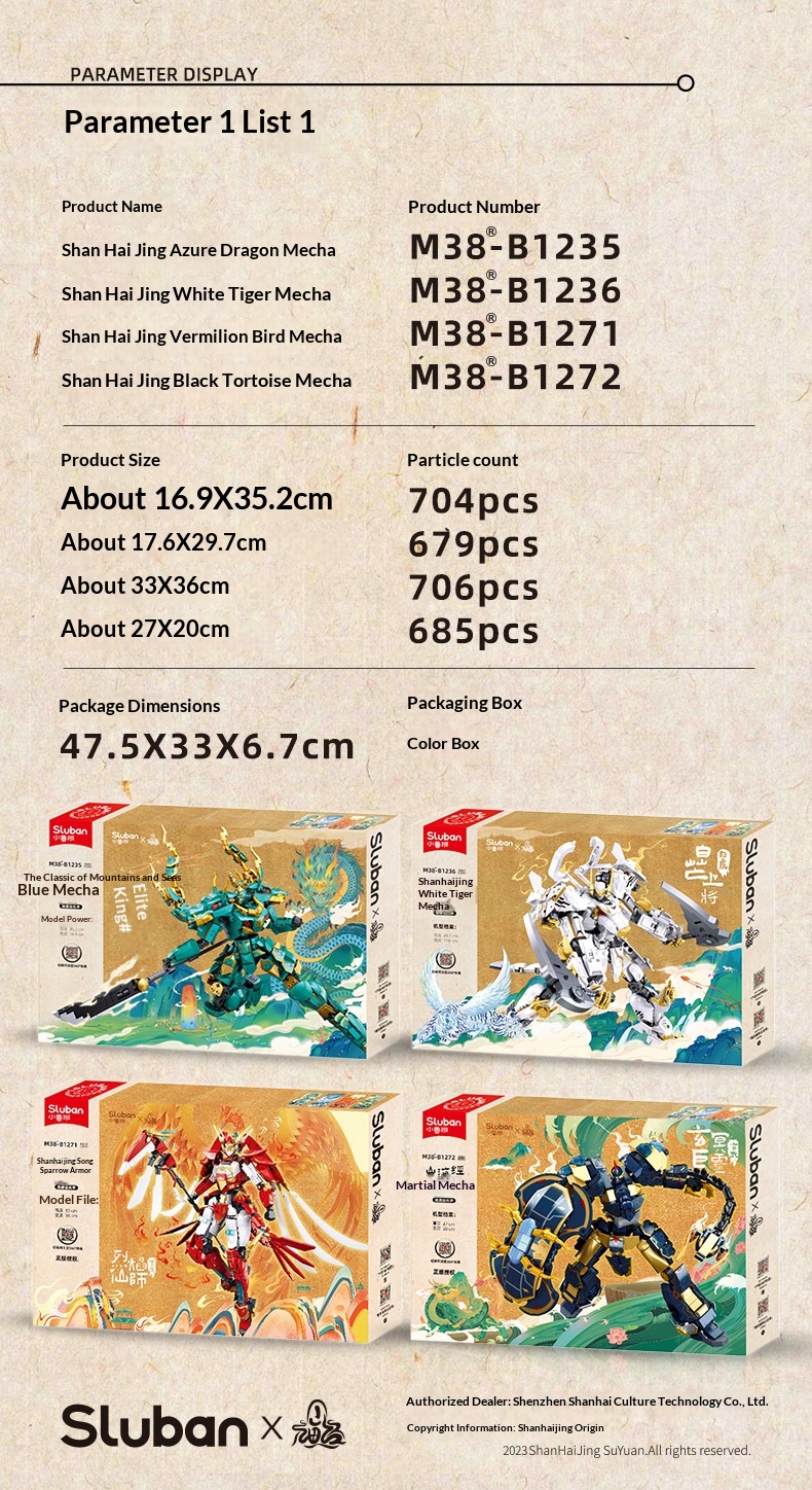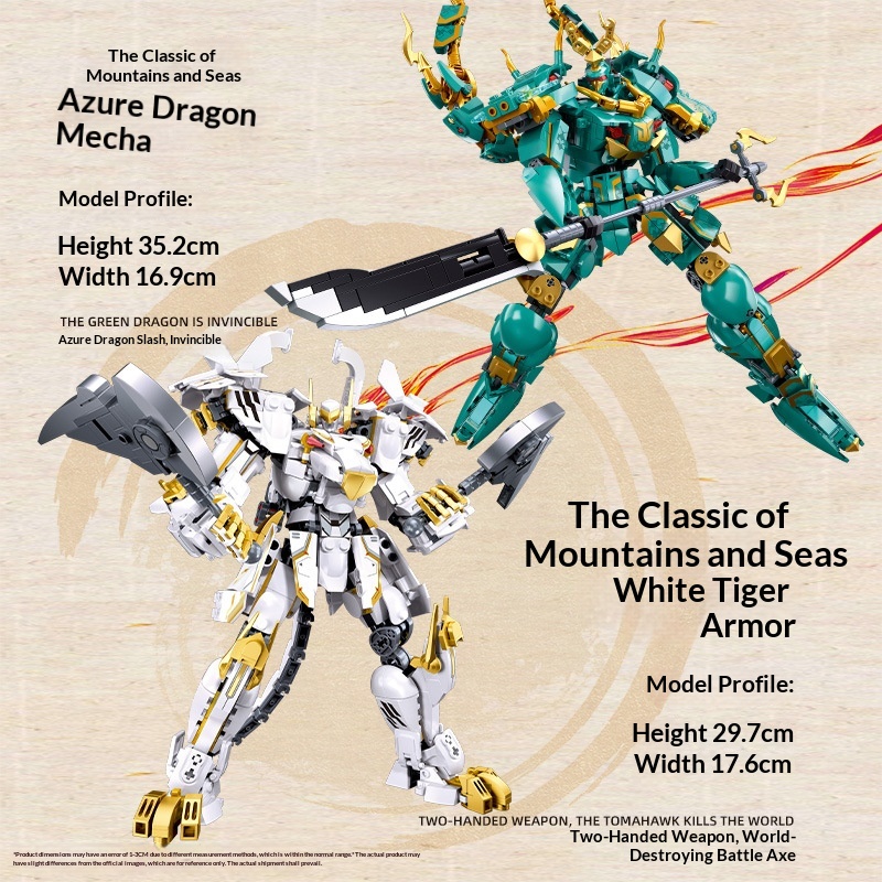 Colors: Xiao Luban 1235 Shan Hai Jing Azure Dragon Mech, Xiao Luban 1236 Shan Hai Jing White Tiger Mech, Xiao Luban 1271 Shan Hai Jing Vermilion Bird Mech, Xiao Luban 1272 Shan Hai Jing Black Tortoise Mech