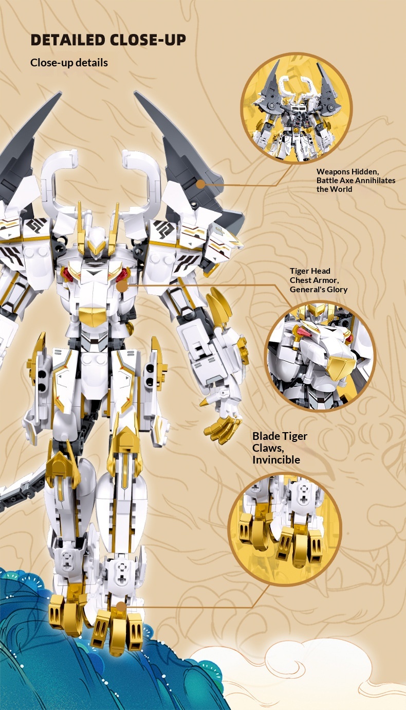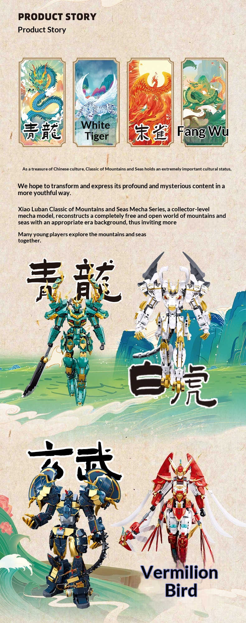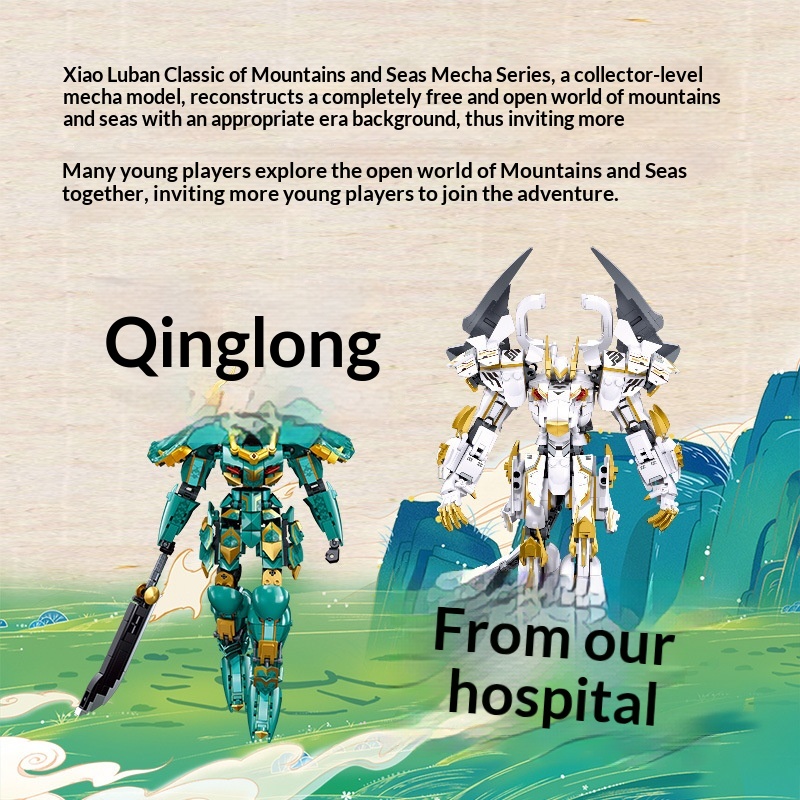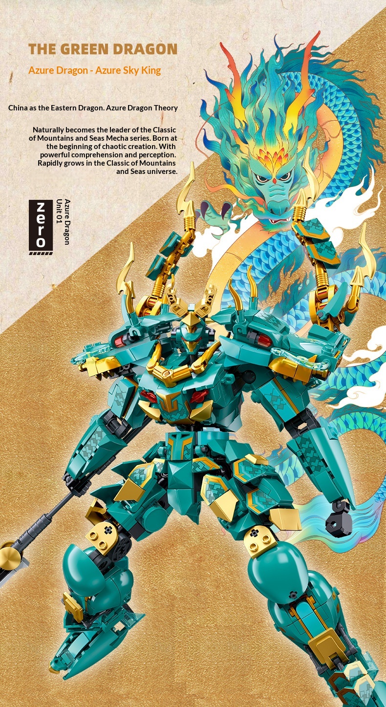 Colors: Xiao Luban 1235 Shan Hai Jing Azure Dragon Mech, Xiao Luban 1236 Shan Hai Jing White Tiger Mech, Xiao Luban 1271 Shan Hai Jing Vermilion Bird Mech, Xiao Luban 1272 Shan Hai Jing Black Tortoise Mech