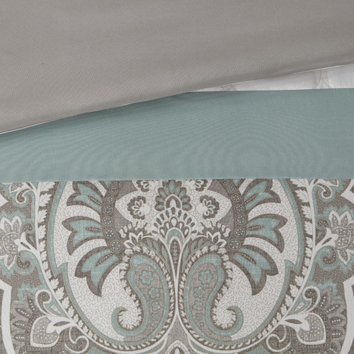 Update your bedroom with the refined elegance of 510 Design’s Shawnee 8 Piece Comforter Set. Showcasing a pieced design with diamond quilting details, this ultra-soft microfiber comforter flaunts a partial damask print in seafoam and brown hues to create a luxurious look. A solid brown reverse complements the top of the bed, while the matching shams reiterate the design of the comforter for a chic coordinated ensemble. The seafoam Euro shams feature brown flanges that add a charming touch and two embroidered decorative pillows provide a lavish accent. Completing the comforter set is a solid seafoam bed skirt that offers a clean finish, giving your bedroom decor a beautiful allure. Hypoallergenic polyester filling in the comforter and pillows contains no allergens and is treated to be dustproof. Machine washable for easy care, this traditional comforter set may come in rolled or compressed packing and will need to be fluffed up. Use a steam iron to help remove wrinkles easier.