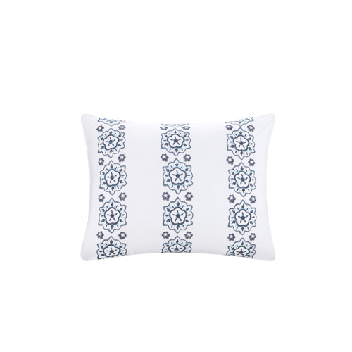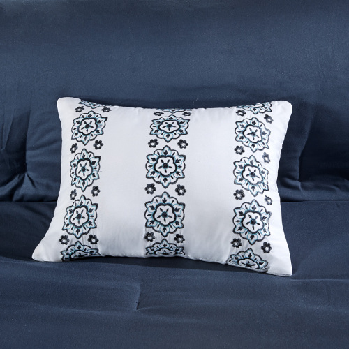 The Intelligent Design Loretta Boho Comforter Set with Bed Sheets brings a bright, casual update to your bedroom. A large medallion print, in navy and purple, runs down the center of the comforter with subtle bohemian details highlighted in white. Coordinating shams (1 in Twin/TwinXL) with embroidered borders complement the comforter. A decorative pillow with ruched and pieced detailing and a solid navy bed skirt finishes the look. Also included is a complete sheet set that reiterates the bohemian motif. This bedding set is also OEKO-TEX certified, meaning it does not contain any harmful substances or chemicals to ensure quality comfort and wellness.