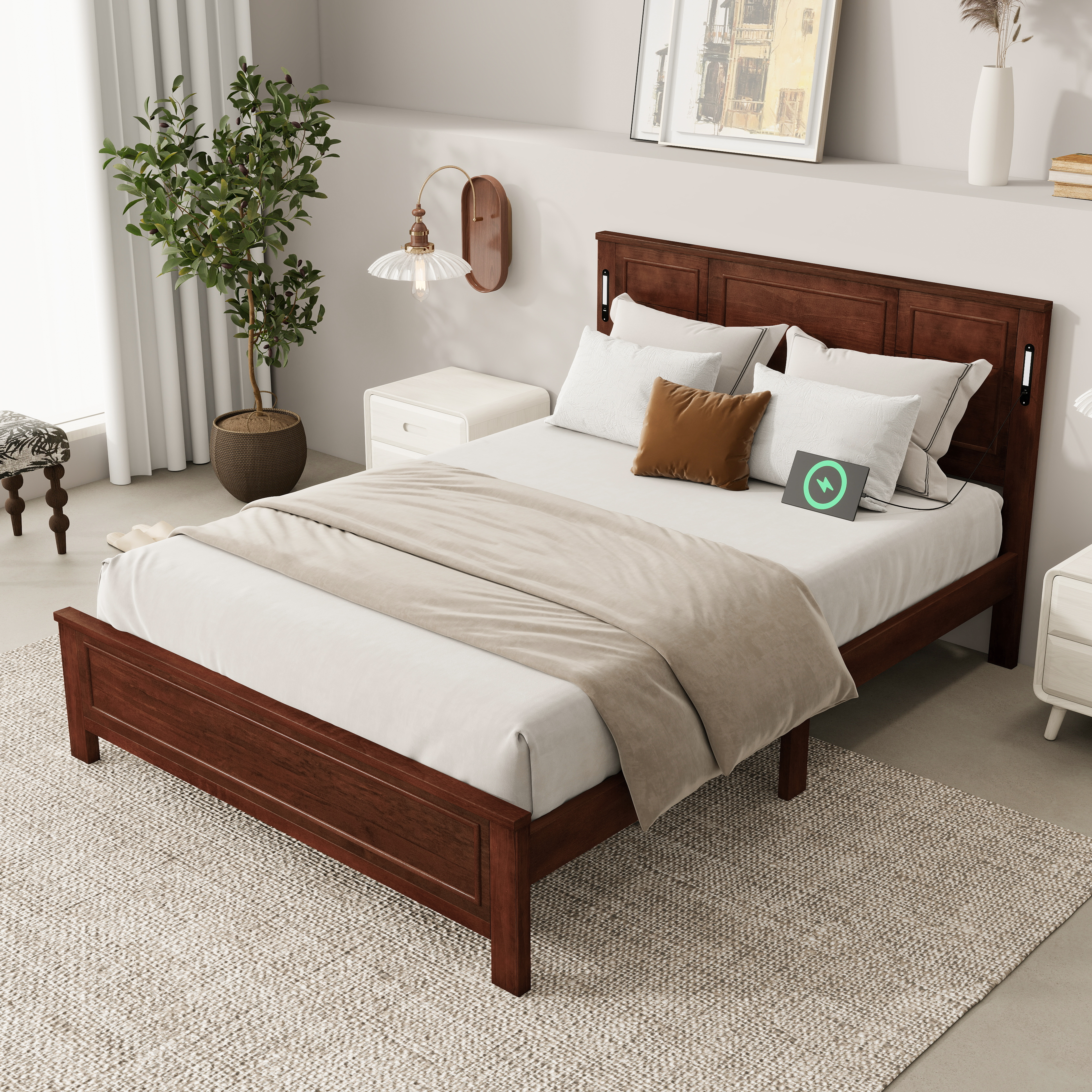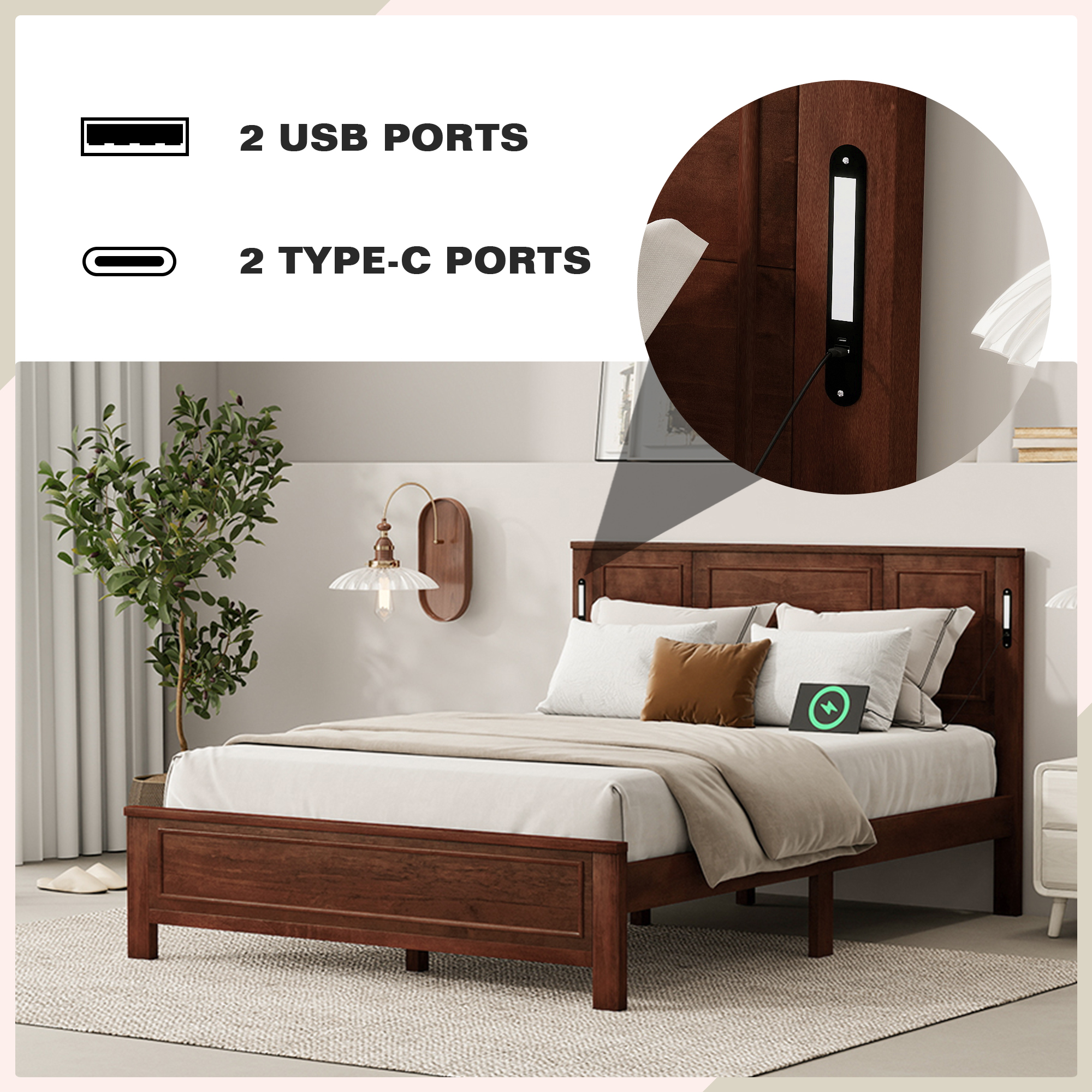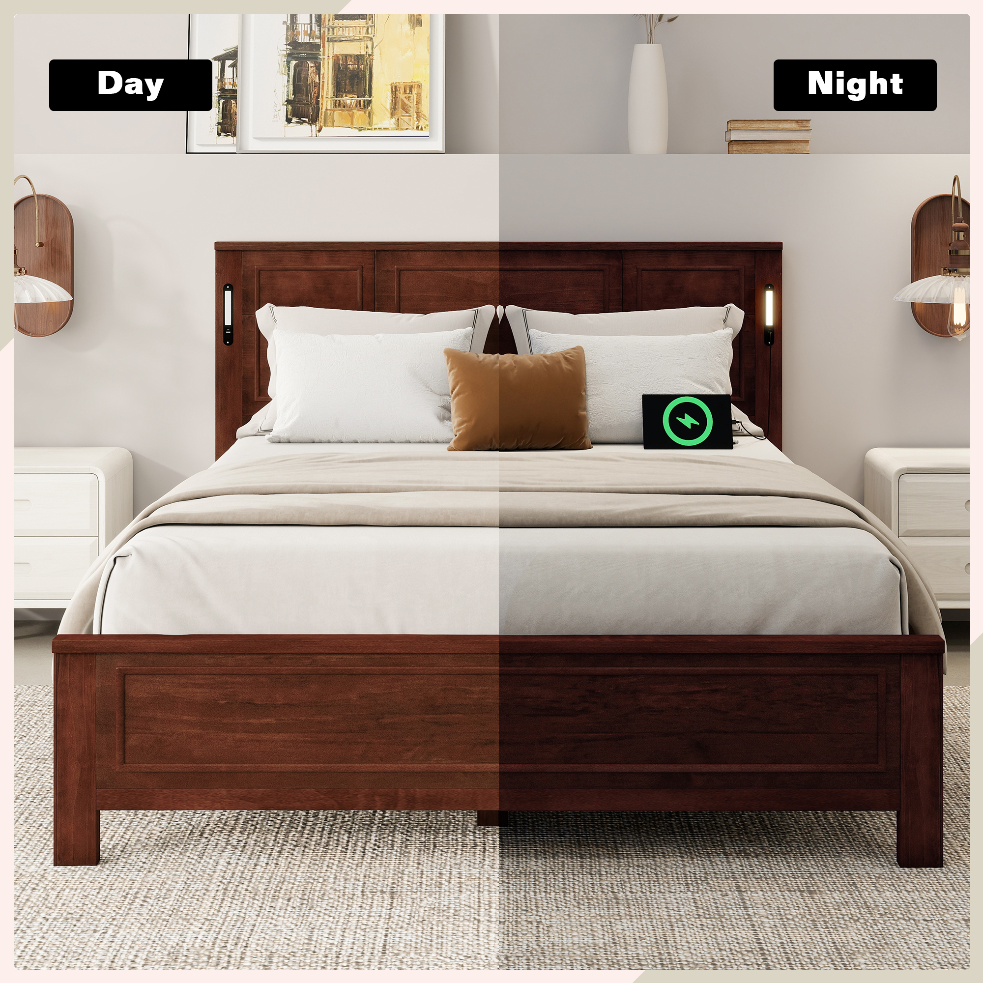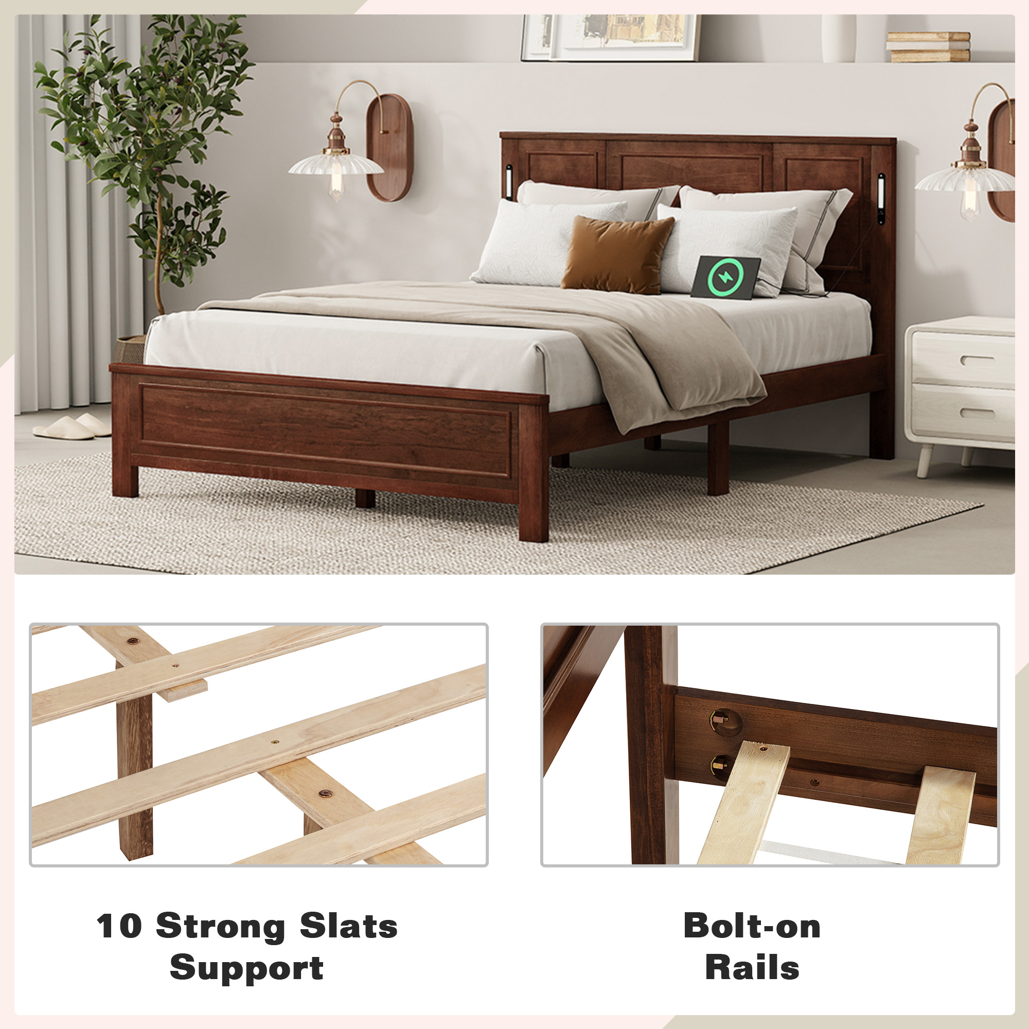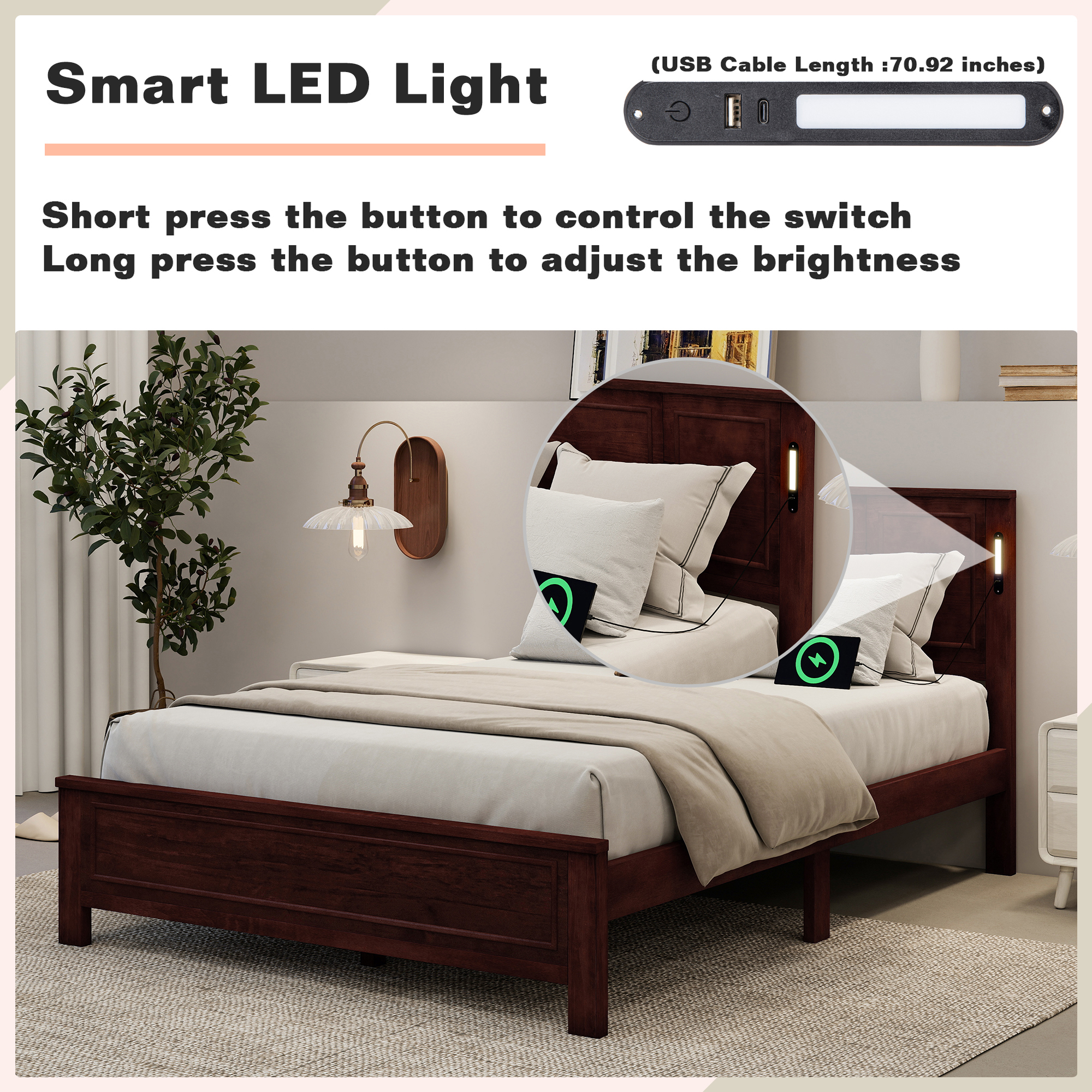 Product Name:Queen Size Bed with Tall-Panel Headboard & Footboard, Built-in LED Lights, USB Charging Station, Pinewood Bed with Strengthened Bed Frame ,Walnut