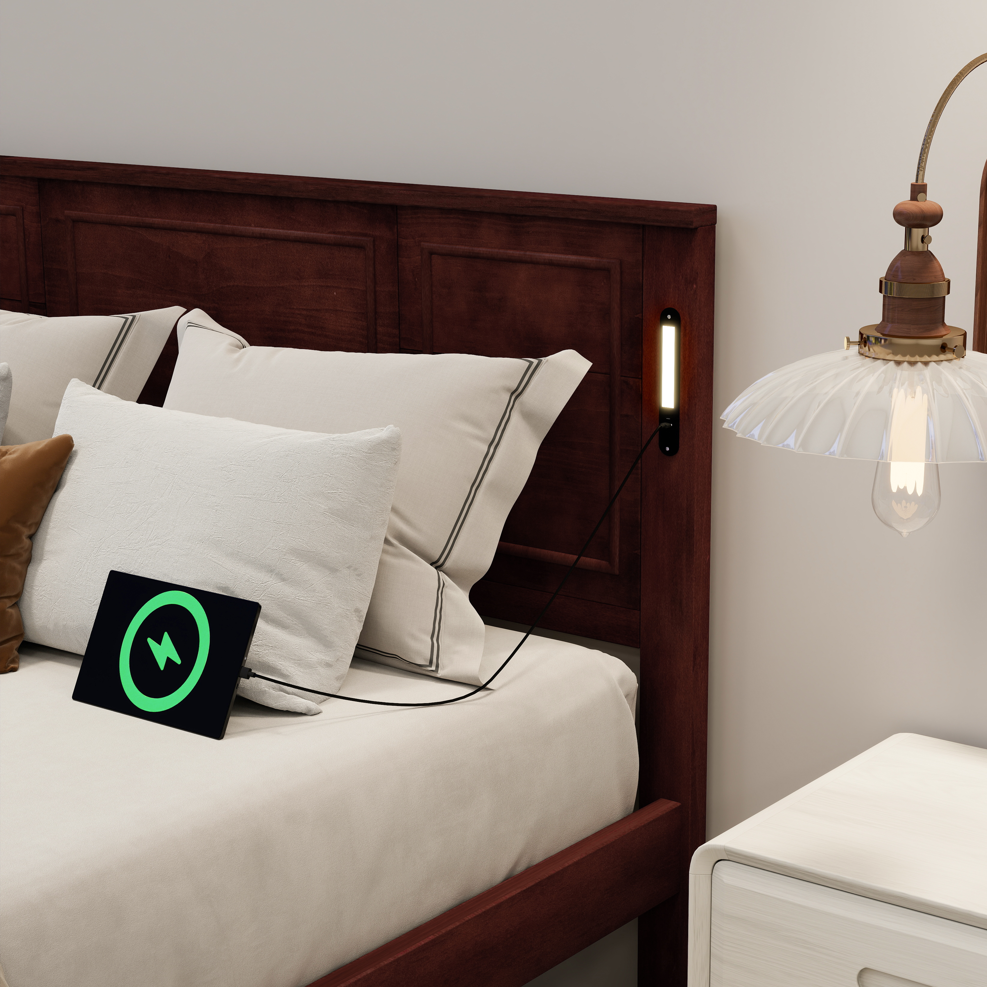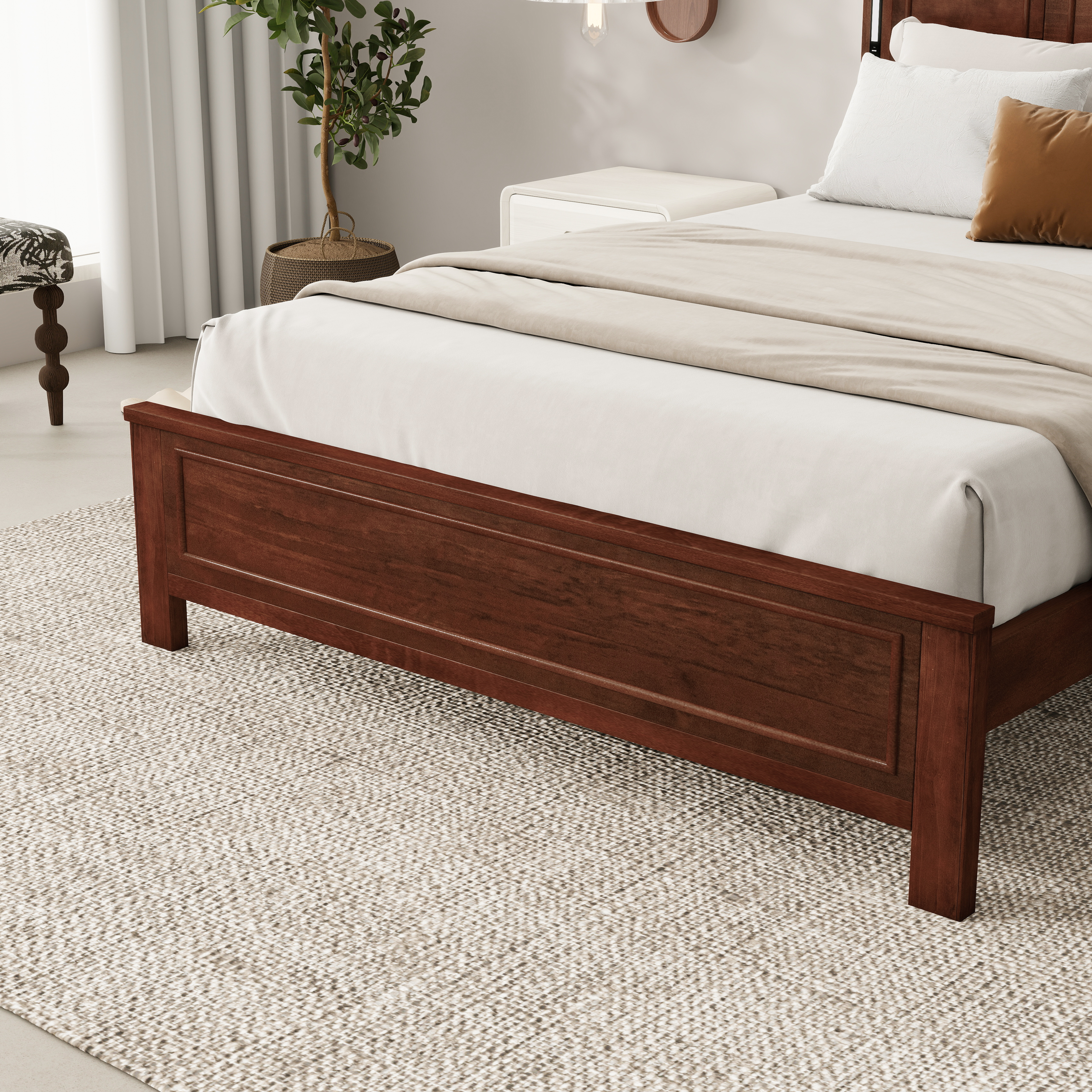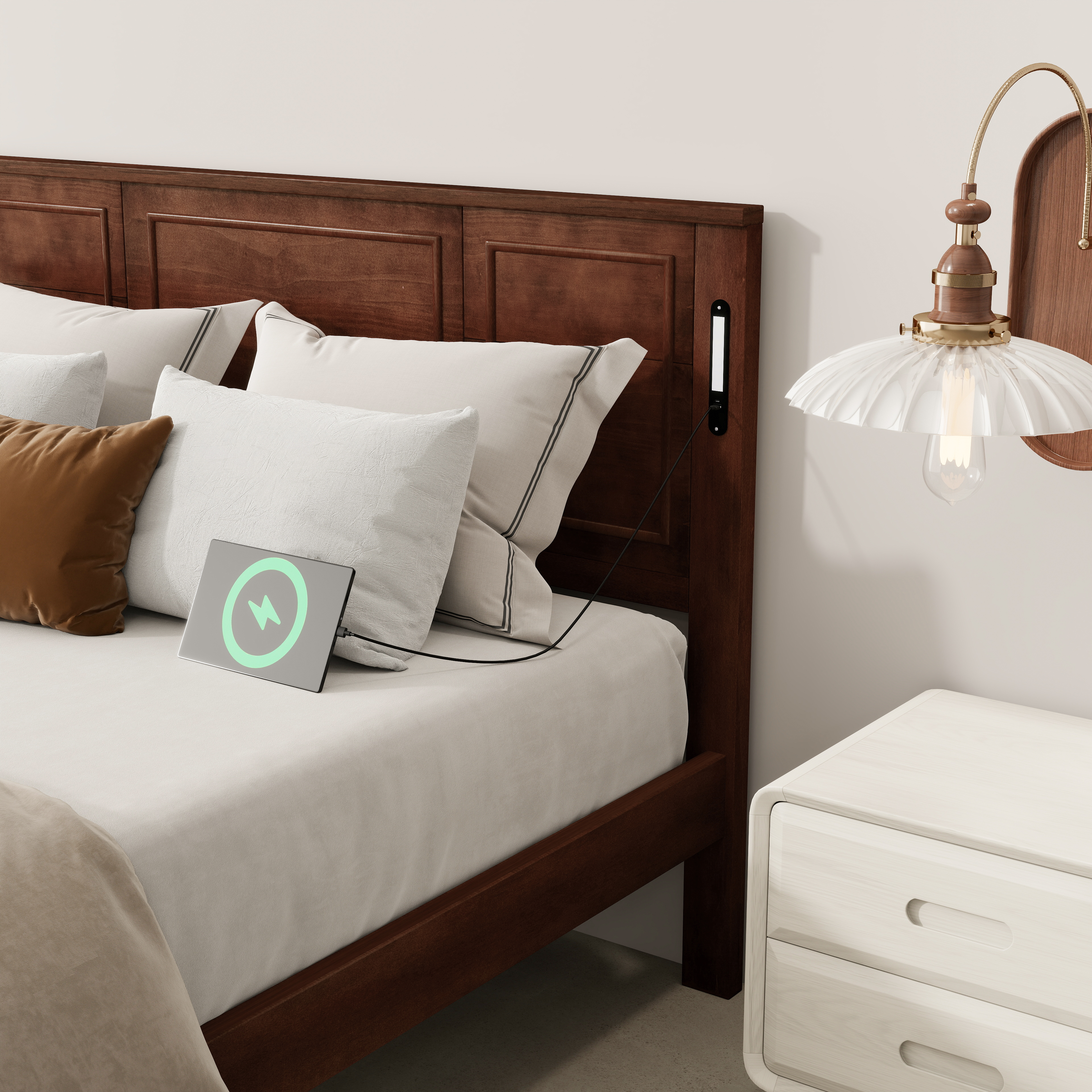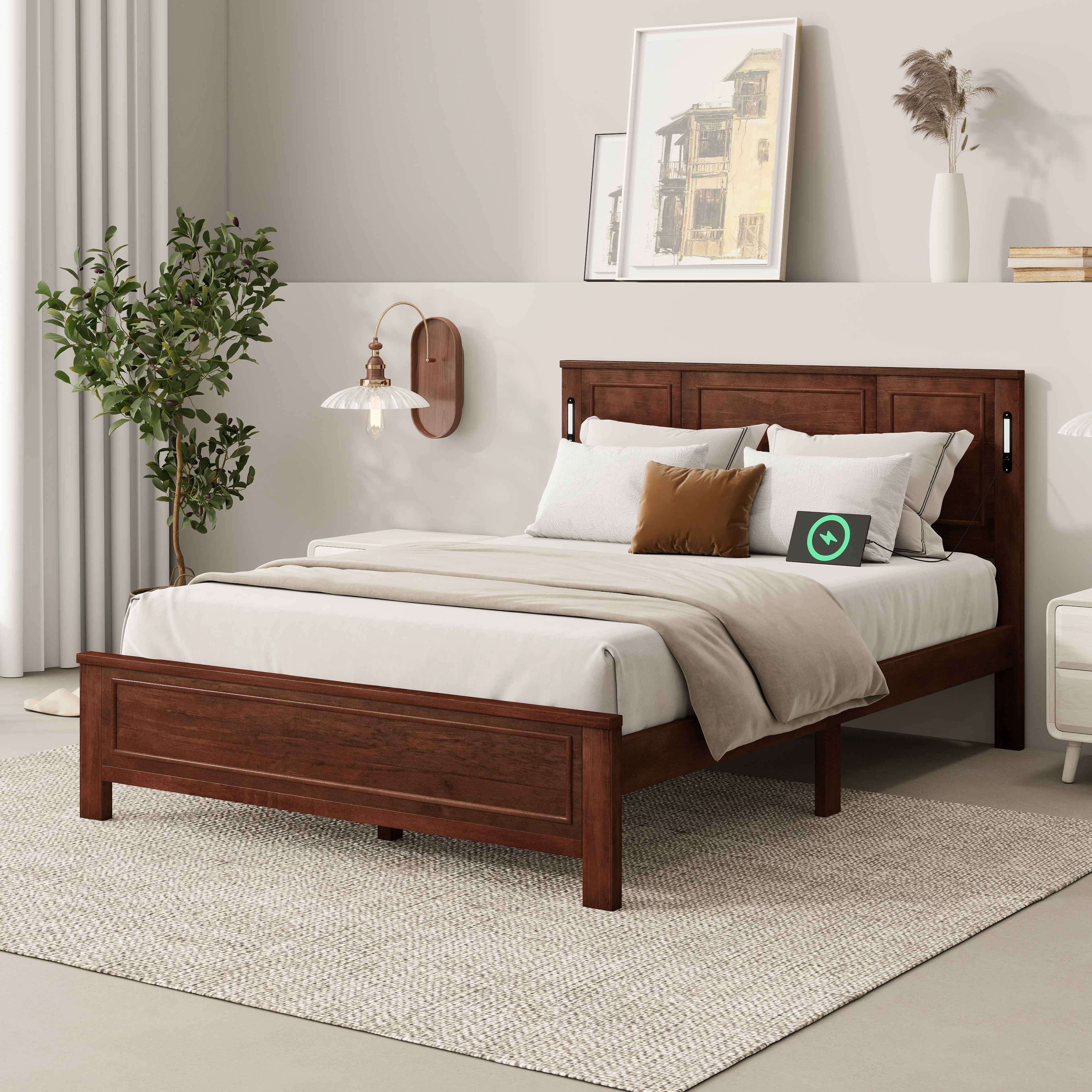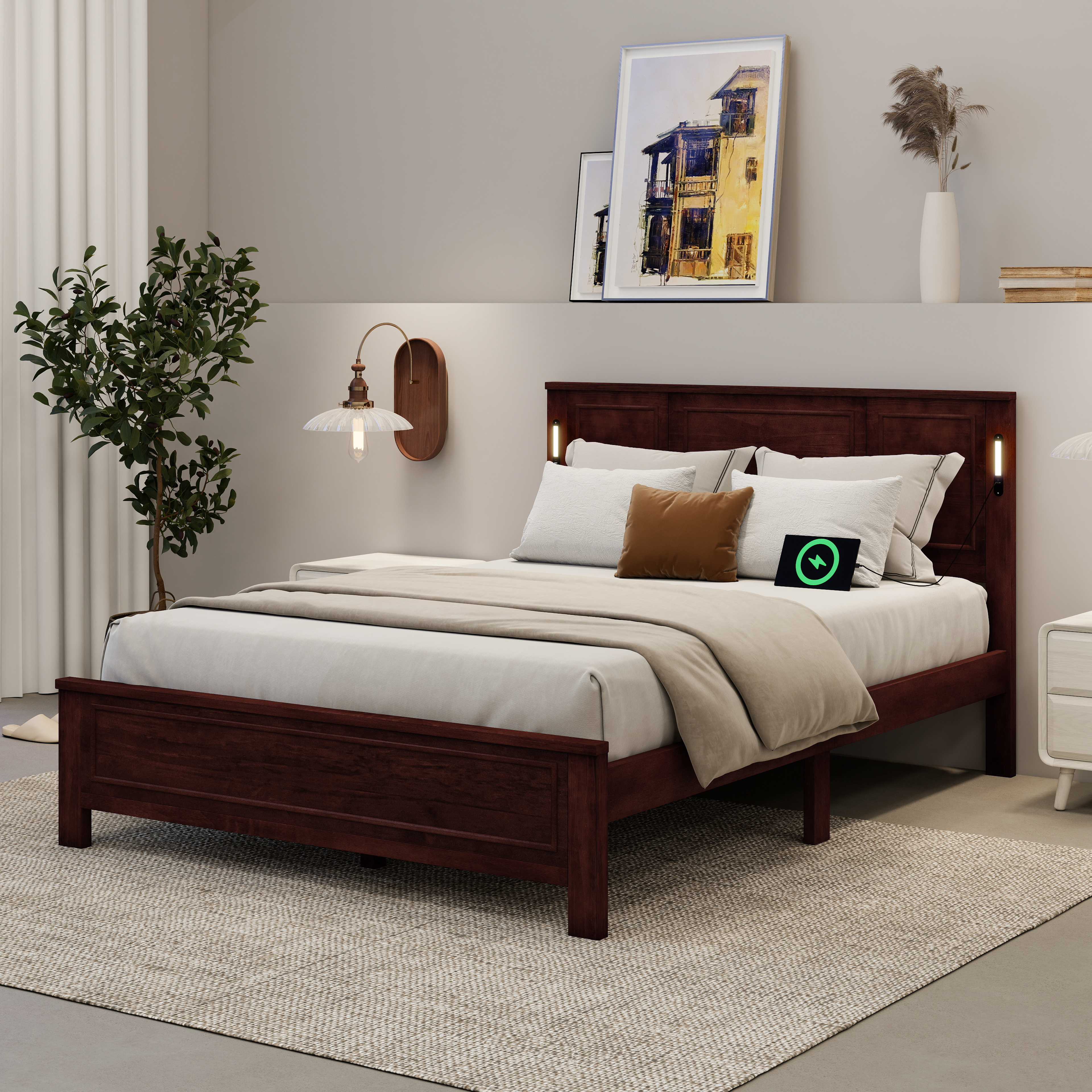 Product Name:Queen Size Bed with Tall-Panel Headboard & Footboard, Built-in LED Lights, USB Charging Station, Pinewood Bed with Strengthened Bed Frame ,Walnut