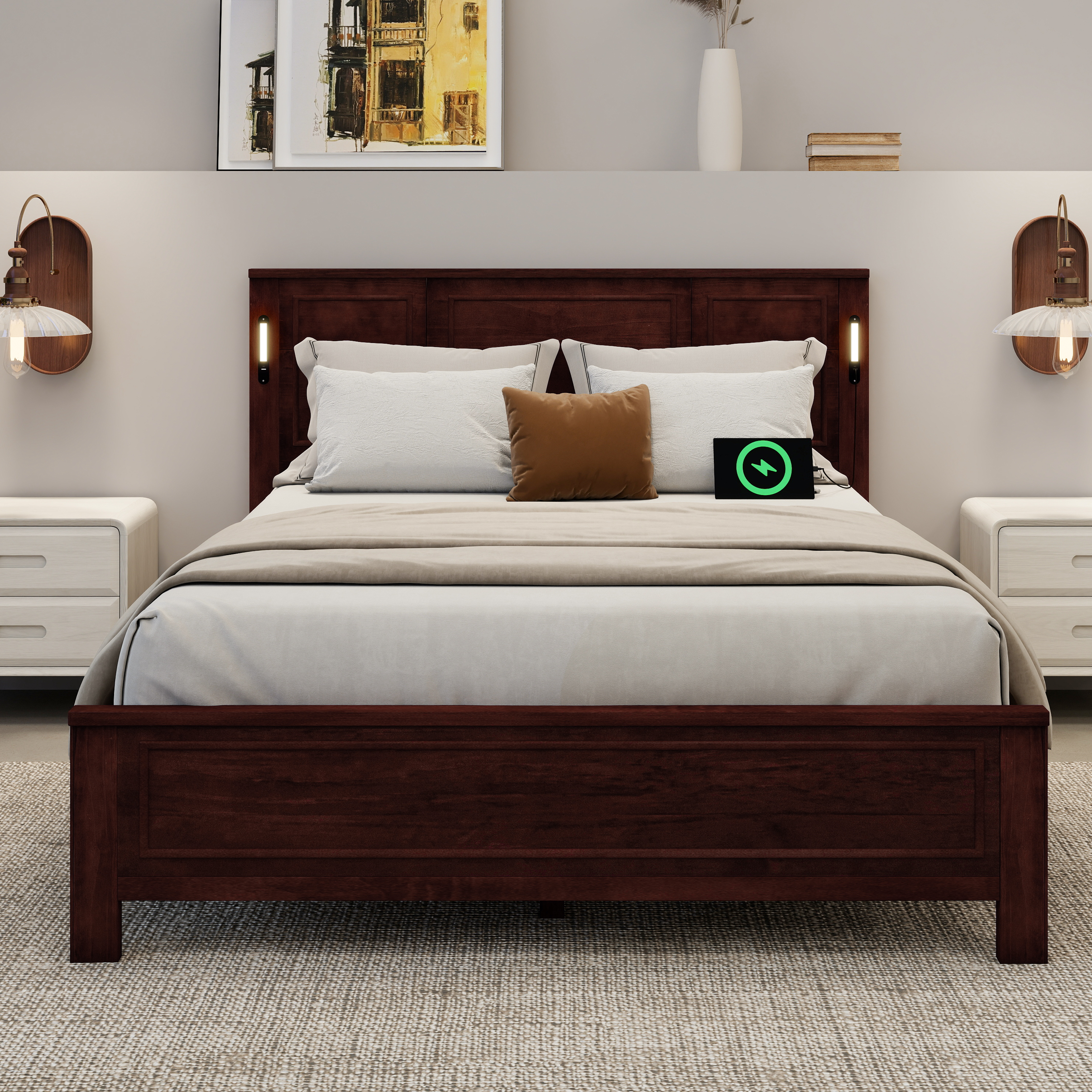 The queen-sized bed enhances your bedroom aesthetic with its paneled headboard and footboard, inspired by countryside farmhouse charm. Its clever design of built-in LED lights and USB charging station creates fun and convenience for additional furniture and decor. Practical and fashionable, this vintage bed becomes any bedroom's focal point.