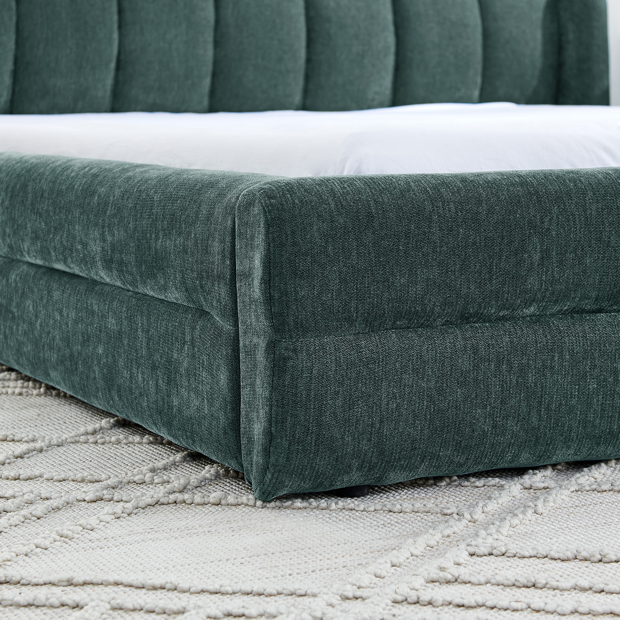 • [Unique Grounded Queen Size Bed] - This grounded upholstered bed will be both a beautiful piece in the room and a place full of fun for your family. This beautiful modern queen bed frame adds a contemporary chic look to your bedroom and is upholstered in thick chenille fabric to add extra comfort.
