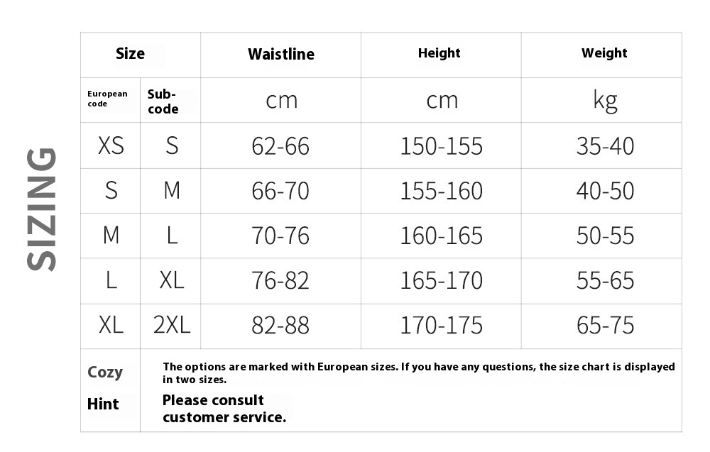 Size: Asian code S/European code XS, Asian code M/European code S, Asian Code L/European code M, Asian code XL/European code L, Asian code 2XL/European code XL