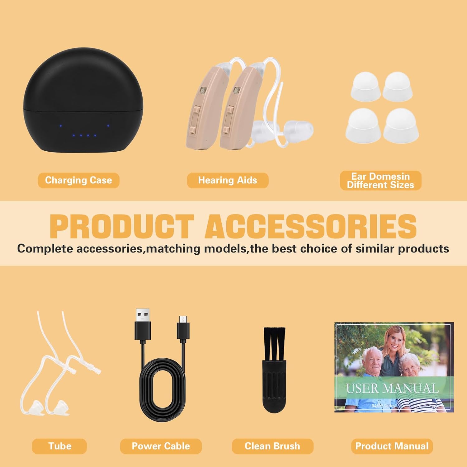 The rechargeable hearing aids for adults is full of sincerity. It is equipped with five sizes of "soft earplugs" to ensure the fit of the ear canal and avoid noise interference. Meanwhile, it also includes the hearing aid main body, multiple sizes of ear domes, wax filters, a convenient charging base, a charger, a USB charging cable, a practical storage box, a durable storage case, a tube, a cleaning brush and a detailed user manual, meeting all your needs in one stop.