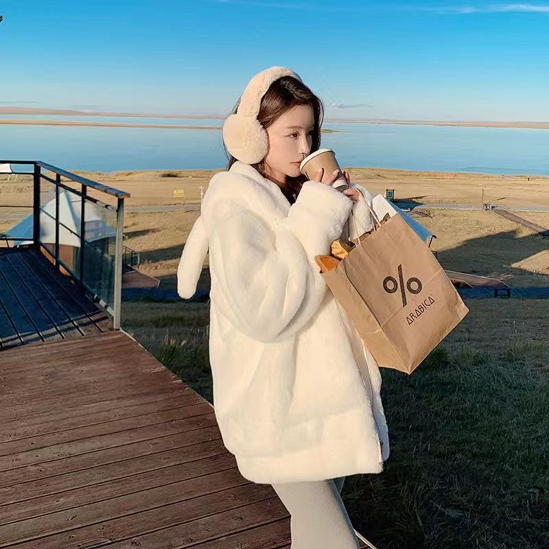 Rabbit Ears Lamb Wool Fleece-lined Thick Zipper Hooded Sweater For Women