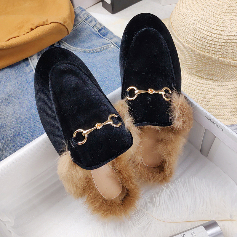 Rabbit Fur Fleece Toe Half Slippers Women All Match Flat Bottom