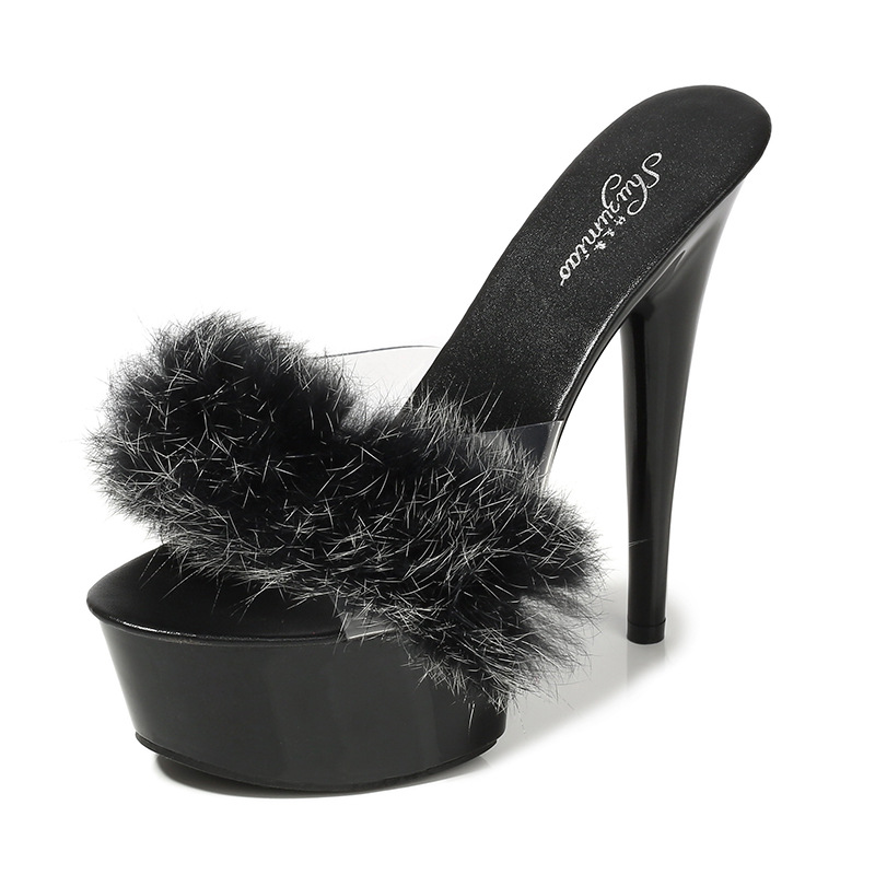 Europe and the United States new drag rabbit hair special high-heeled shoes thin heel sexy black waterproof platform hate day super high-heeled sandals female summer