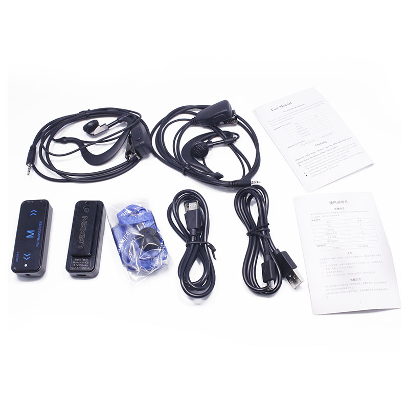 Mini walkie-talkie*2, earphone*2, data cable*1, manual*1, ear strap*2
